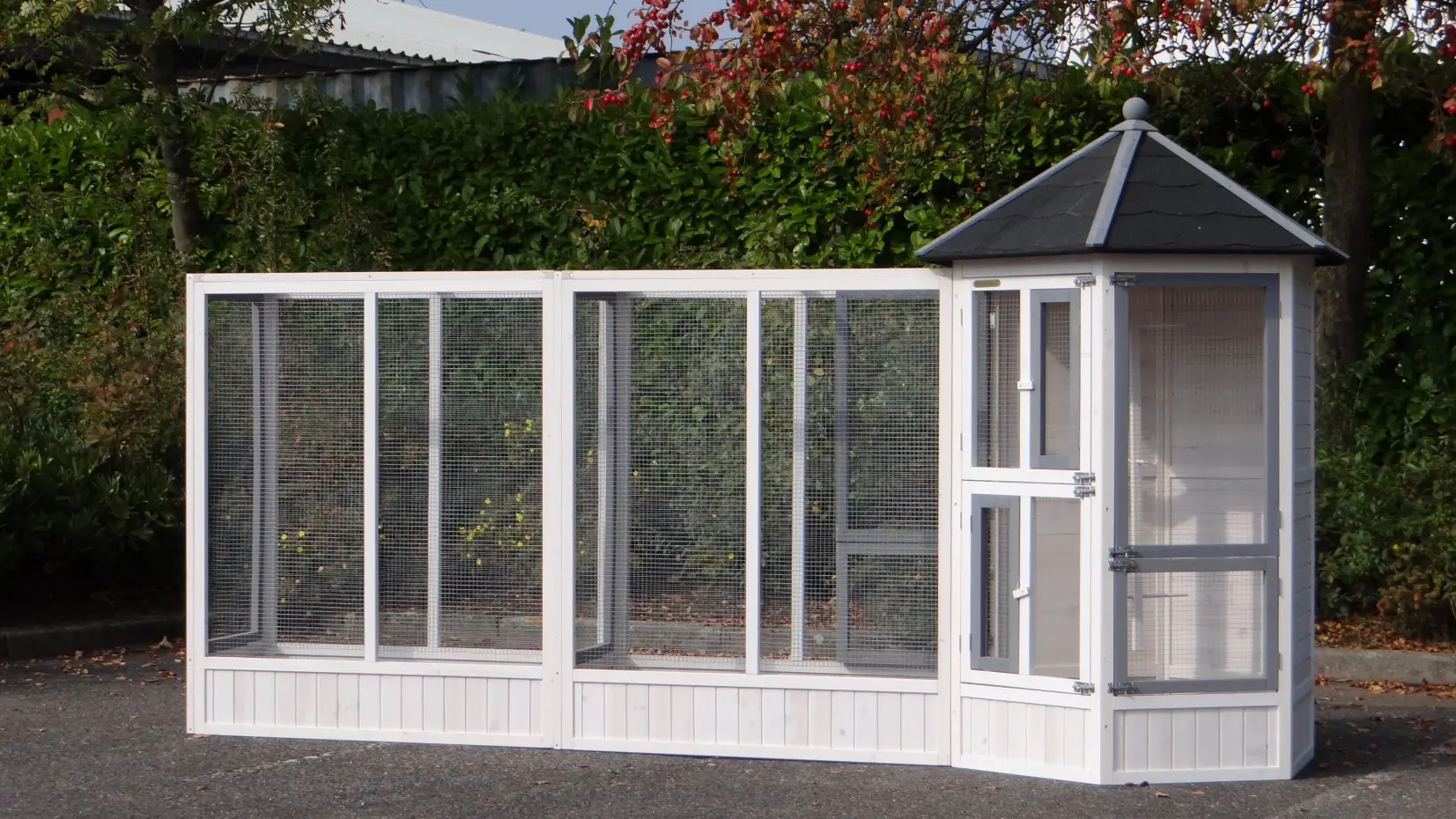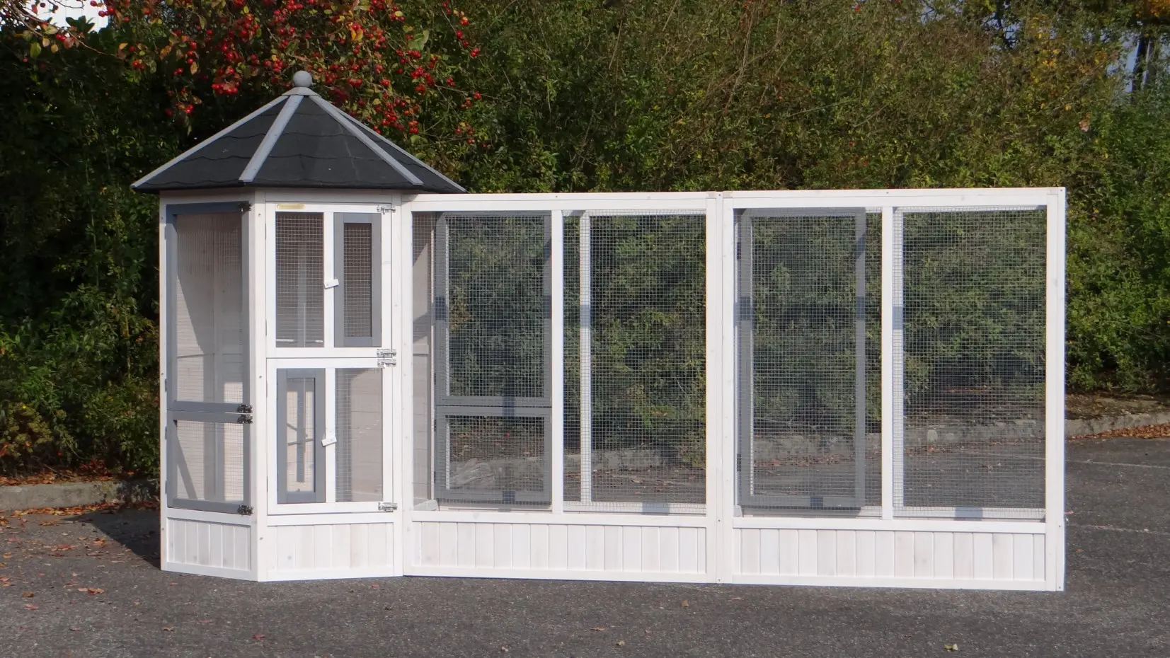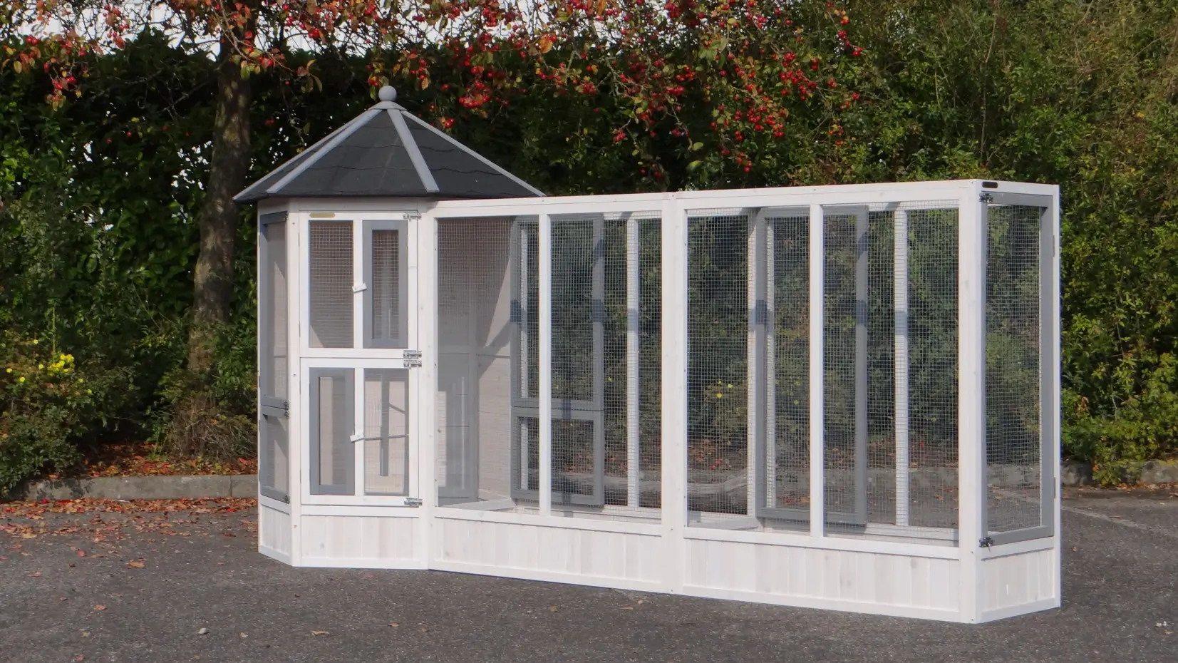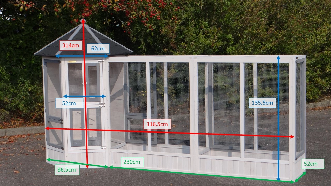 | Outer dimensions including roof (DxH) | Main aviary: 120x187cm |