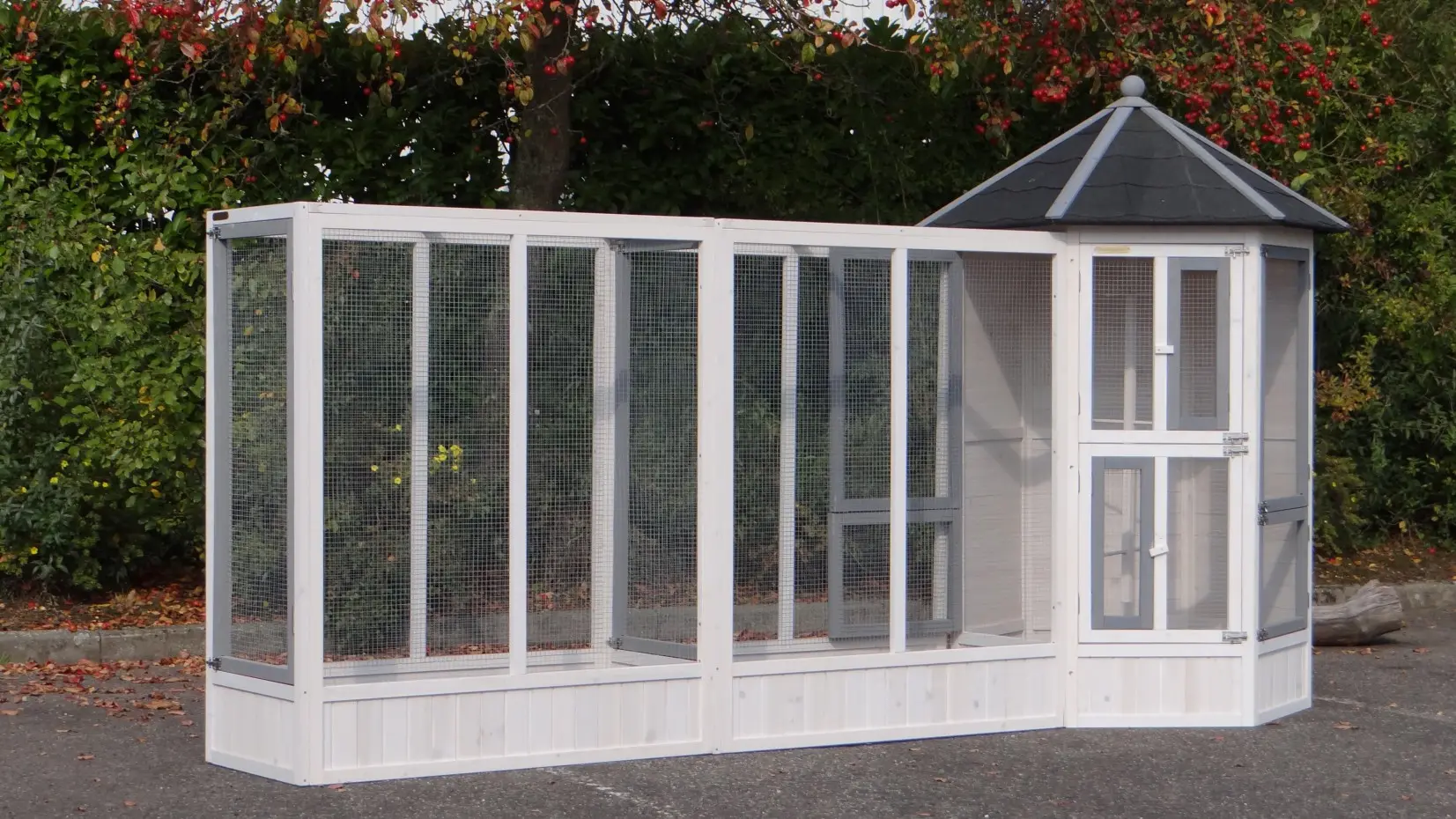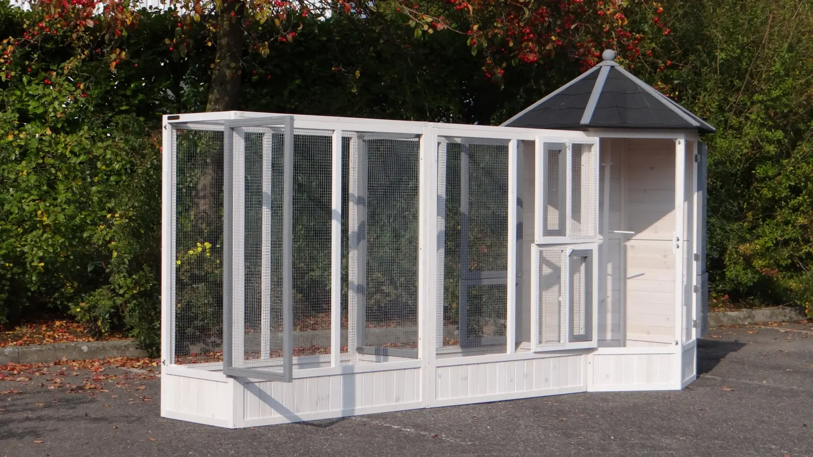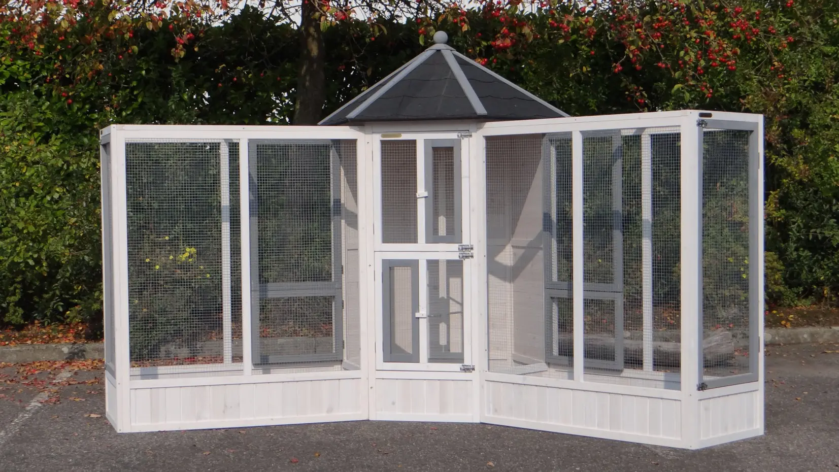 | Outer dimensions including roof (DxH) | Main aviary: 120x187cm |