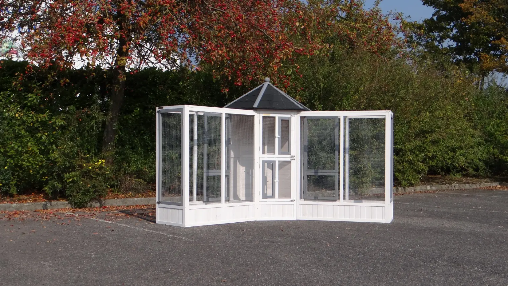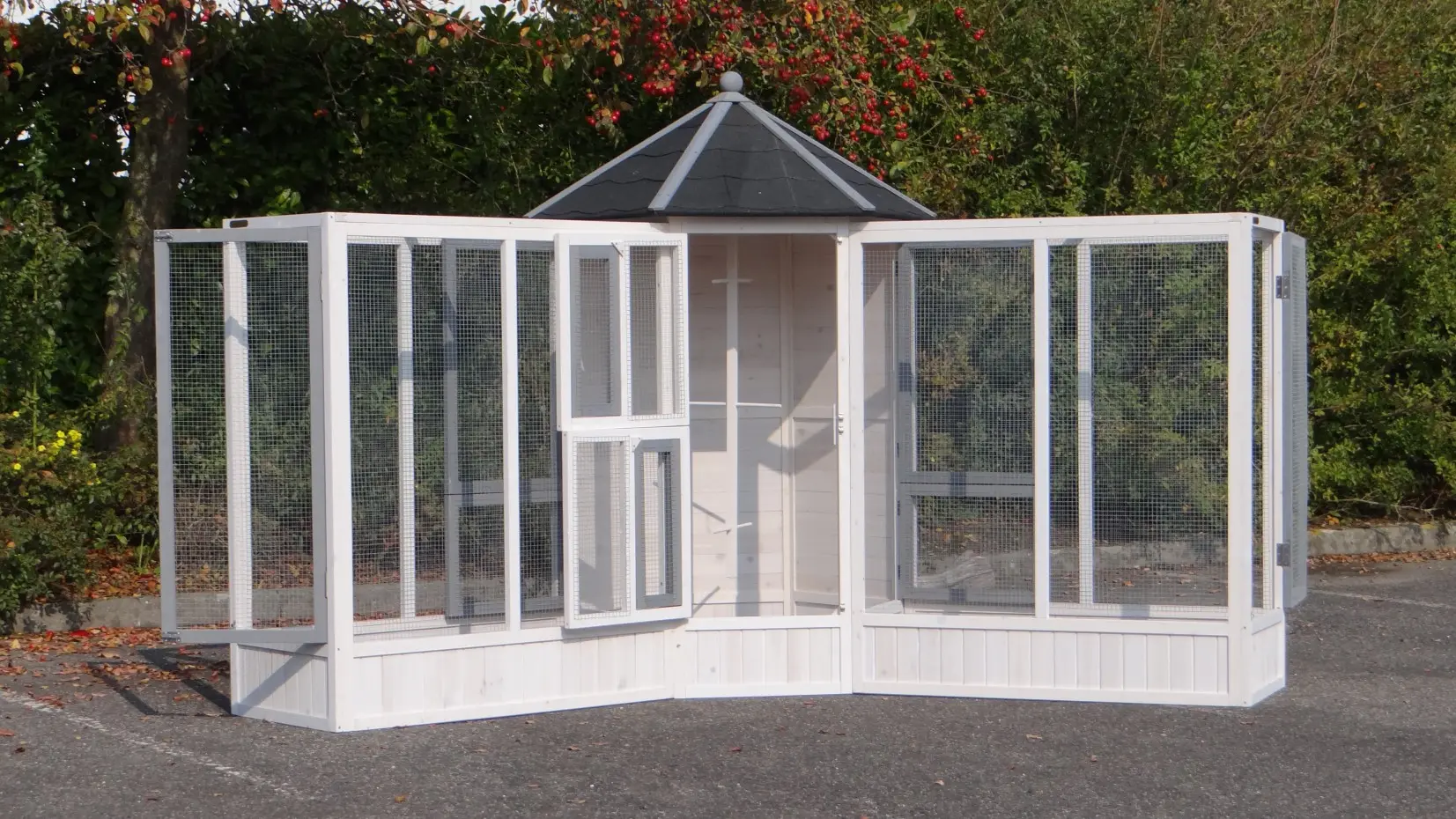 - This aviary is equipped with a rotating feeding system. Therefore the birds can be easily fed