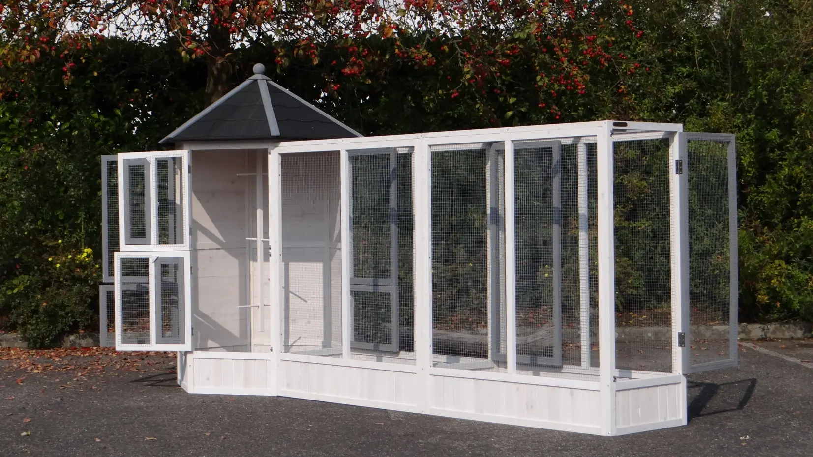 The Hannah aviary is a truly stunning bird enclosure. A luxurious and elegant aviary suitable for housing various species of tropical birds or canaries. It combines the main aviary with two extension runs, creating a beautiful and spacious setup. Equipped with multiple large and small doors, two nesting boxes, and five perches, the Hannah can be endlessly expanded with additional extensions.