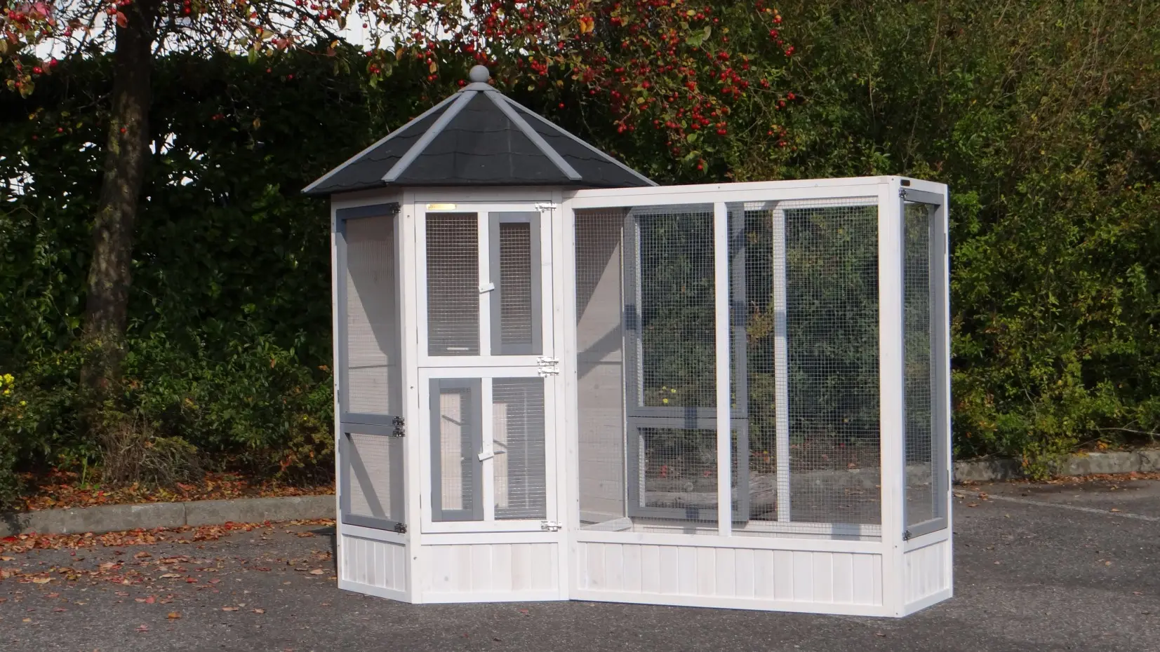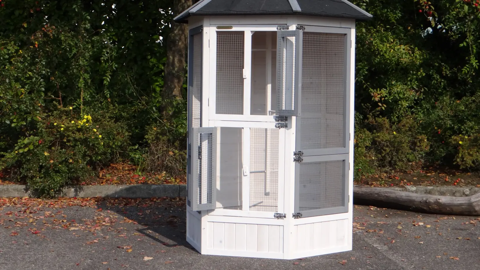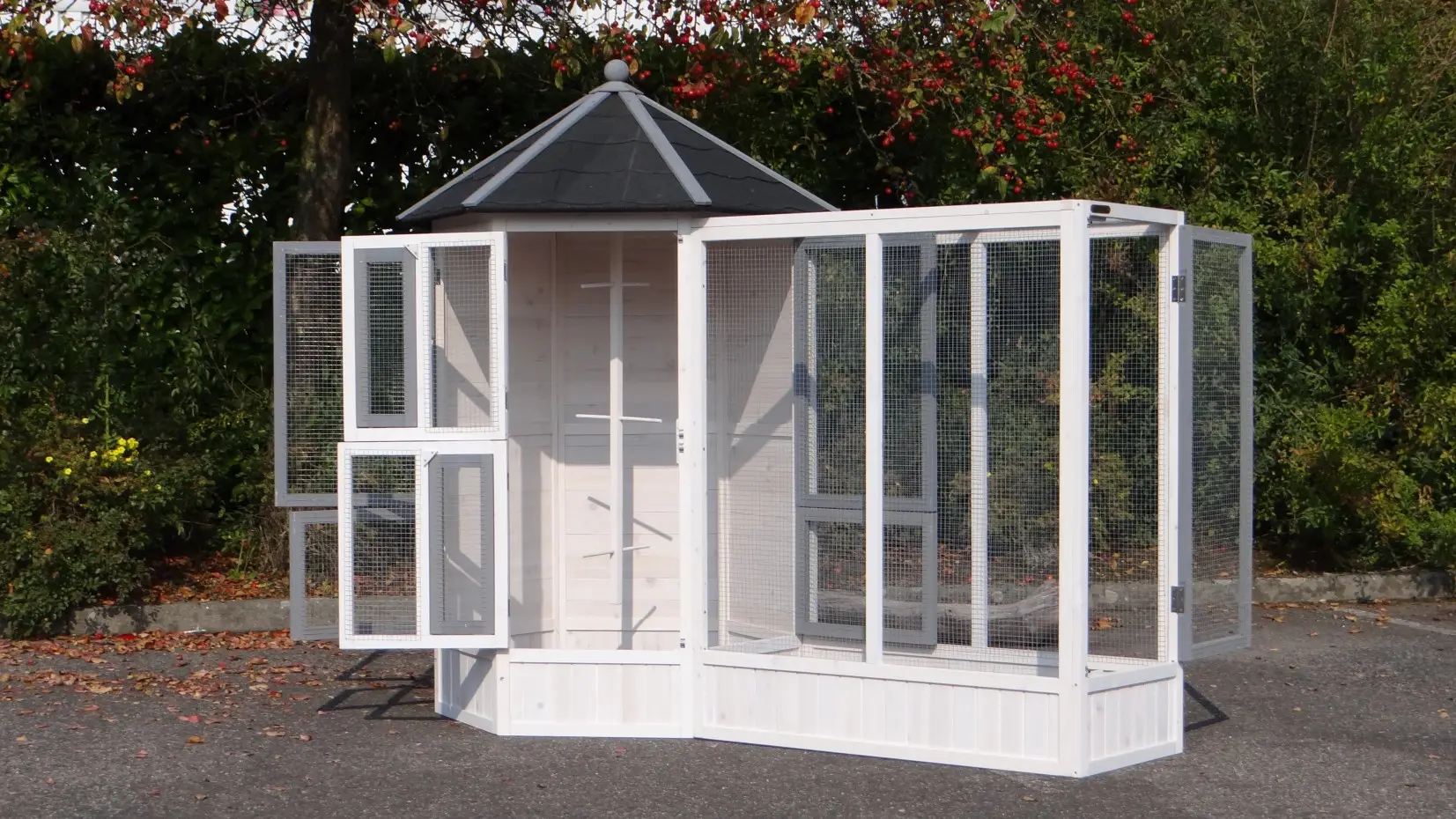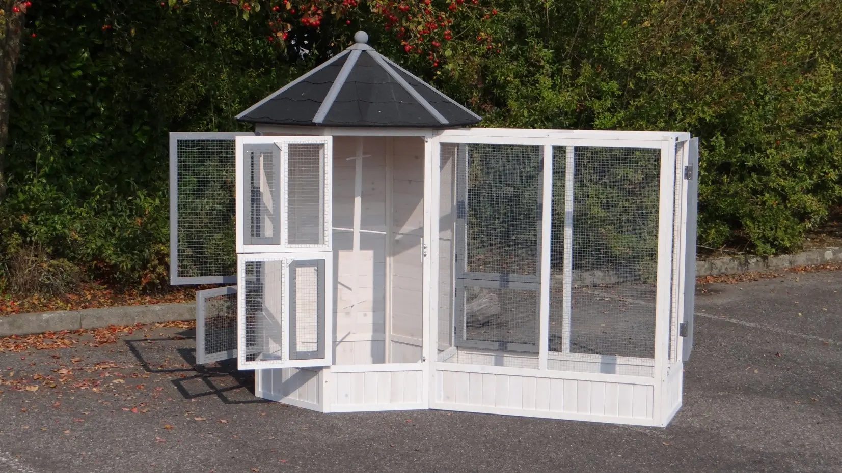 - This aviary is equipped with a rotating feeding system. Therefore the birds can be easily fed