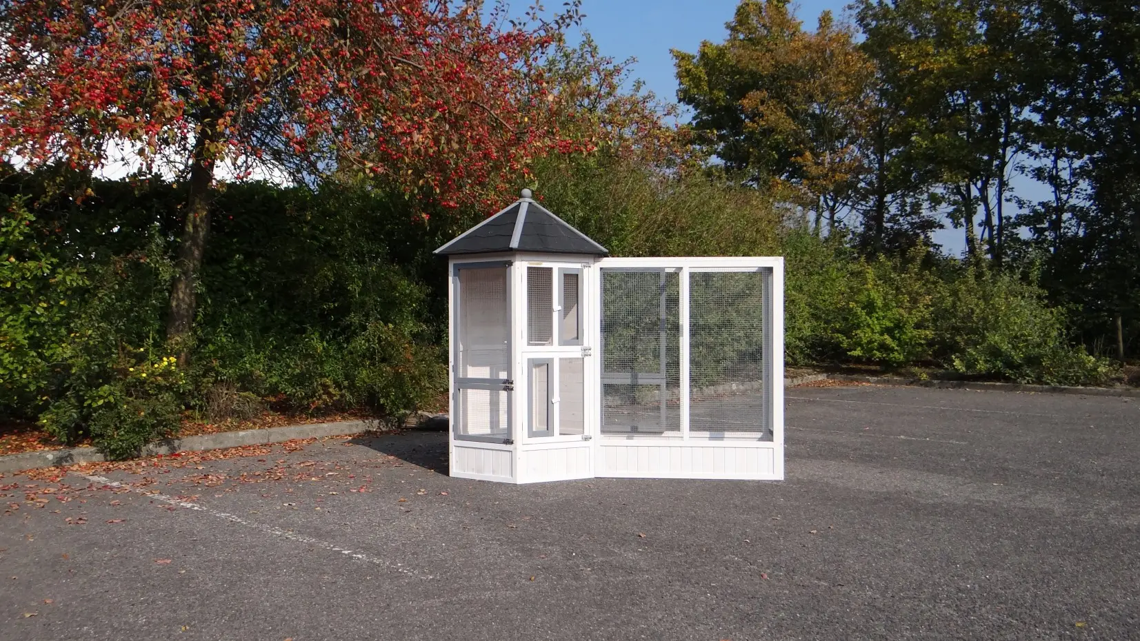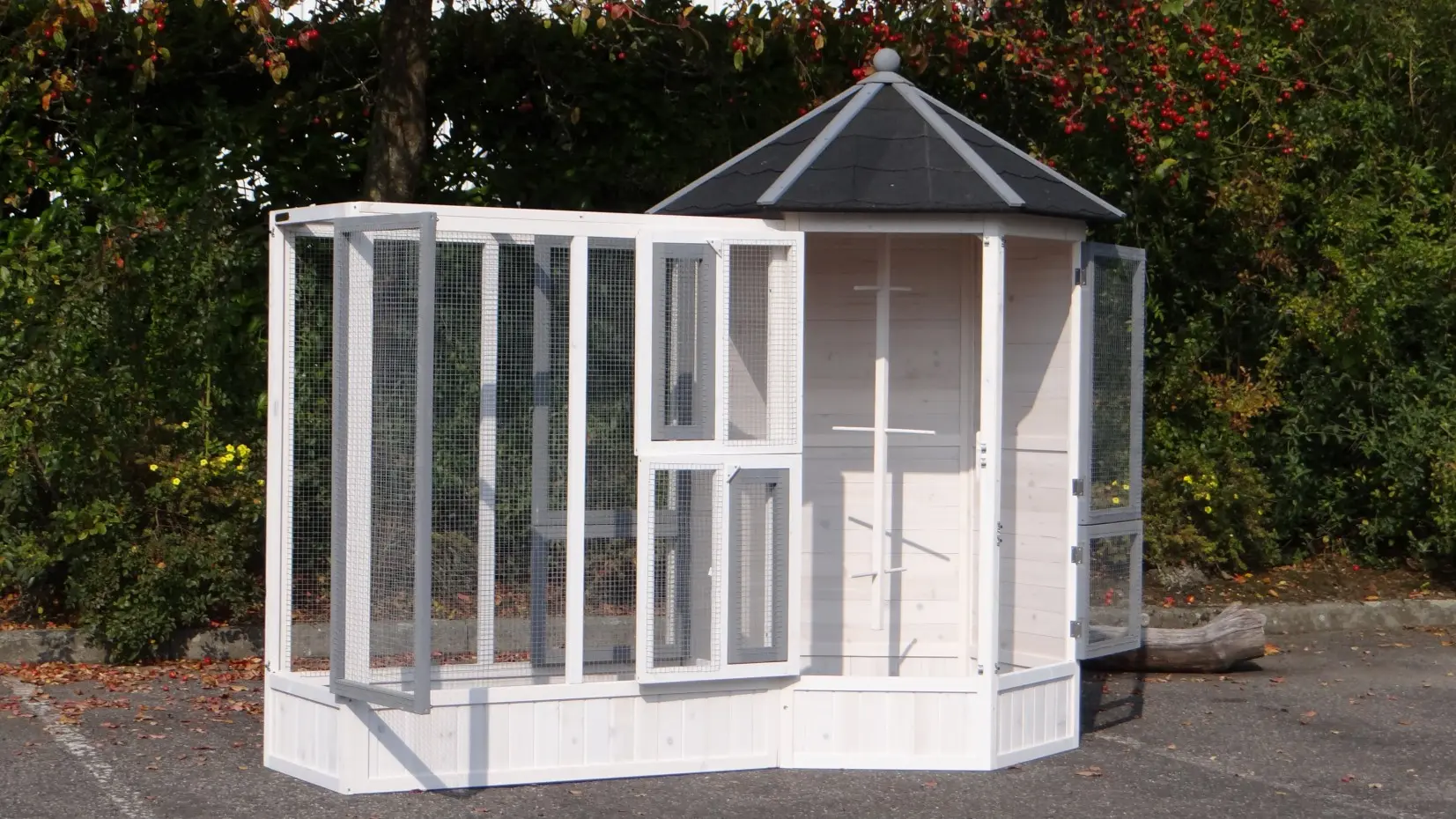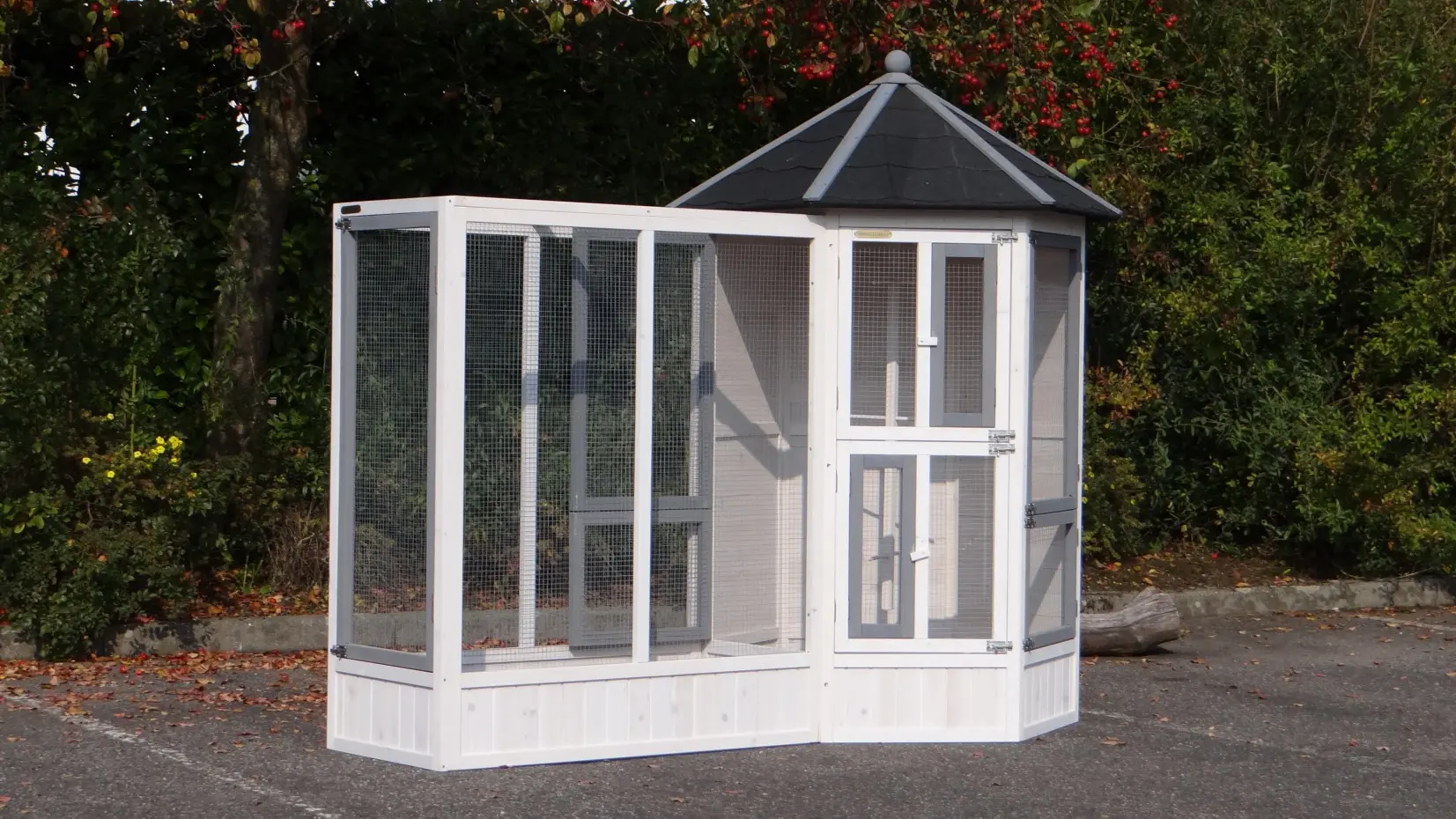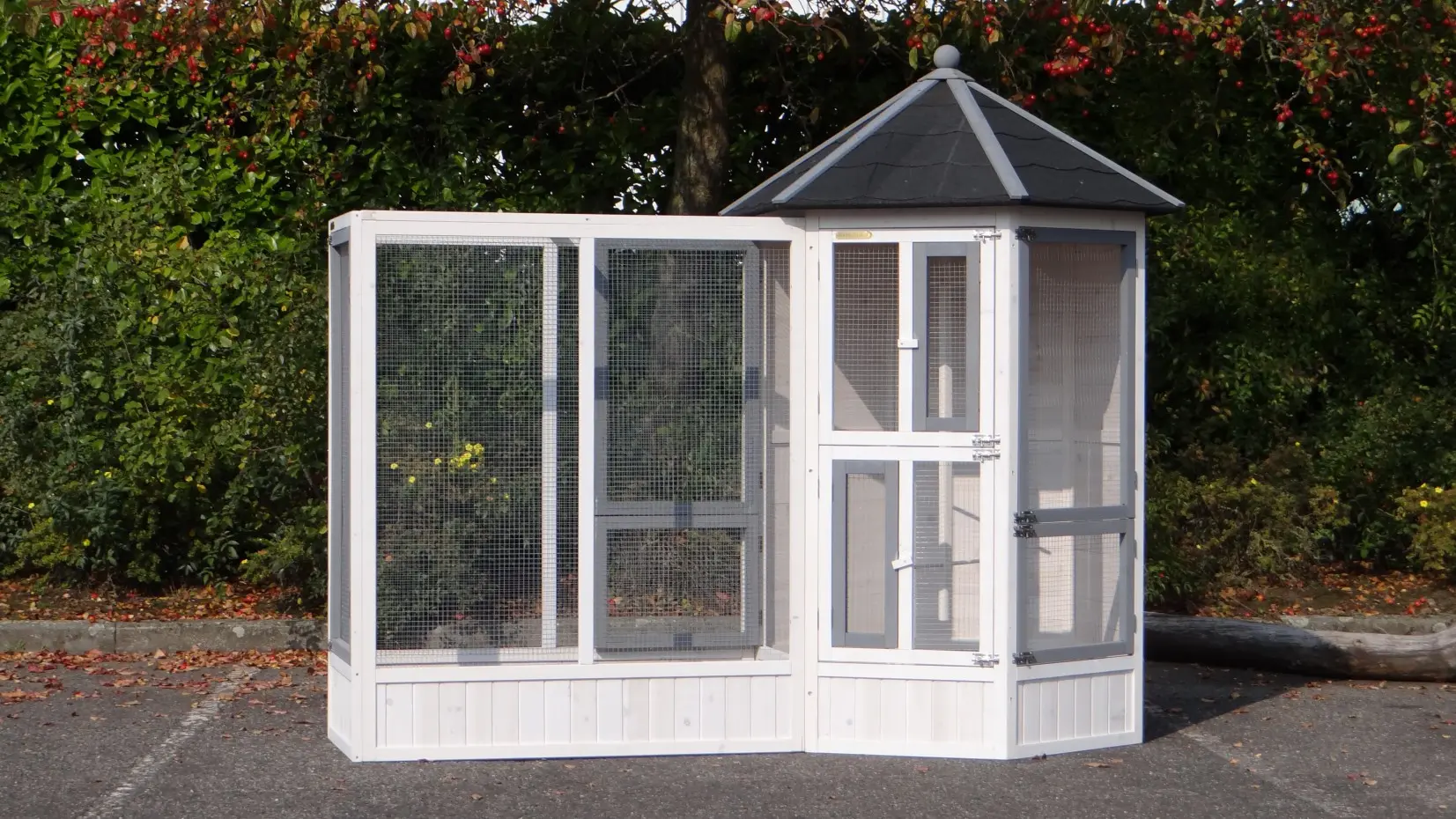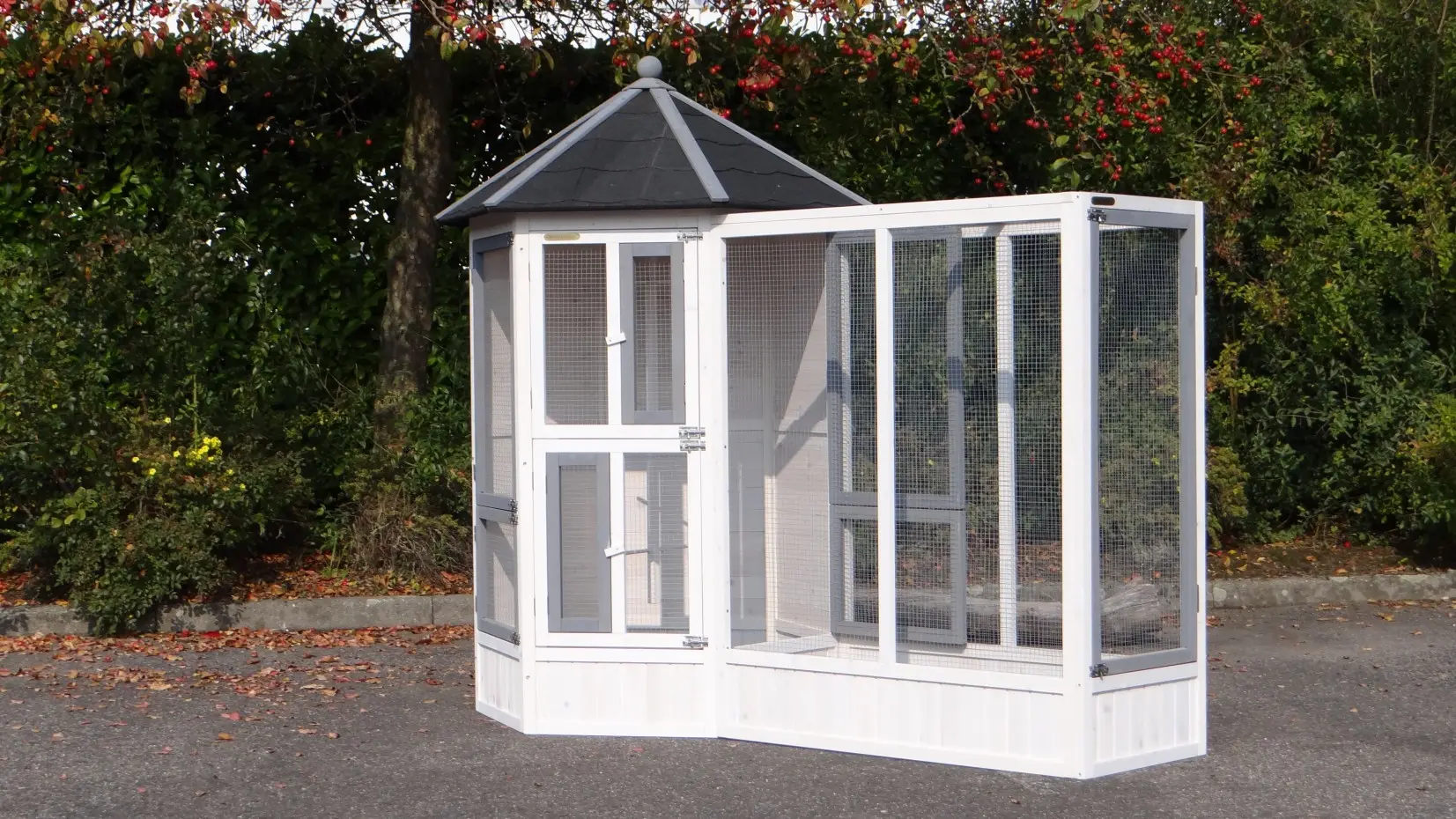 - This aviary is equipped with a rotating feeding system. Therefore the birds can be easily fed