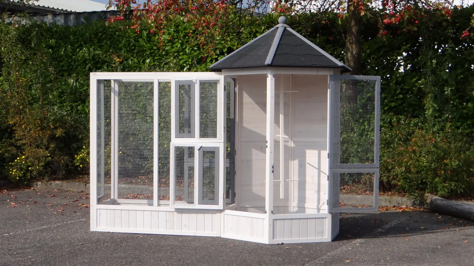 - This aviary is equipped with 6 larger and 2 small practical doors