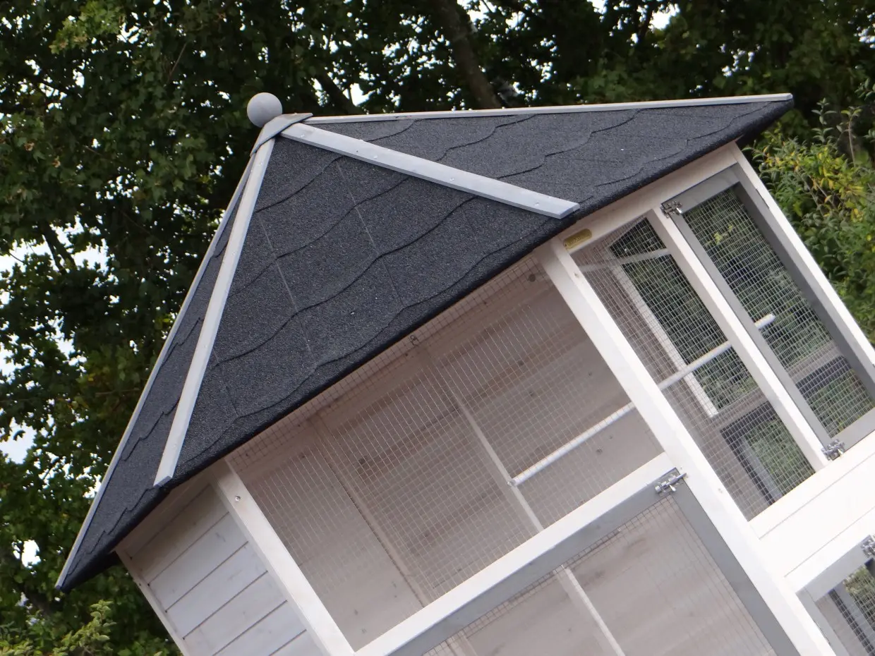 - The roof of this splendid cage is neatly finished with felt roofing with slate