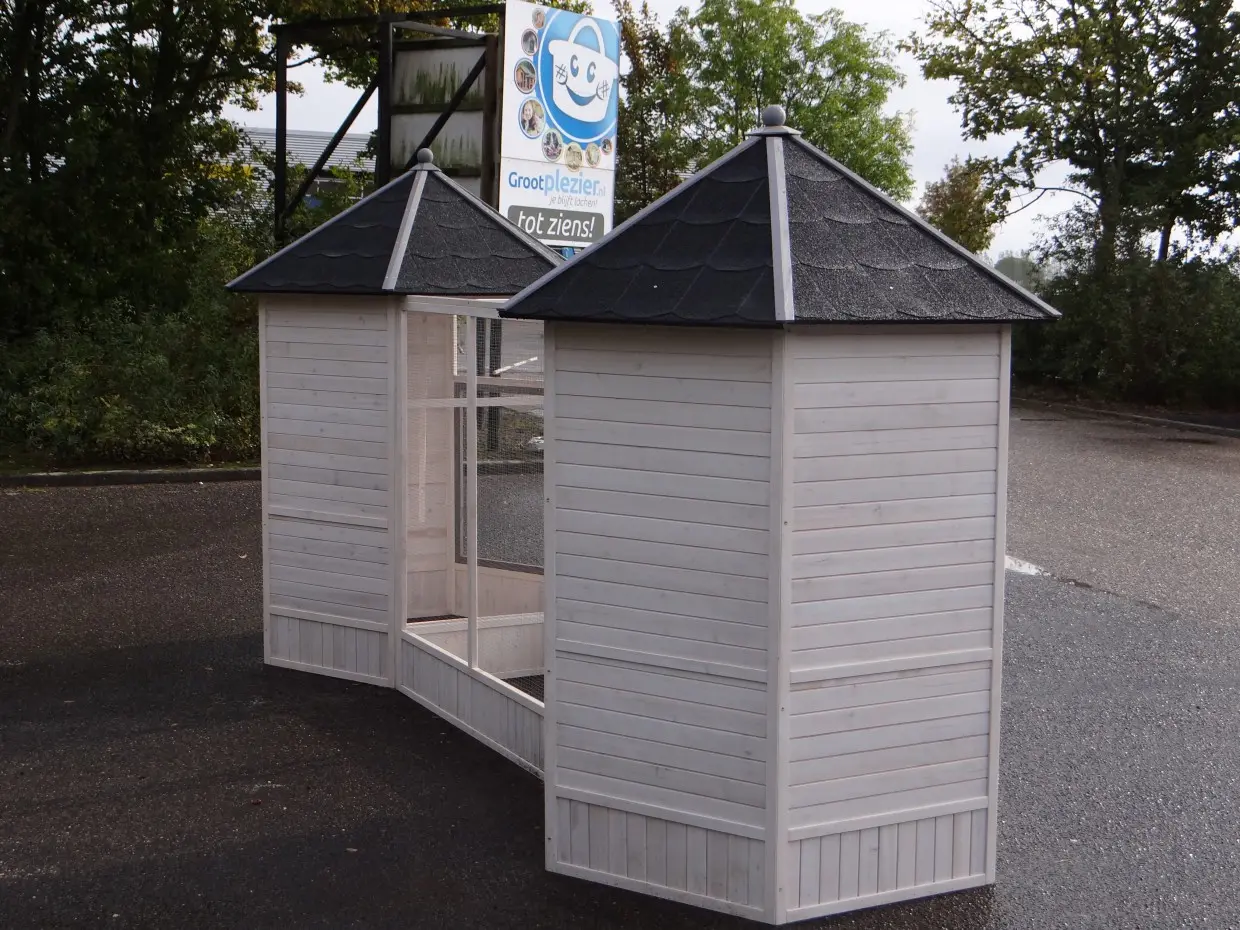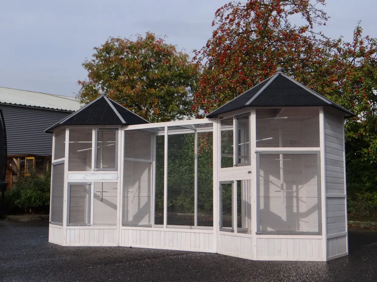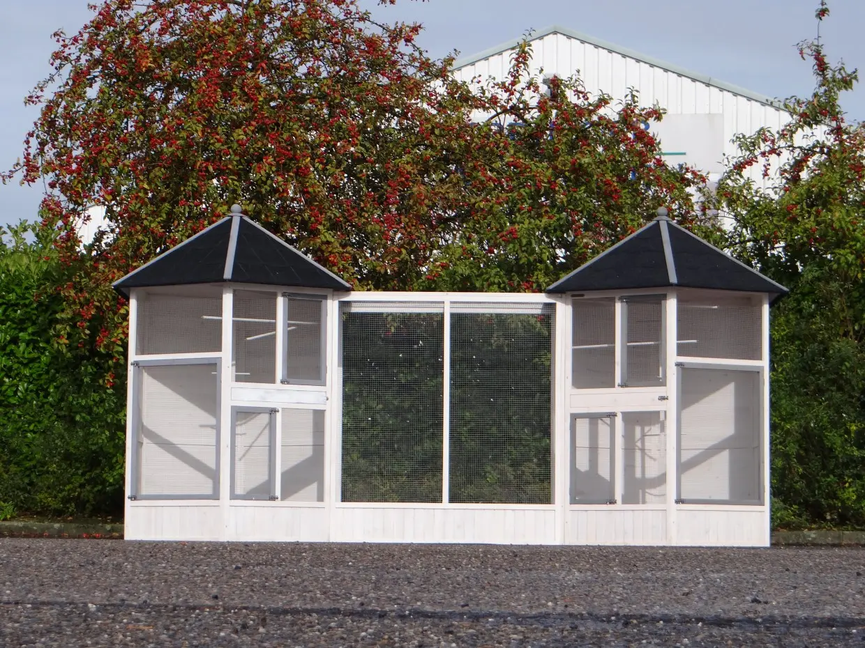 The Evy aviary is a truly stunning setup for your birds. It consists of two aviaries connected by a central flight (extension run), creating a unique and spacious outdoor aviary with plenty of doors. The Evy is a six-sided outdoor aviary featuring four nesting boxes and ten perches in total. It can be endlessly expanded with additional Evy extension runs.