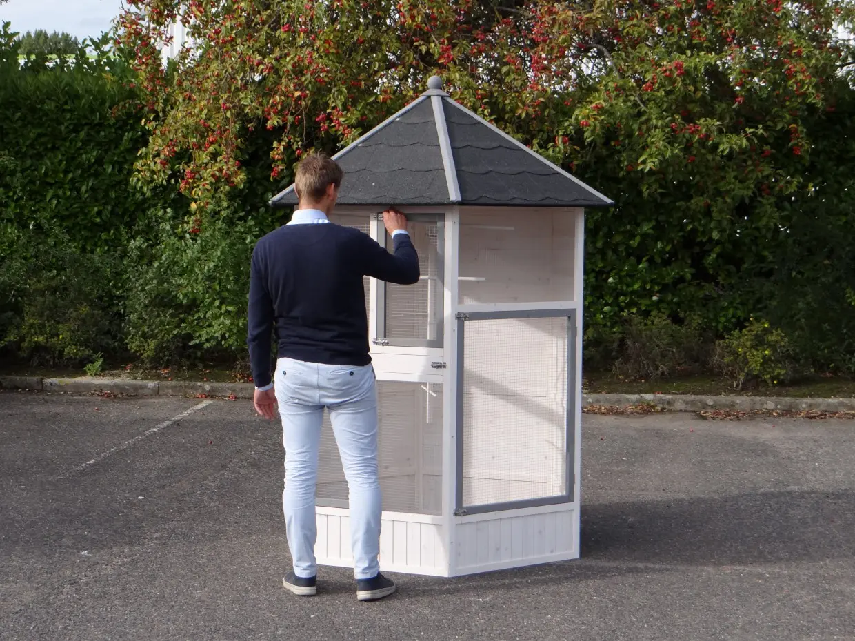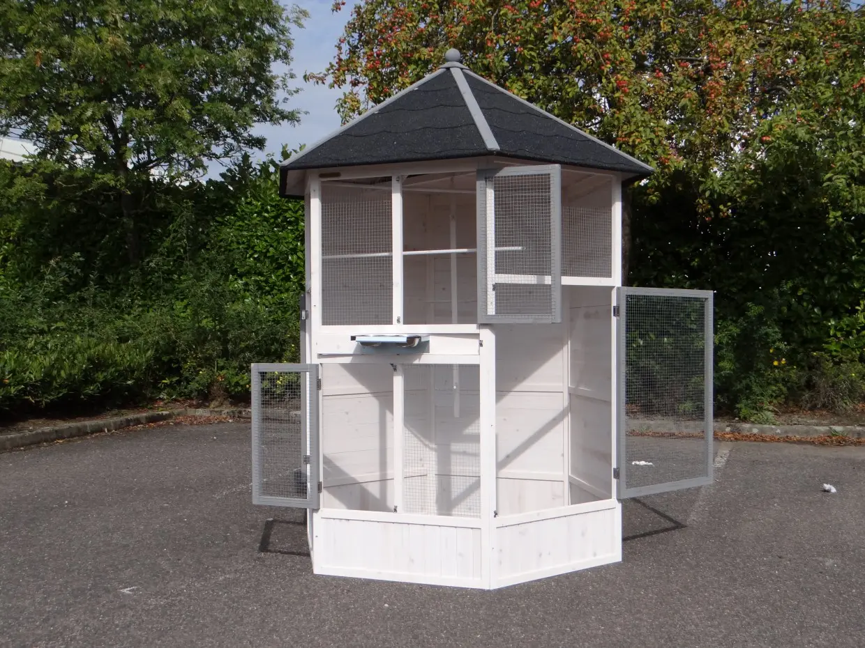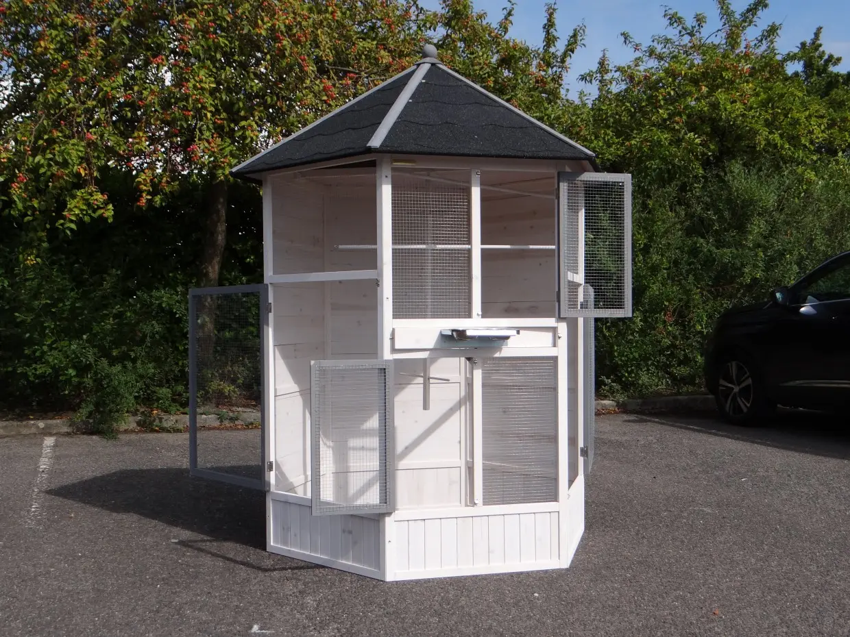 The hexagonal Evy aviary is a beautiful, elegant aviary with a luxurious design. Various types of tropical birds or canaries can be housed in it. This aviary features two large doors and two small, practical doors. At the top, there are two nesting boxes, and it also includes five perches. Thanks to its hexagonal shape, the Evy is a very attractive aviary.