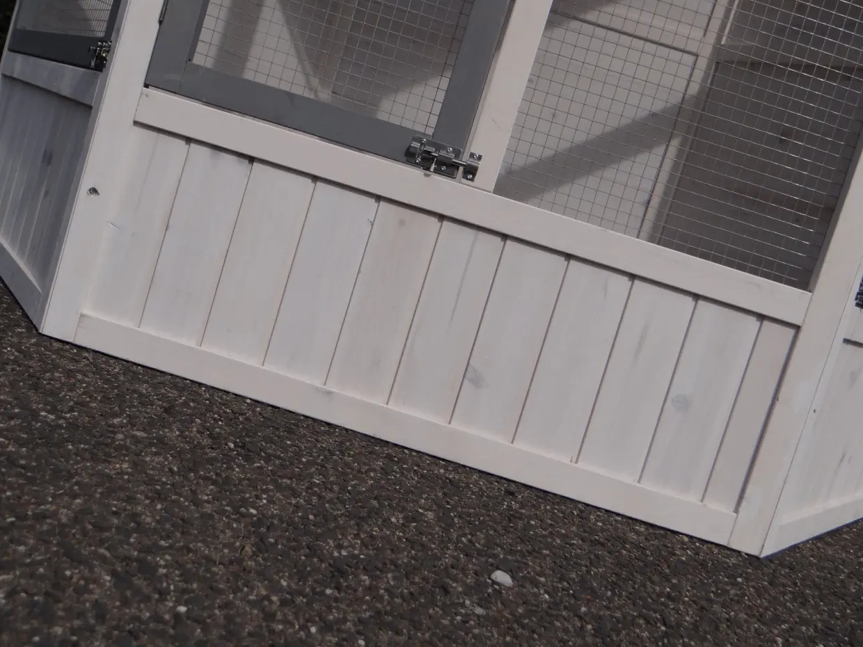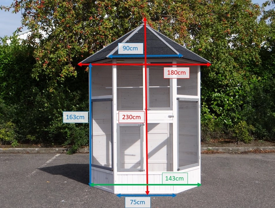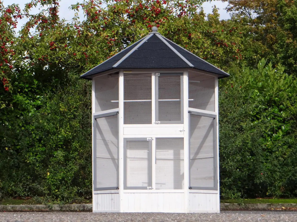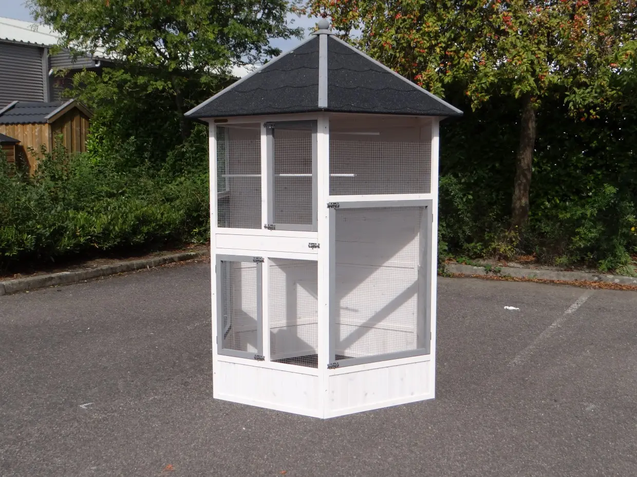 The hexagonal Evy aviary is a beautiful, elegant aviary with a luxurious design. Various types of tropical birds or canaries can be housed in it. This aviary features two large doors and two small, practical doors. At the top, there are two nesting boxes, and it also includes five perches. Thanks to its hexagonal shape, the Evy is a very attractive aviary.