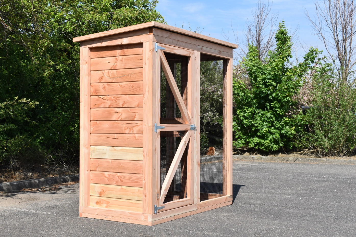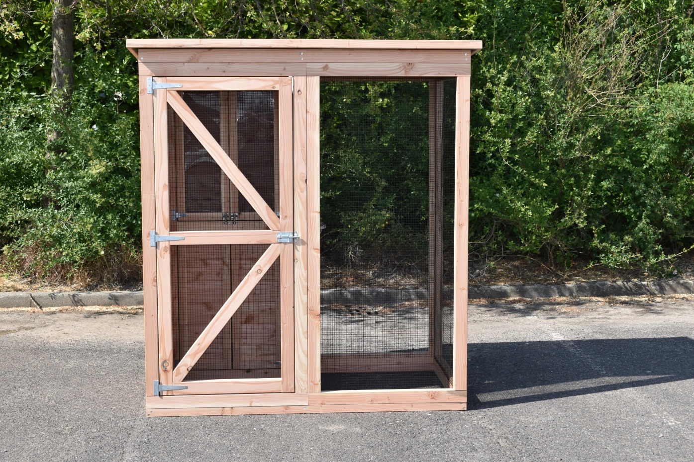 Aviary Flex 2.1 is a beautiful aviary for outside with many practical details. The aviary is provided with a safety porch, so that you can reach the birds, with less chance that they could escape. The sleeping compartment is provided with 2 doors. The round fly hole is lockable. The aviary has a storage room, perches and a form plywood roof. The Flex is a beautiful aviary, which you can adapt to your own wishes!