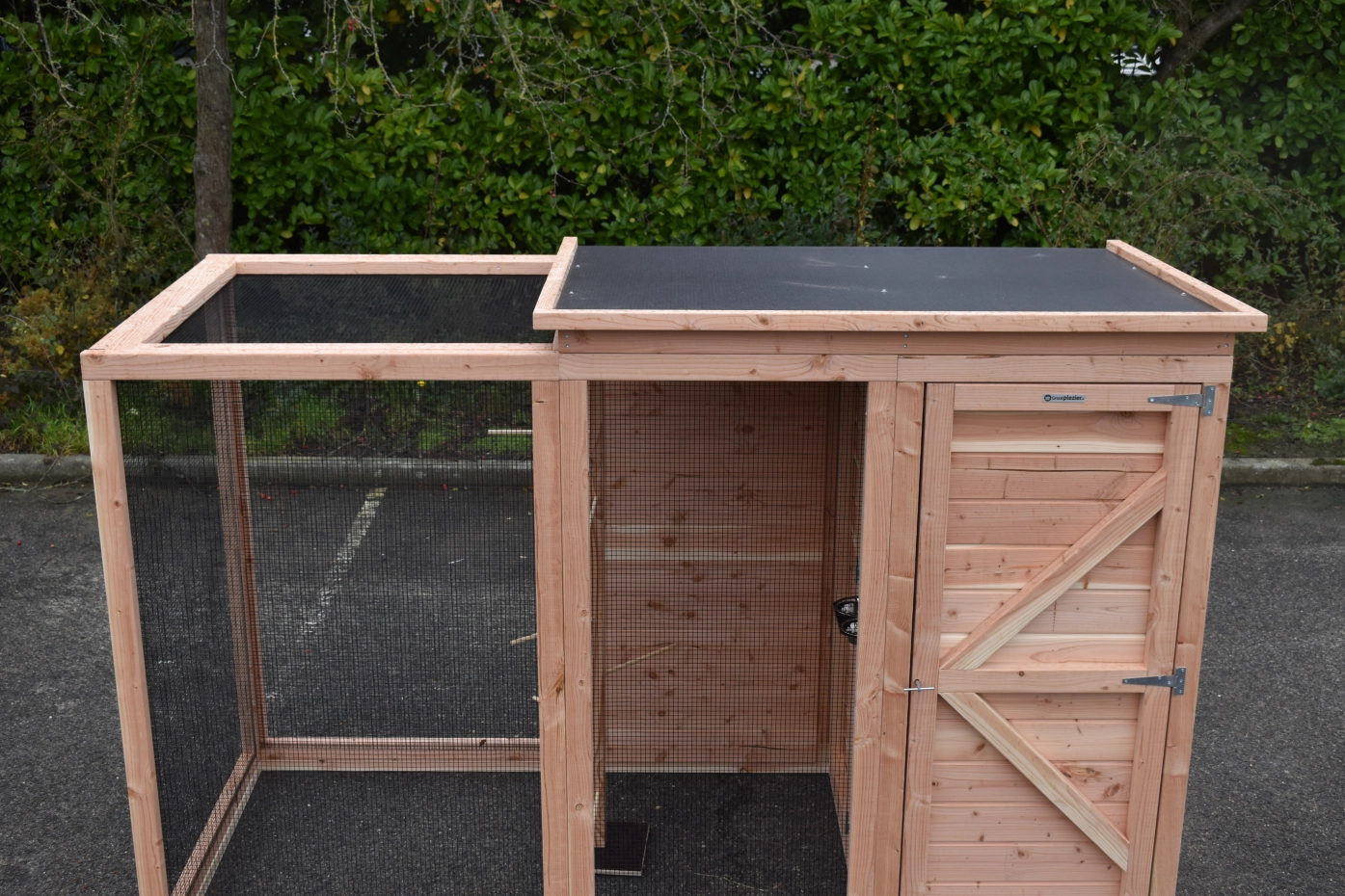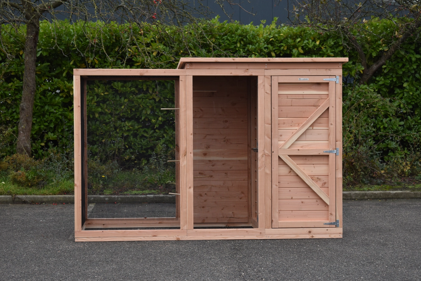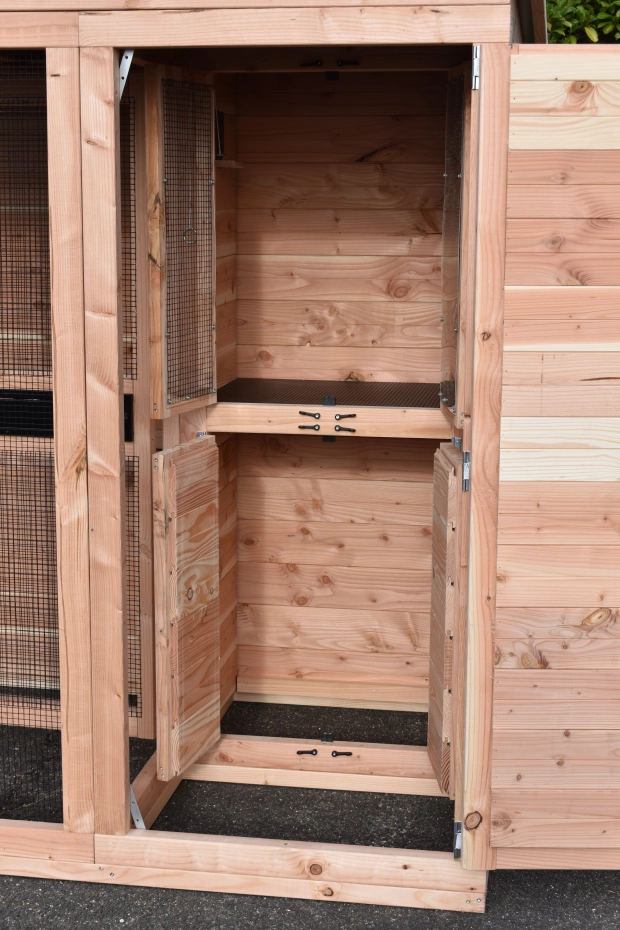 Volière Flex 3+.1+ is a compact outdoor aviary with surprisingly many beautiful details. This aviary is equipped with an entrance sluice, so you can access the birds without them being able to escape. The light sleeping house is equipped with 2 doors. The round opening from the sleeping house to the flight (run) is closable. Furthermore, the aviary has a storage area with 2 doors and a luxuriously finished roof. The Flex is a beautiful bird aviary, designed at the request of professional bird enthusiasts. Perches can be ordered separately.