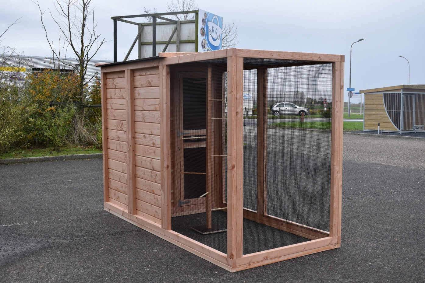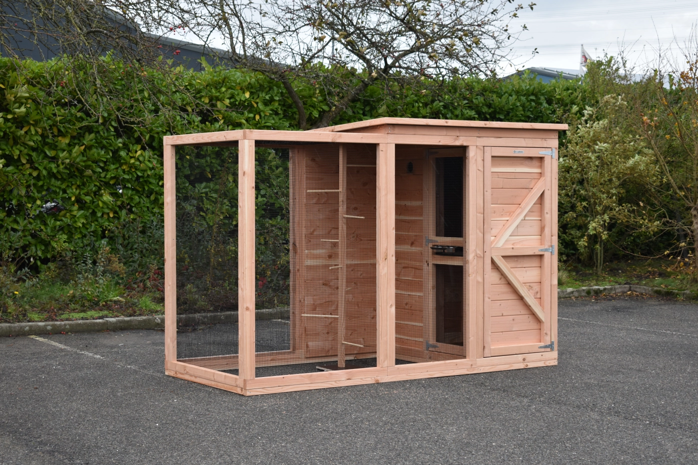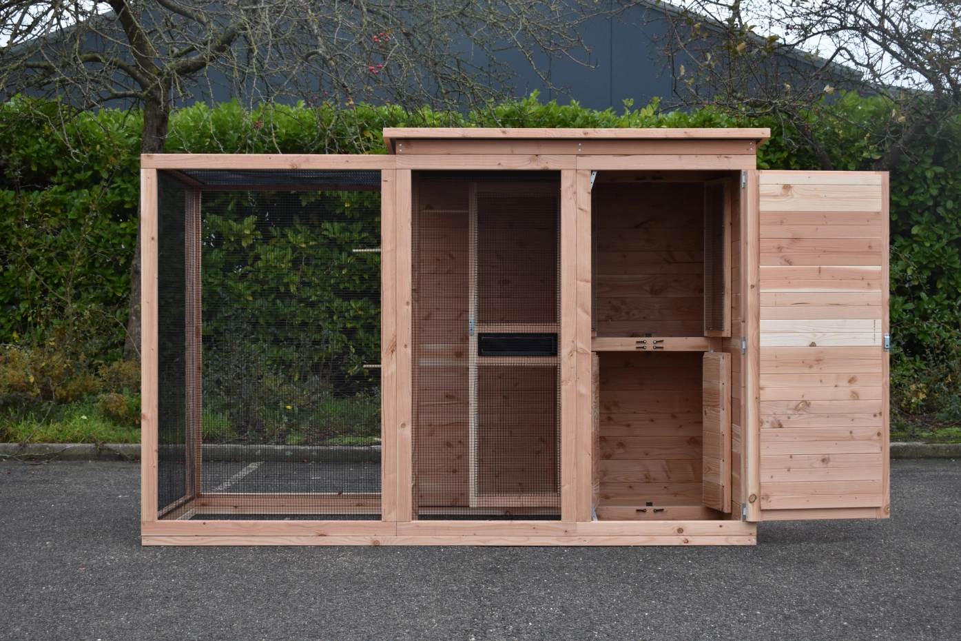Volière Flex 3+.1+ is a compact outdoor aviary with surprisingly many beautiful details. This aviary is equipped with an entrance sluice, so you can access the birds without them being able to escape. The light sleeping house is equipped with 2 doors. The round opening from the sleeping house to the flight (run) is closable. Furthermore, the aviary has a storage area with 2 doors and a luxuriously finished roof. The Flex is a beautiful bird aviary, designed at the request of professional bird enthusiasts. Perches can be ordered separately.