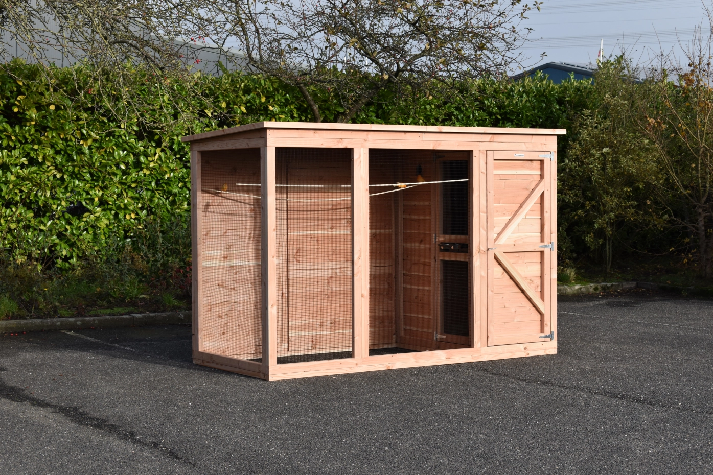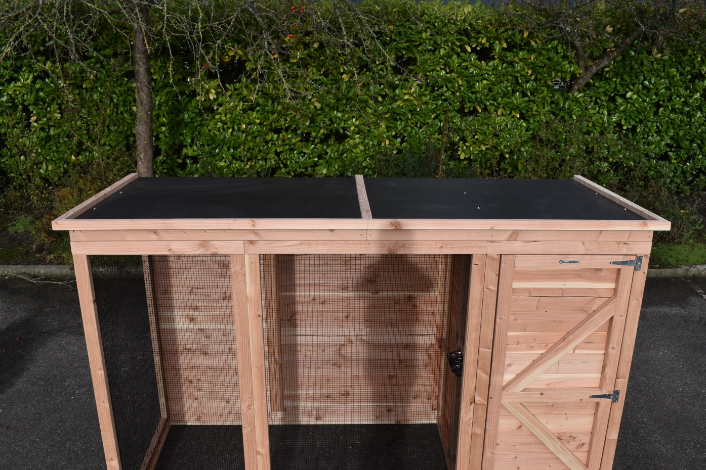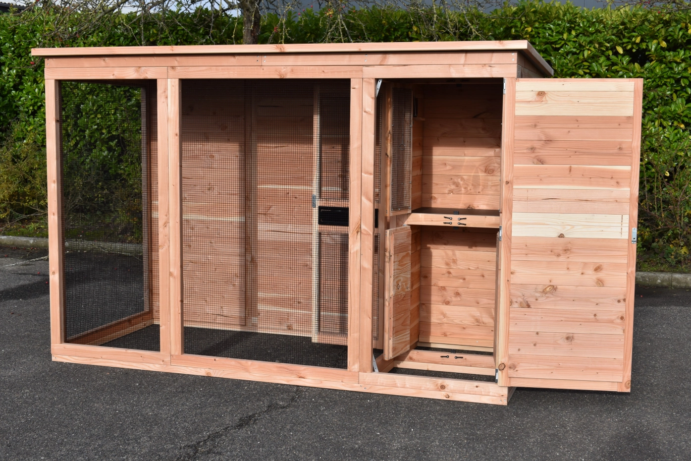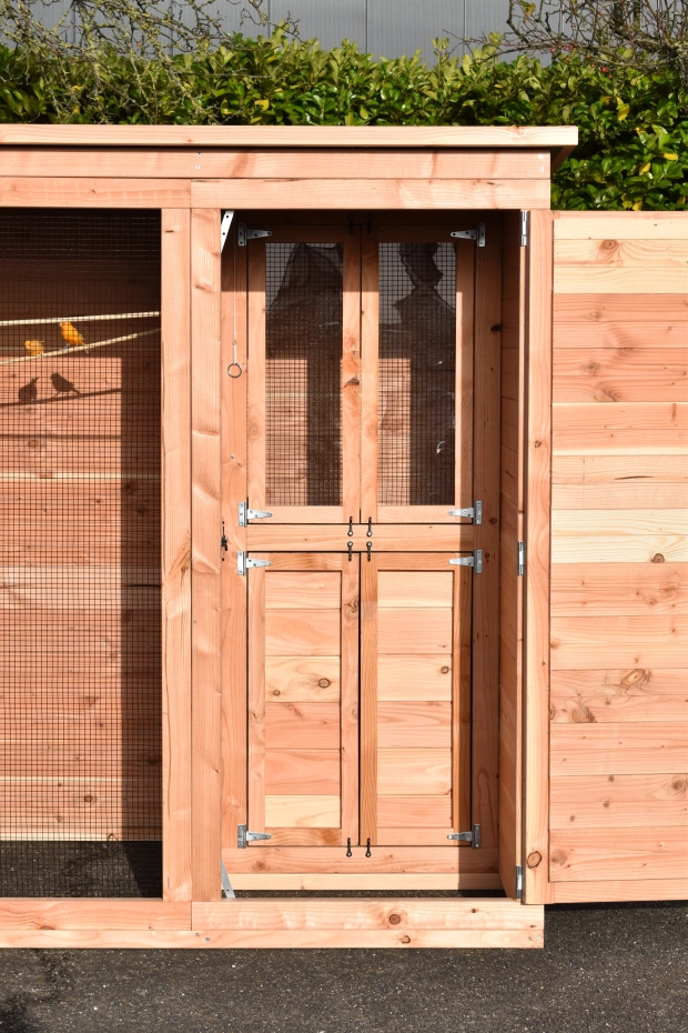 Aviary Flex 3+.1+ is a beautiful aviary for outside with many practical details. The aviary is provided with a safety porch, so that you can reach the birds, with less chance that they could escape. The sleeping compartment is provided with 2 doors. The round fly hole is lockable. The aviary has a storage room and a luxury roof. The Flex is a beautiful aviary, which you can adapt to your own wishes!