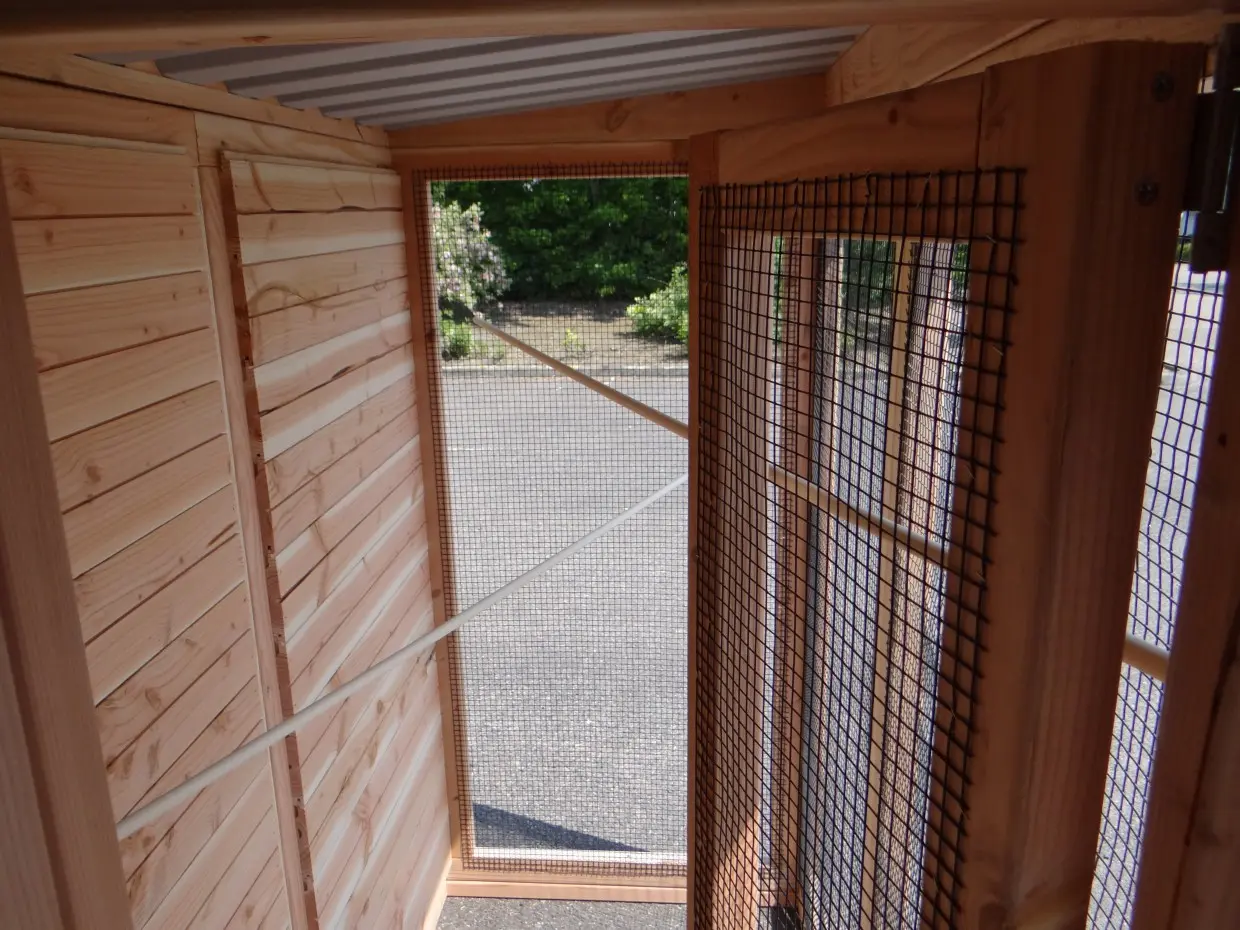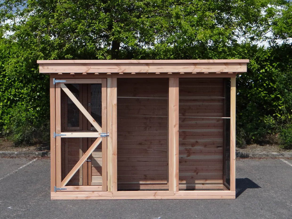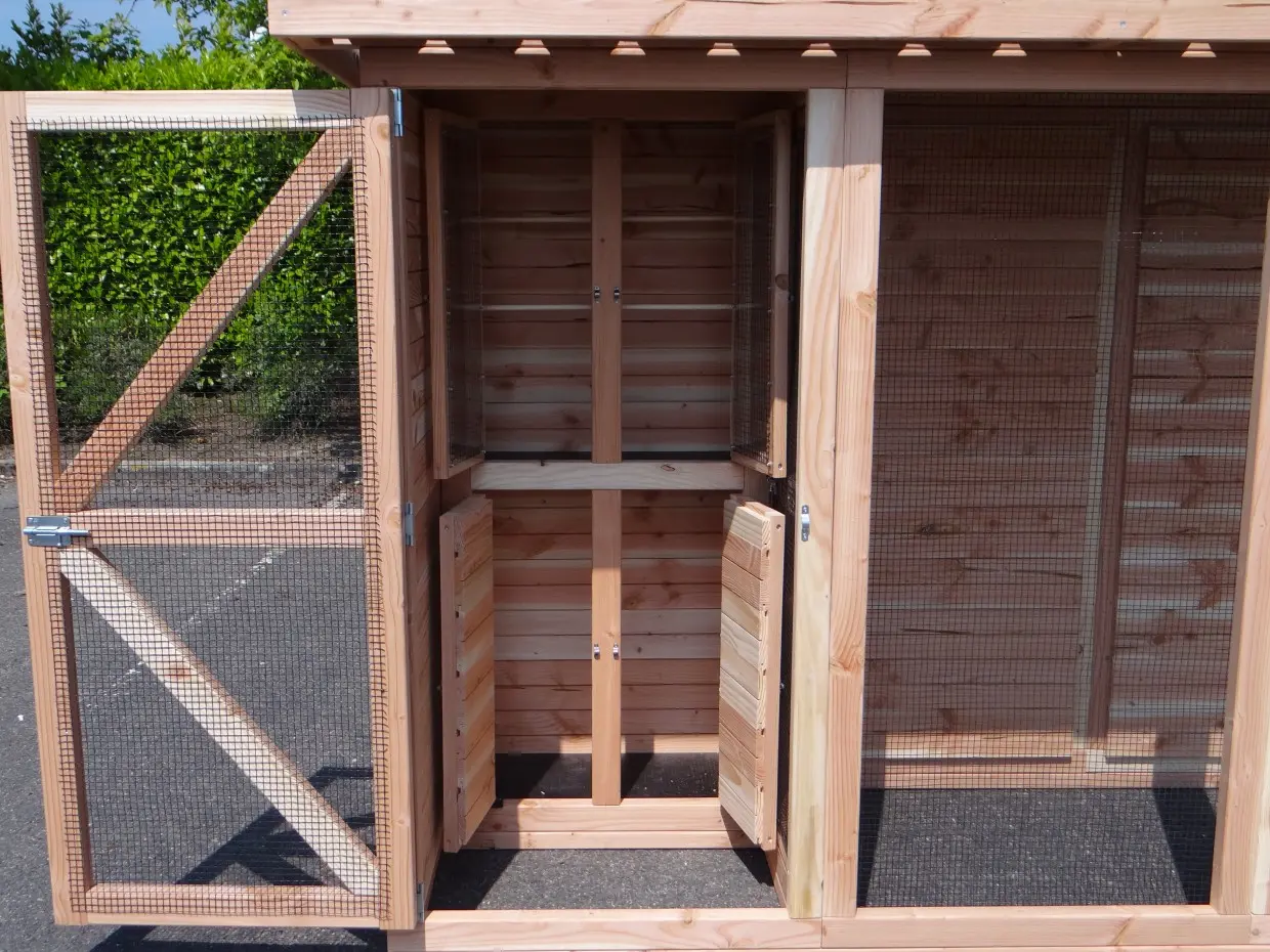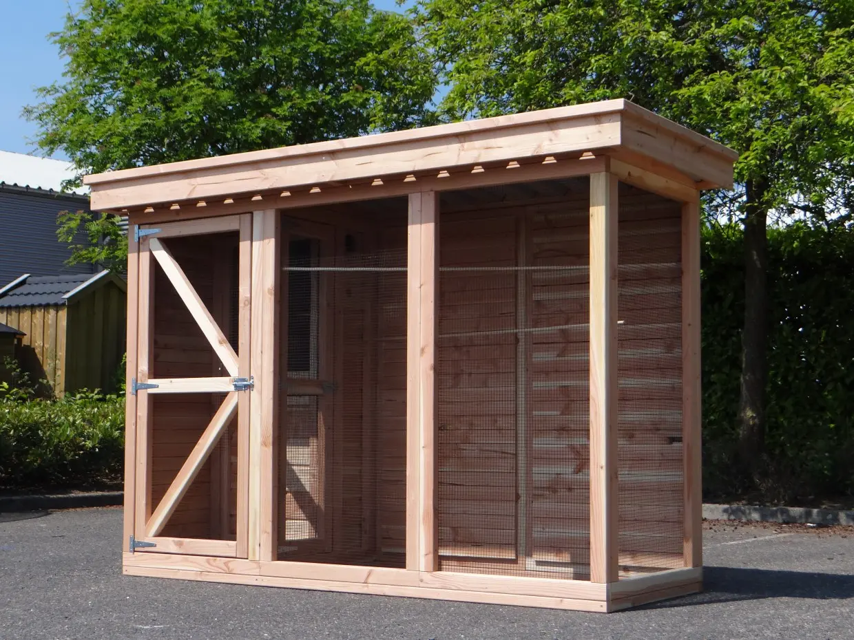 Aviary Flex 3.1 is a beautiful aviary for outside with many practical details. The aviary is provided with a safety porch, so that you can reach the birds, with less chance that they could escape. The sleeping compartment is provided with 2 doors. The round fly hole is lockable. The aviary has a storage room and a luxury roof. The Flex is a beautiful aviary, which you can adapt to your own wishes!
