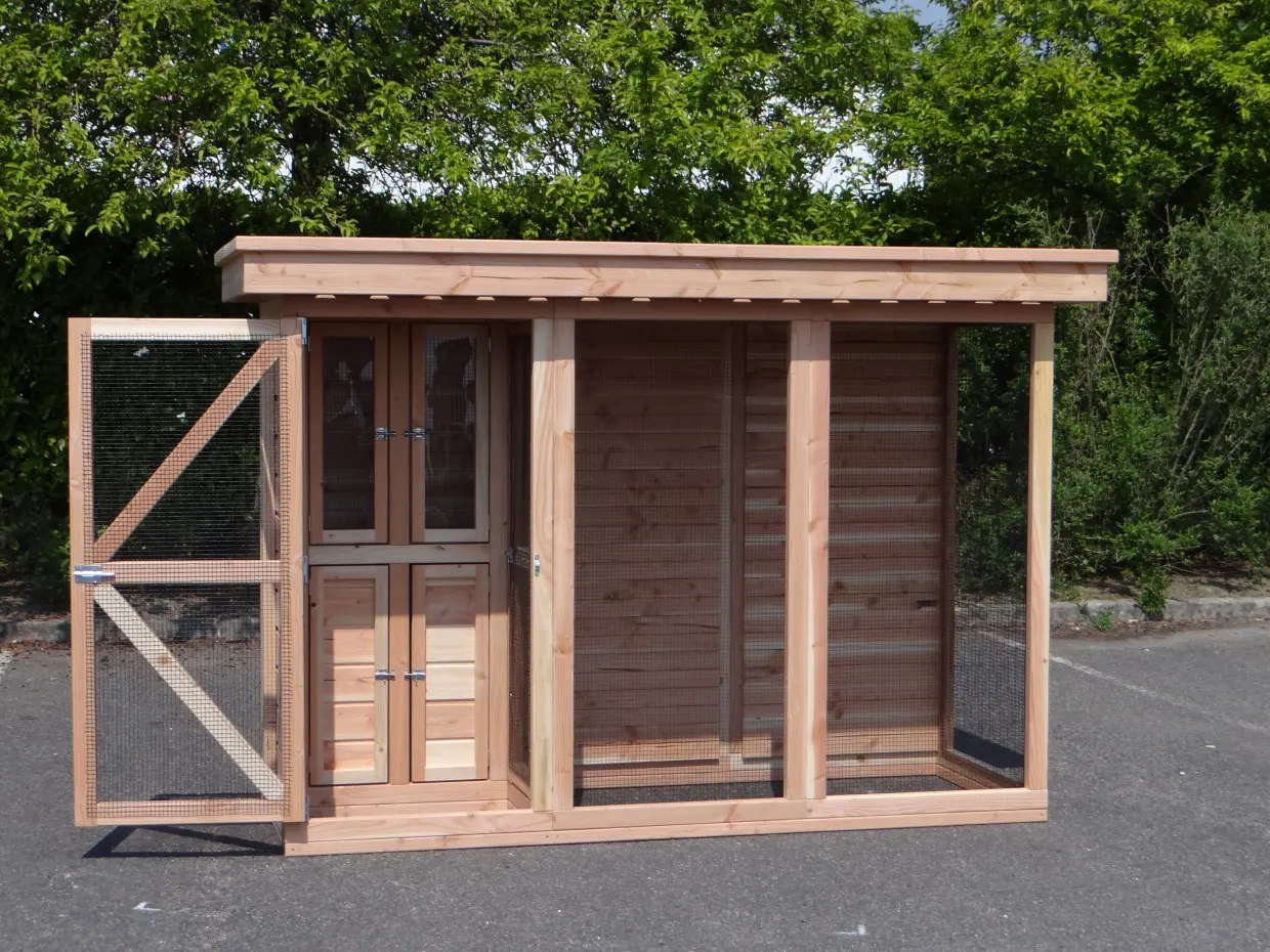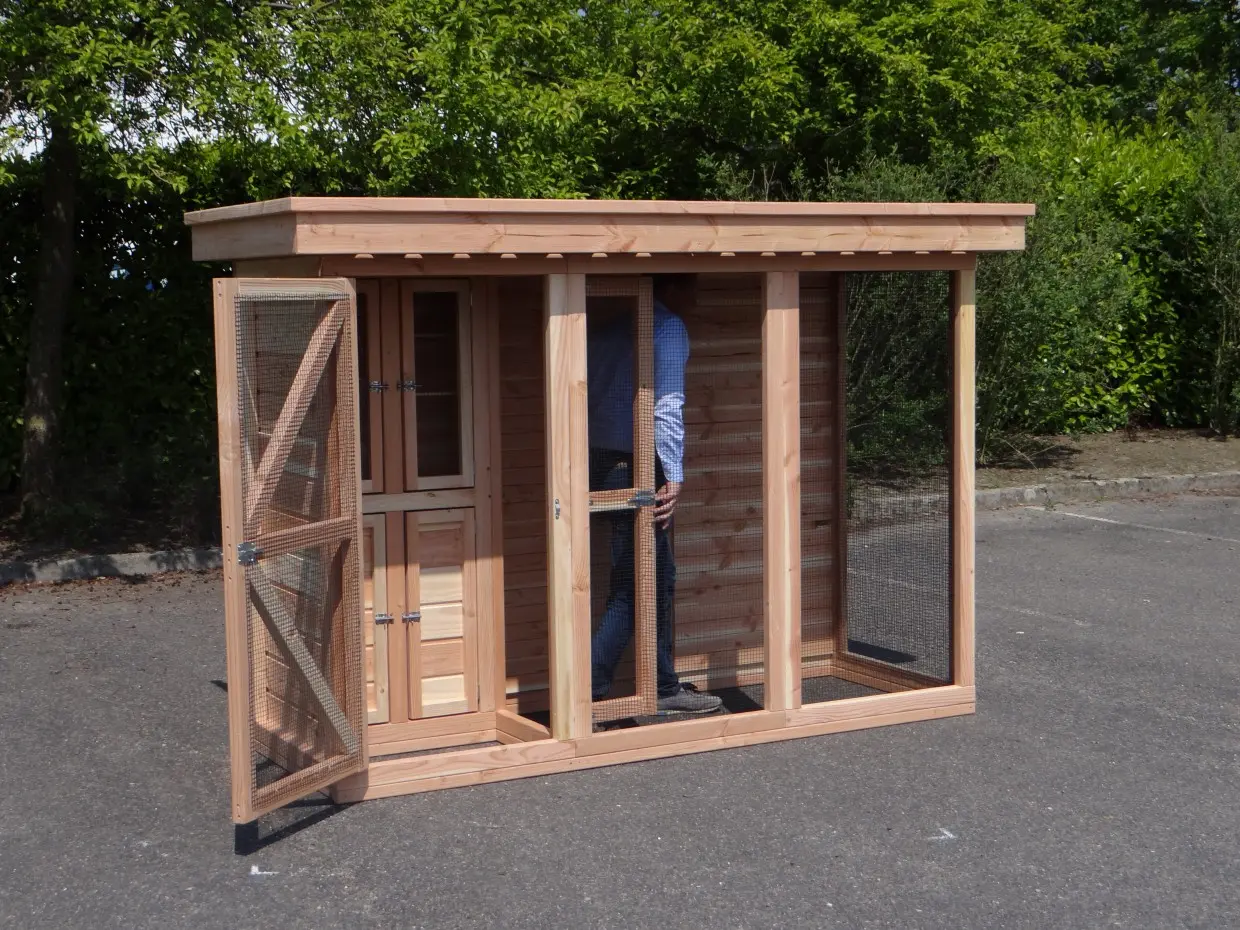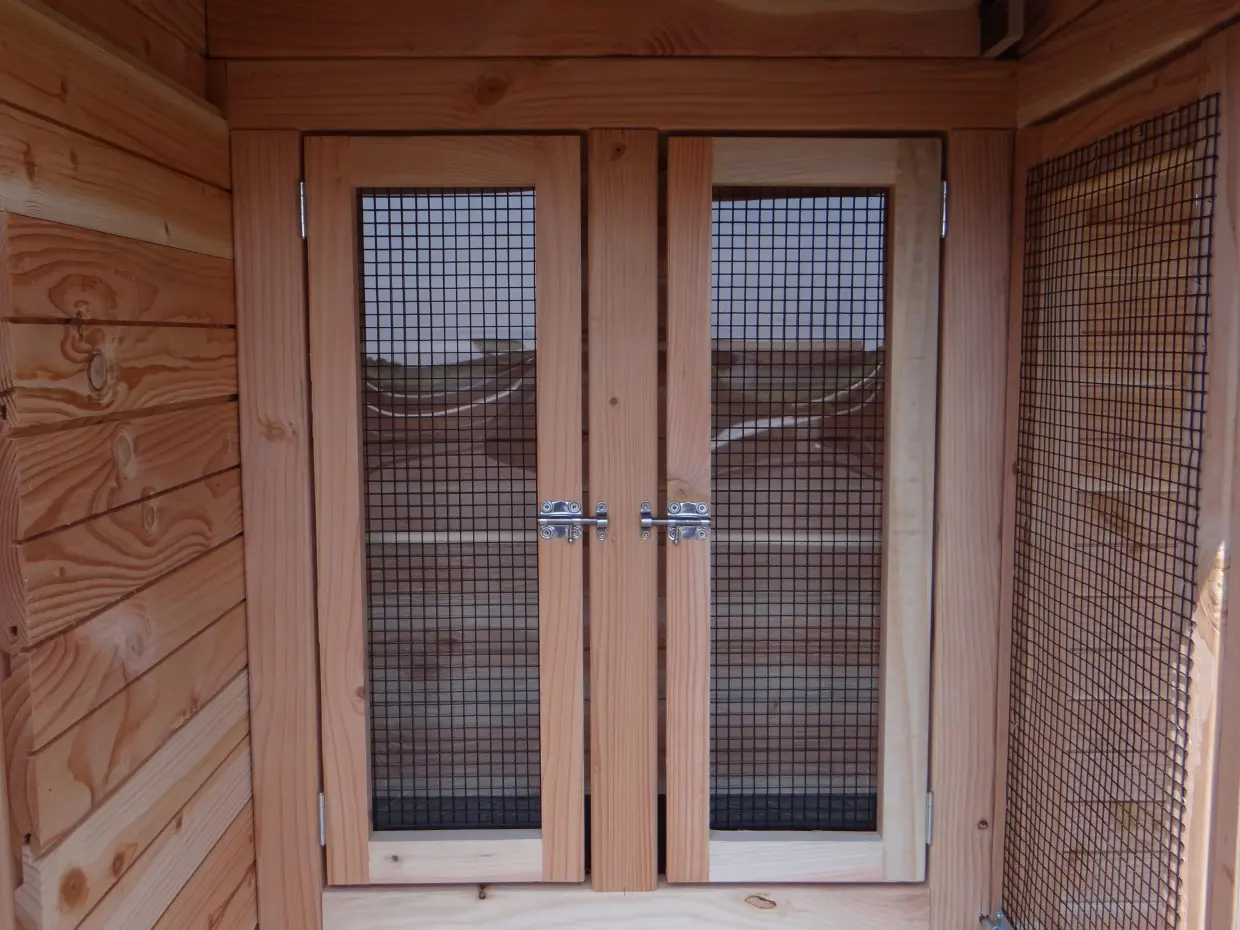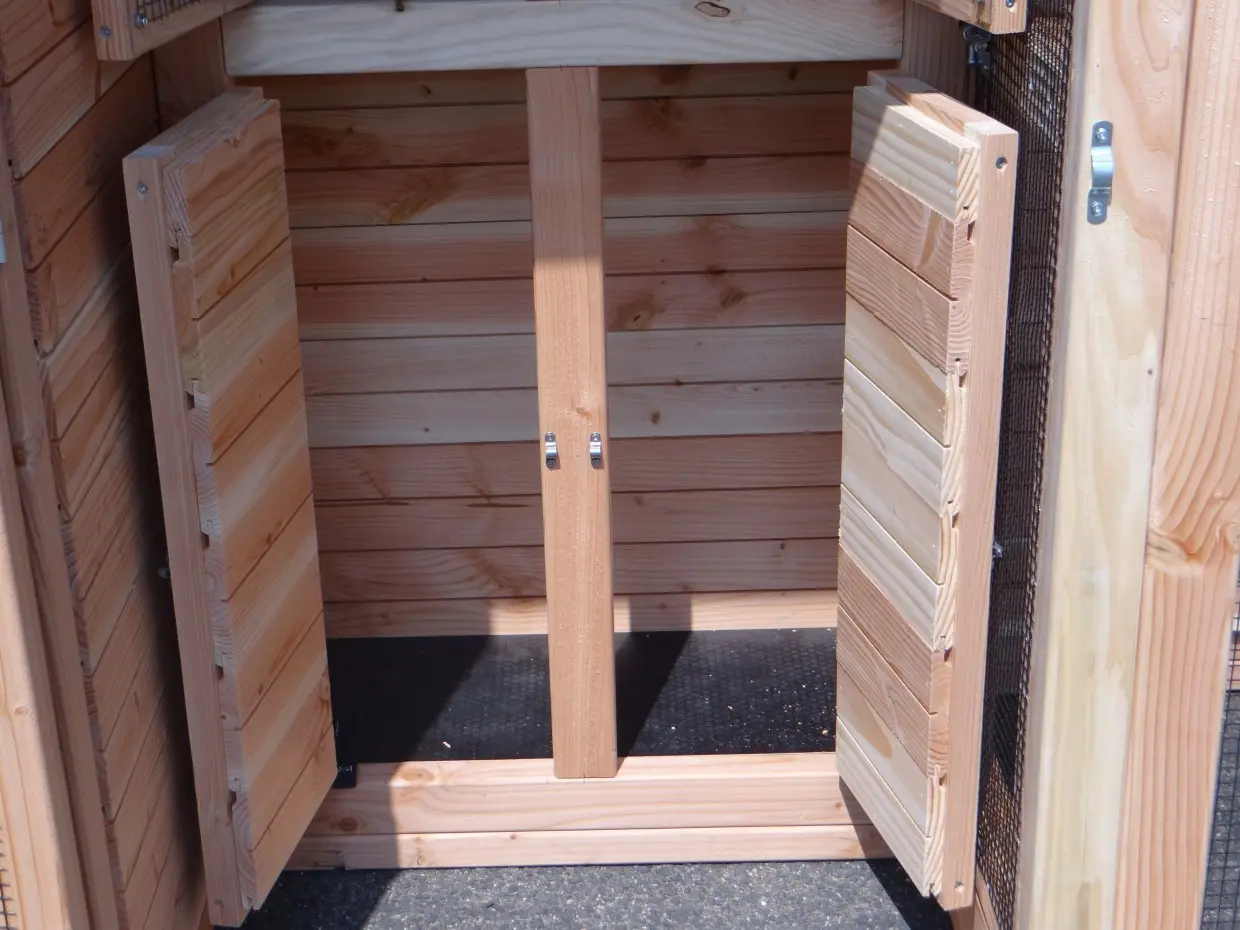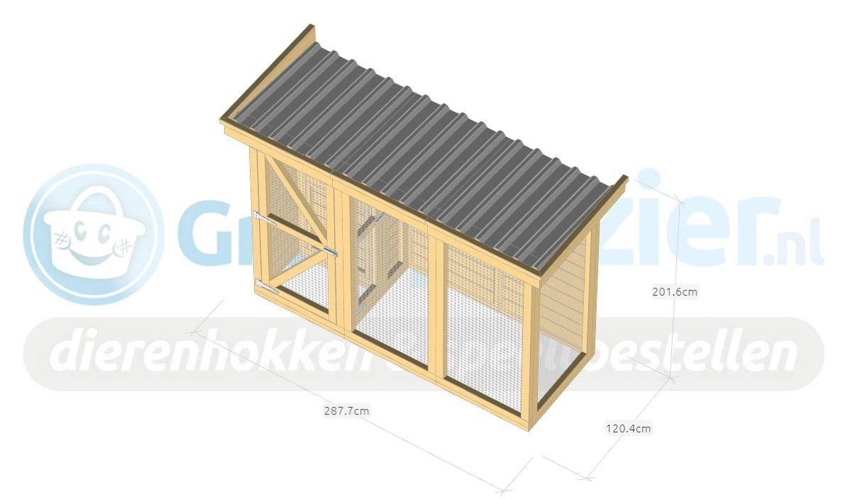Aviary Flex 3.1 is a beautiful aviary for outside with many practical details. The aviary is provided with a safety porch, so that you can reach the birds, with less chance that they could escape. The sleeping compartment is provided with 2 doors. The round fly hole is lockable. The aviary has a storage room and a luxury roof. The Flex is a beautiful aviary, which you can adapt to your own wishes!