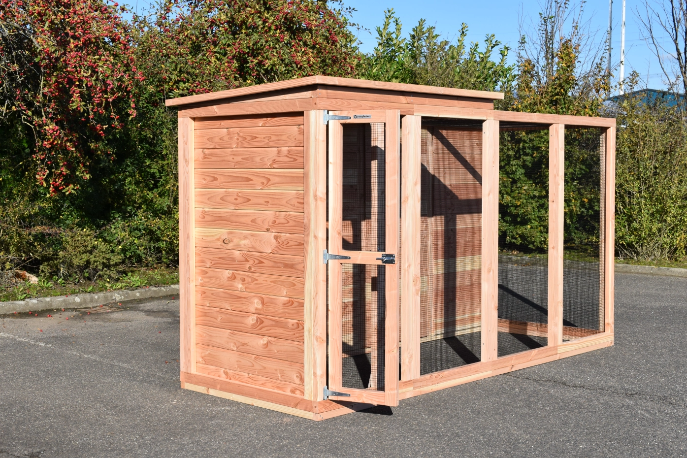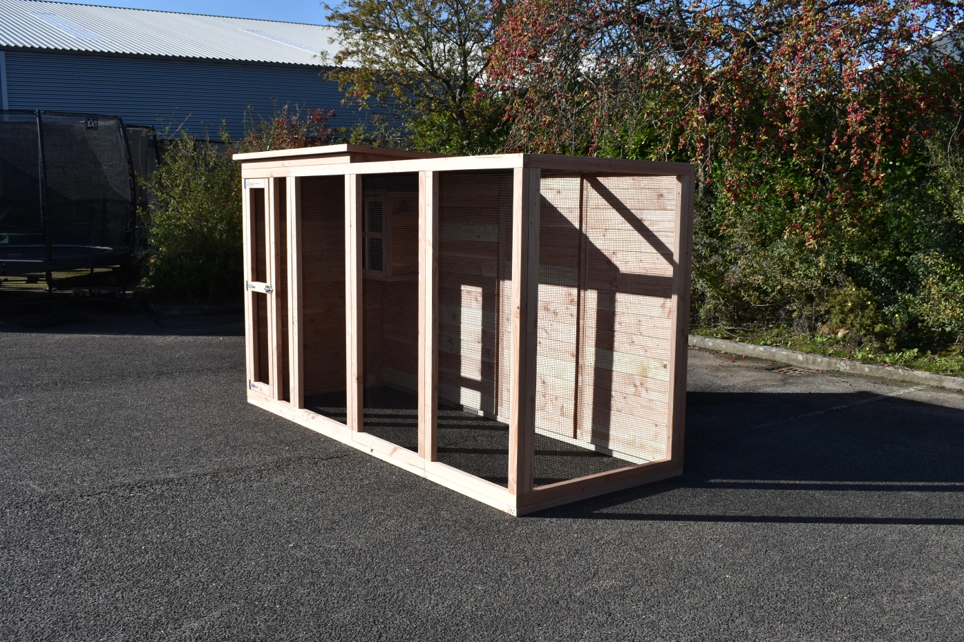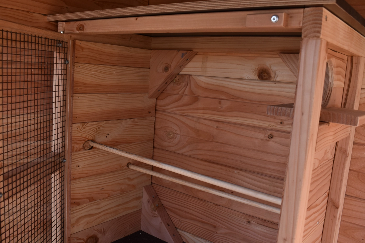 Aviary Flex 4.1+ is a large aviary with a little sleeping compartment. The sleeping compartment is provided with 2 perches. This aviary is adaptable to your own wishes. The aviary is made of Douglaswood.