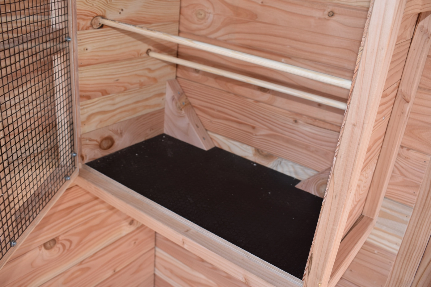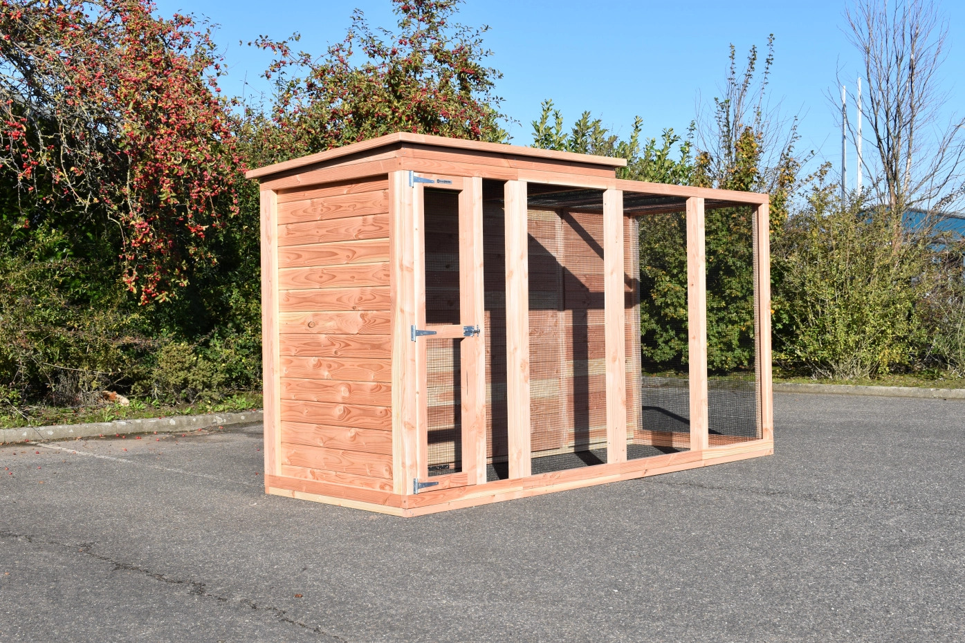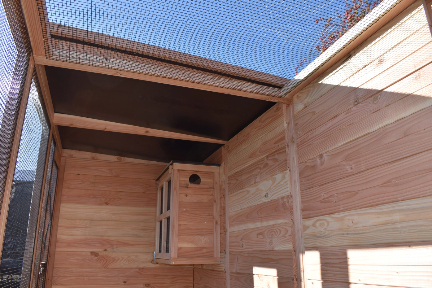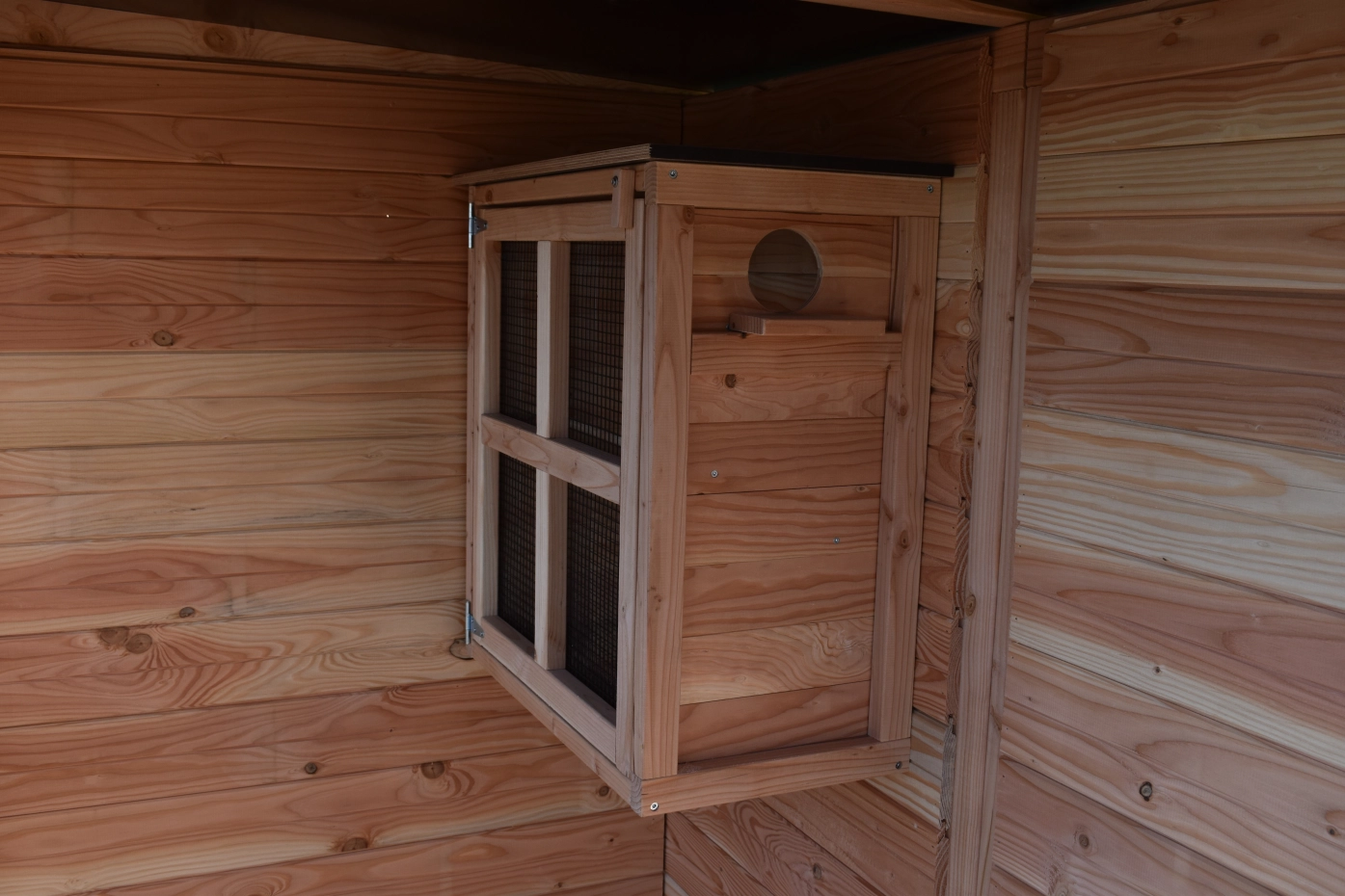 Aviary Flex 4.1+ is a large aviary with a little sleeping compartment. The sleeping compartment is provided with 2 perches. This aviary is adaptable to your own wishes. The aviary is made of Douglaswood.