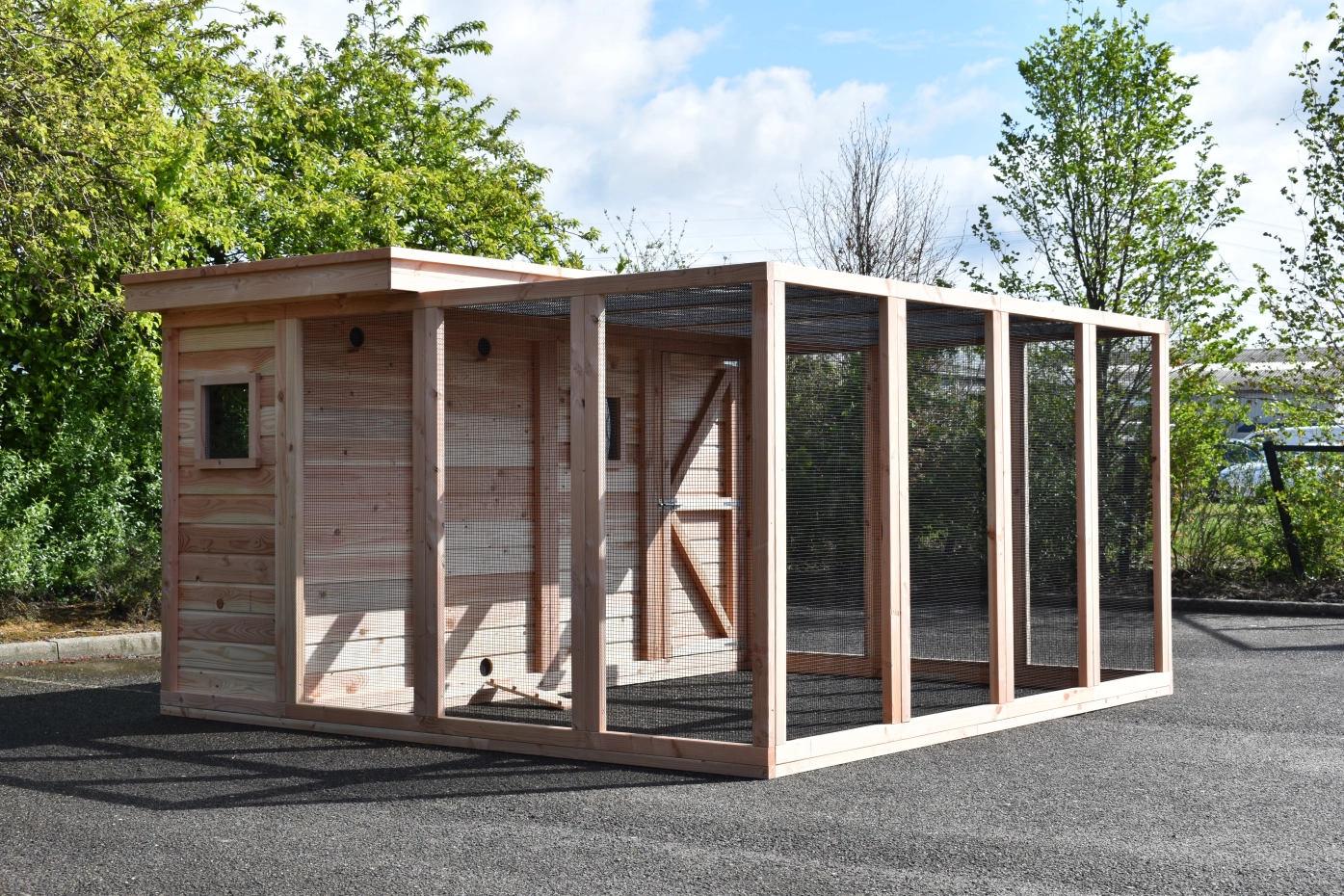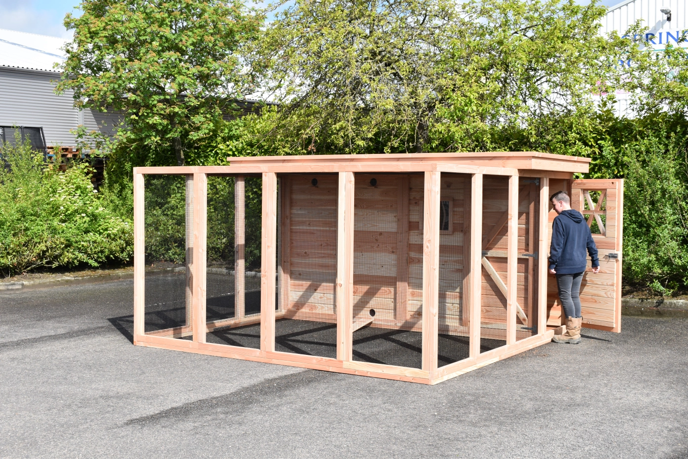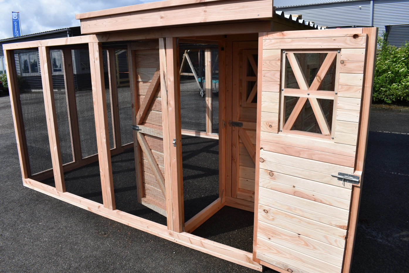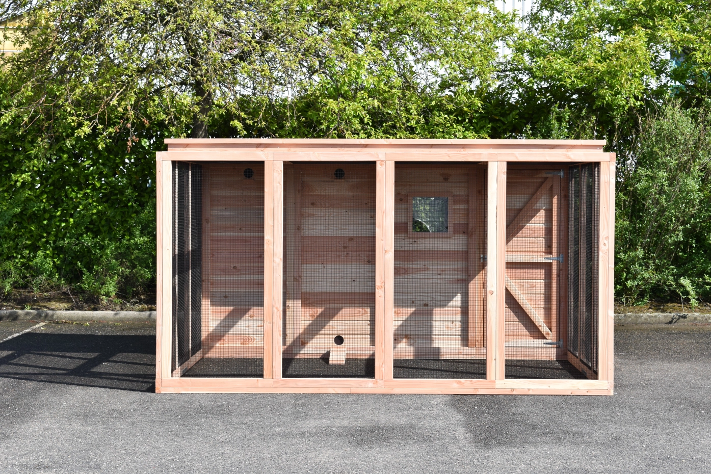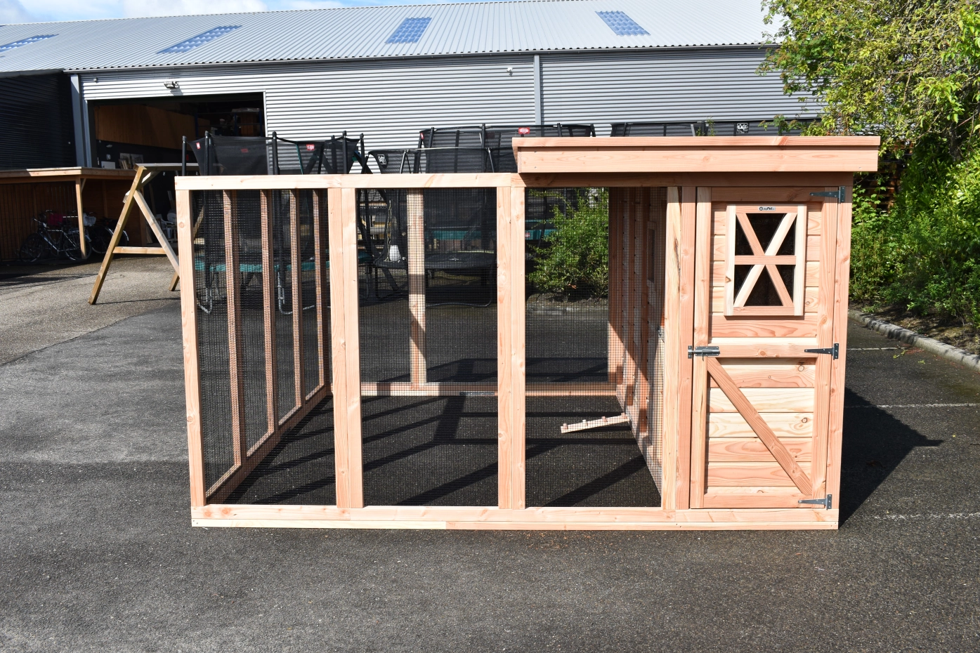 Aviary / quail house Flex 4.4 is a beautiful hutch with a large sleeping compartment. The hutch has 3 openings, 2 for birds and 1 for quails. Because of the safety porch, you can reach the run, without the risk that the birds fly away. The sleeping compartment is provided with 3 windows. The windows are provided with plexiglass and removable mesh parts. The wooden door to the run can be locked from both sides. The large run has the dimensions of ca. 340x250cm. The run is partly provided with a mesh roof, and partly a closed roof. The sleeping compartment and the safety porch have a closed roof.