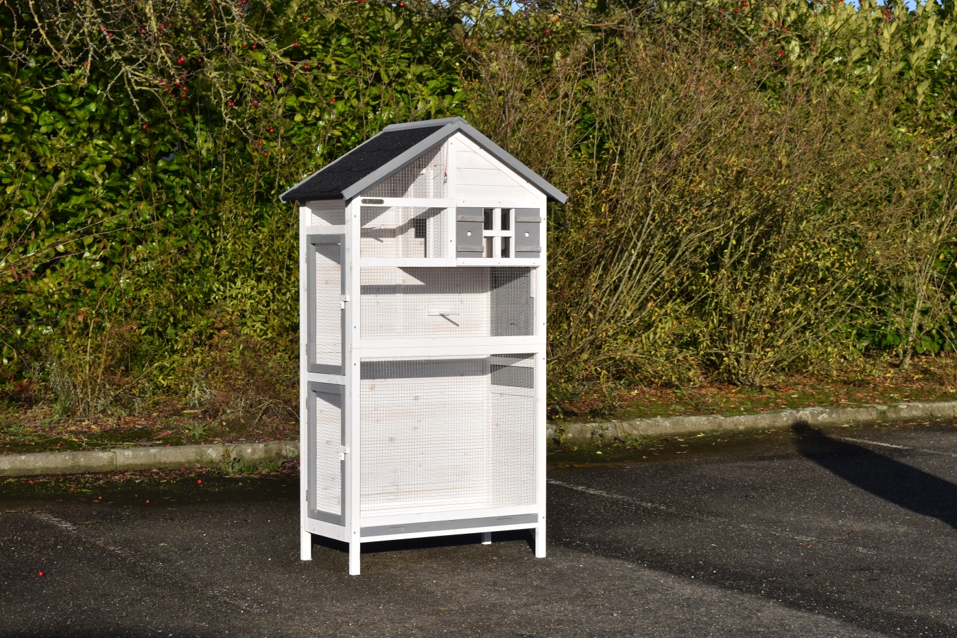 - This aviary is equipped with a rotating feeding system. Therefore the birds can be easily fed