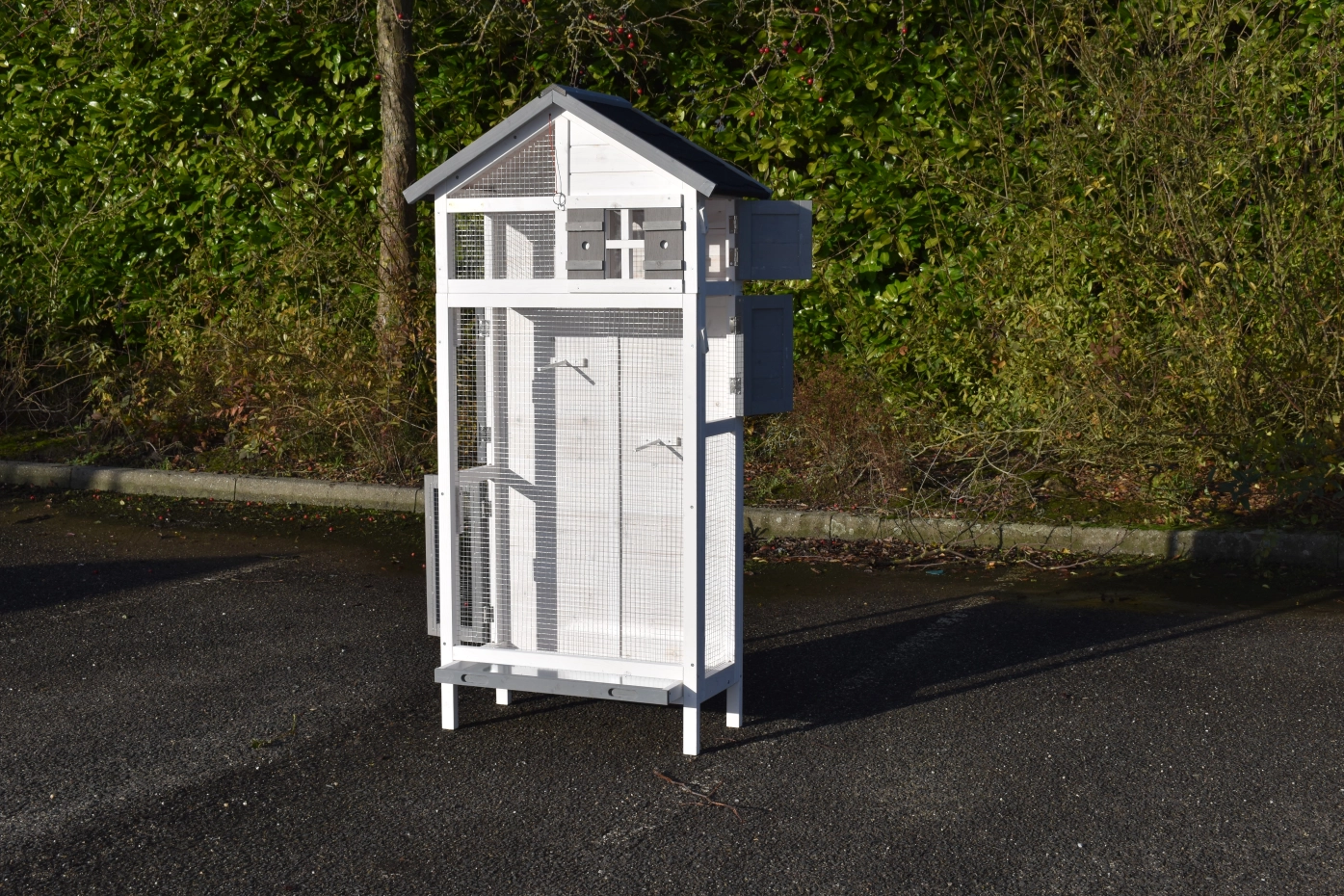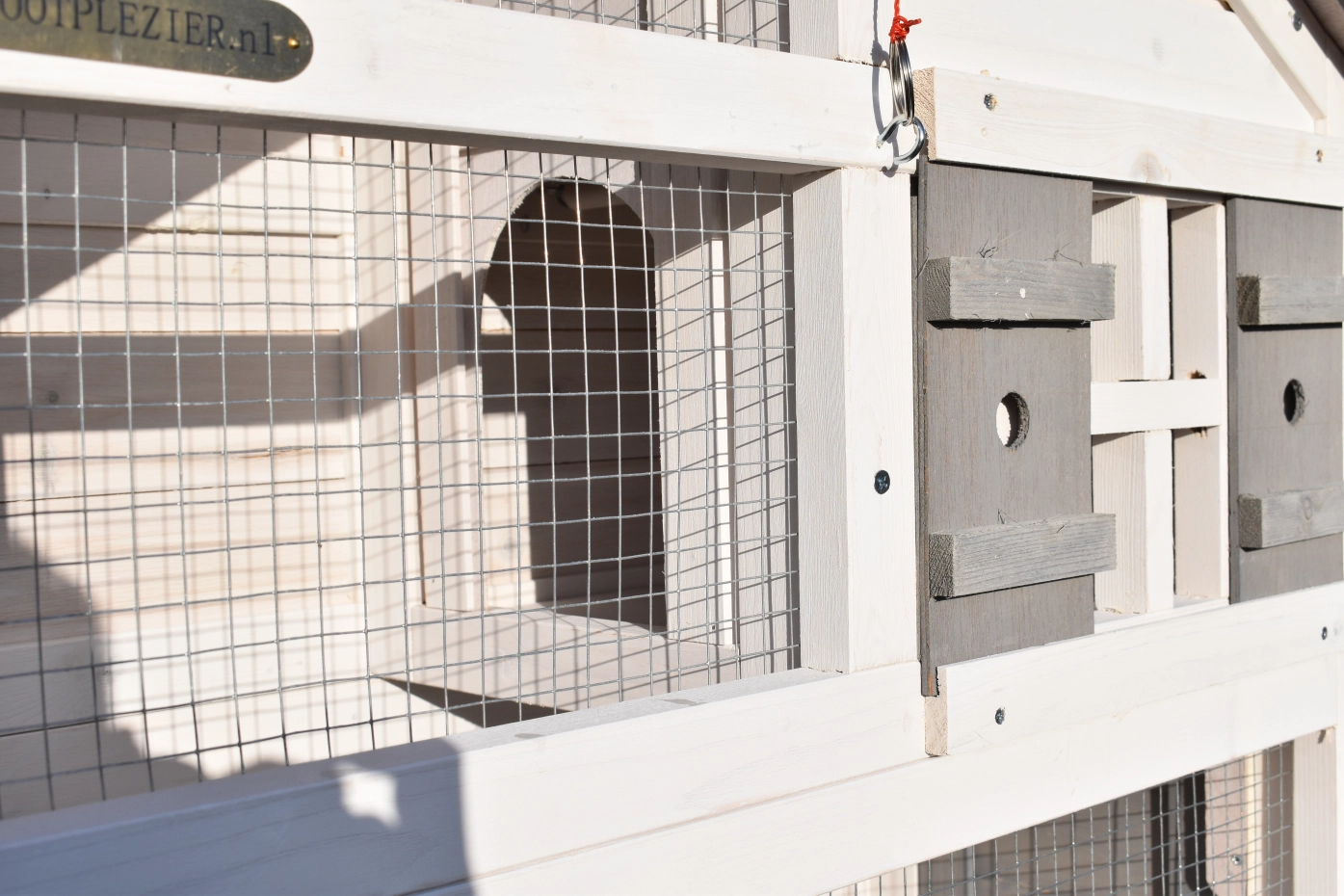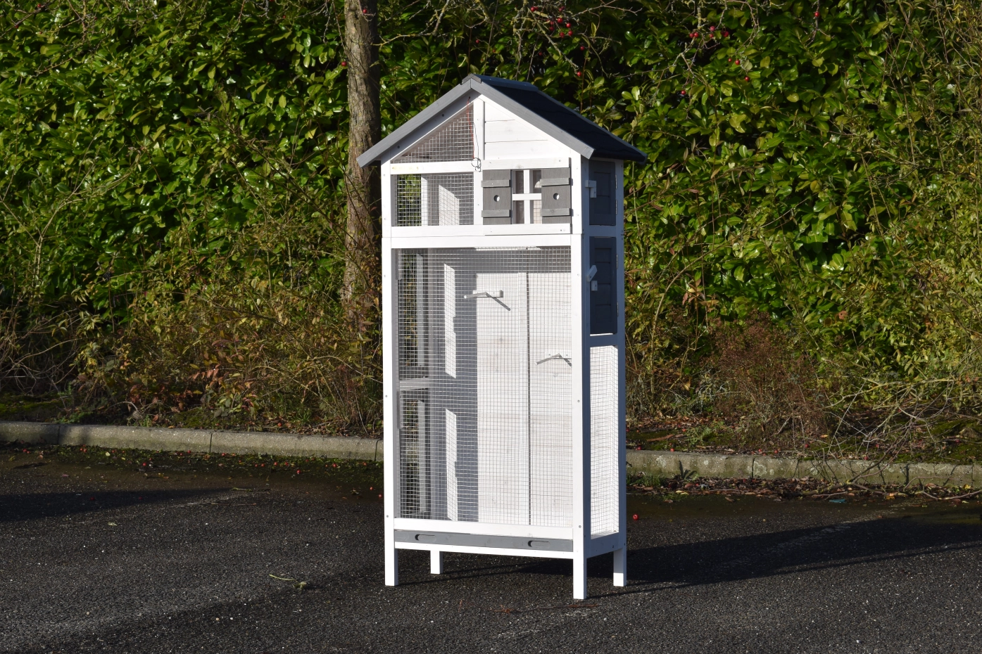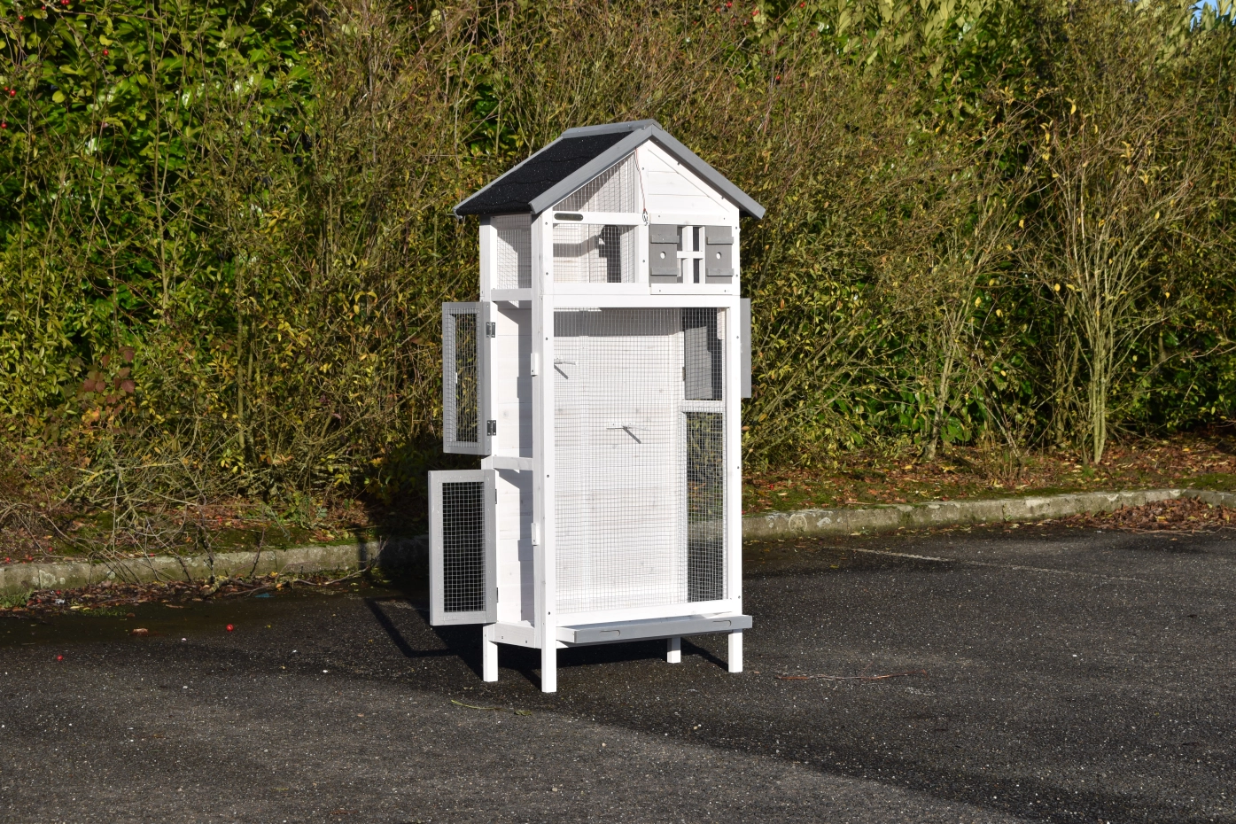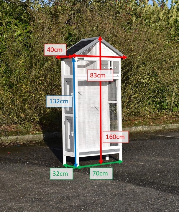 The aviary Sara Small is a nice aviary with a tray and many large doors, so that you can clean the hutch very easily. The aviary is stained one time, but we advise to stain it a second time. The max. dimensions are 83x40x160cm.