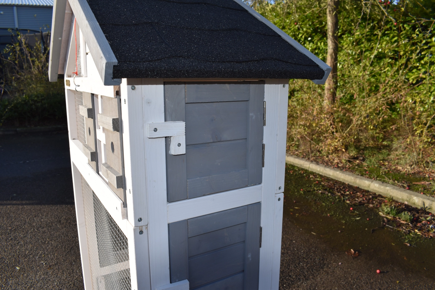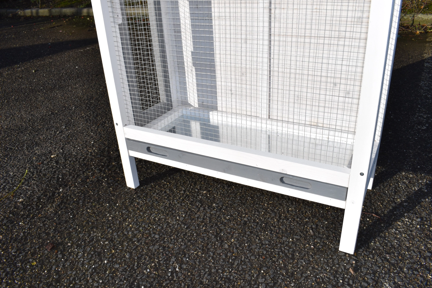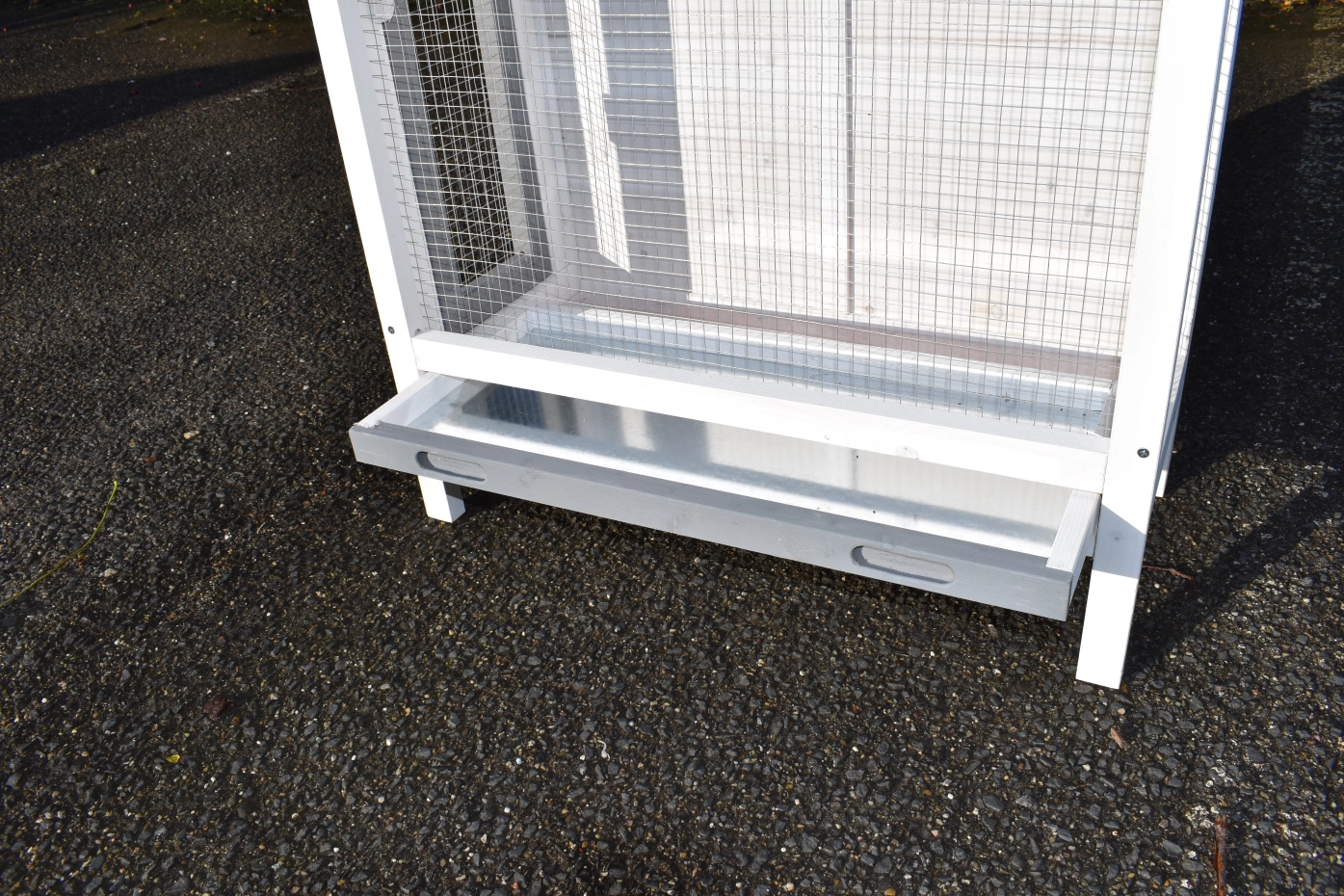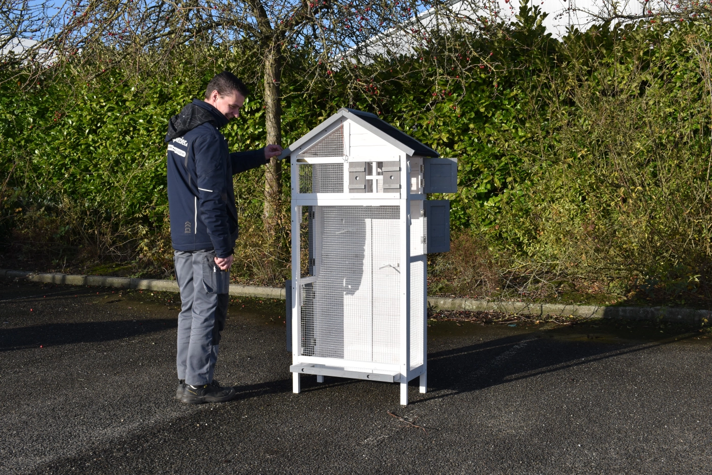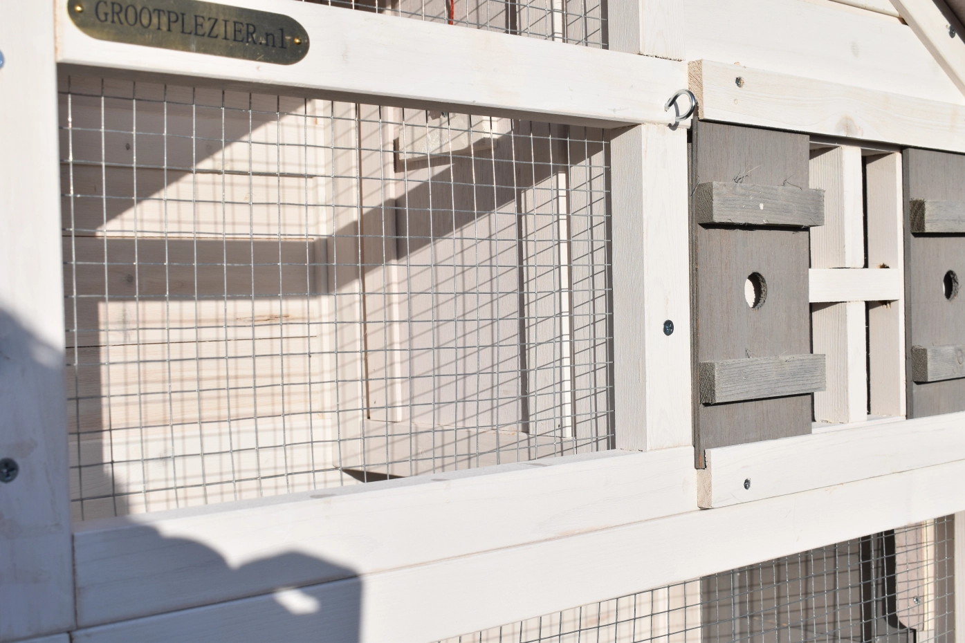 The aviary Sara Small is a nice aviary with a tray and many large doors, so that you can clean the hutch very easily. The aviary is stained one time, but we advise to stain it a second time. The max. dimensions are 83x40x160cm.