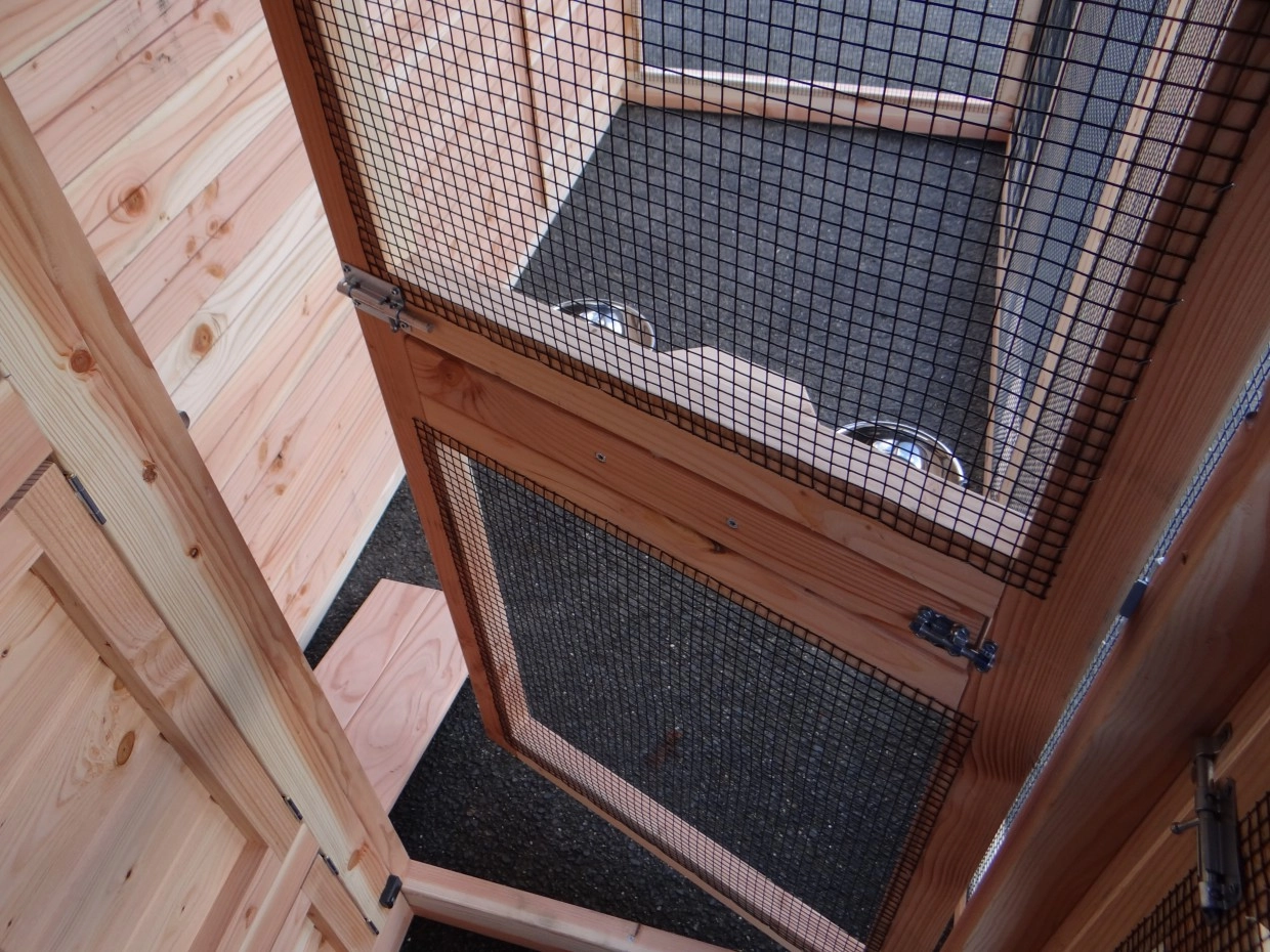 You can get a double rotating feeding rack in the door to the run. This makes it easy to change water and/or feed without having to open the door to the run.