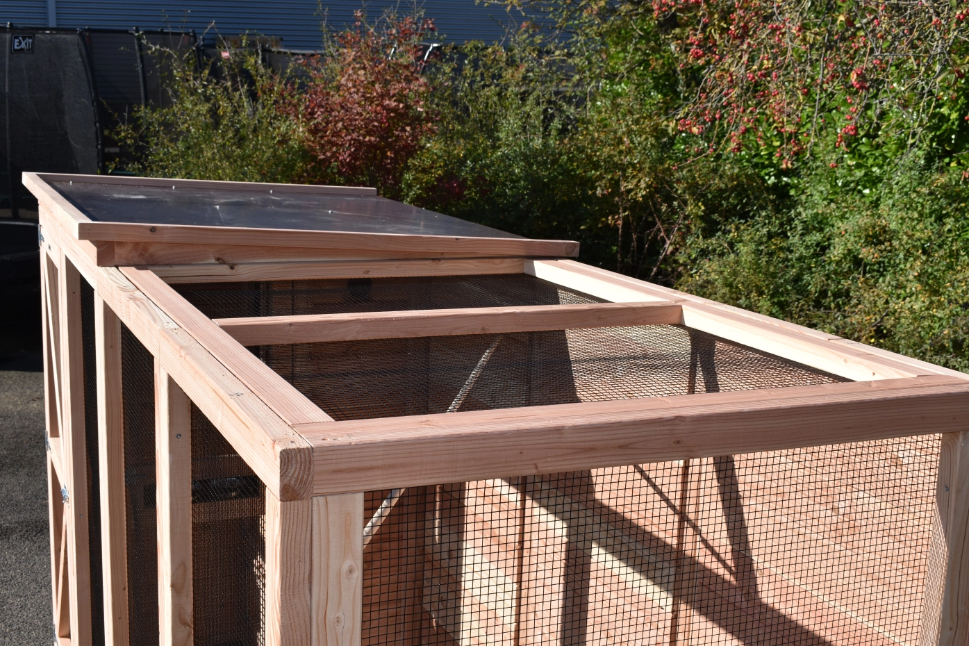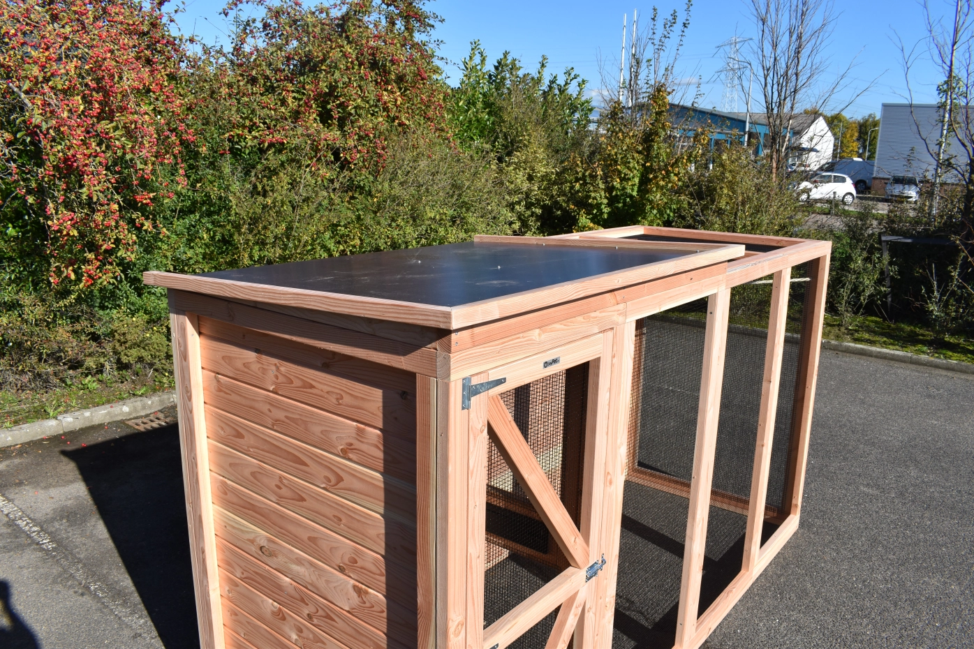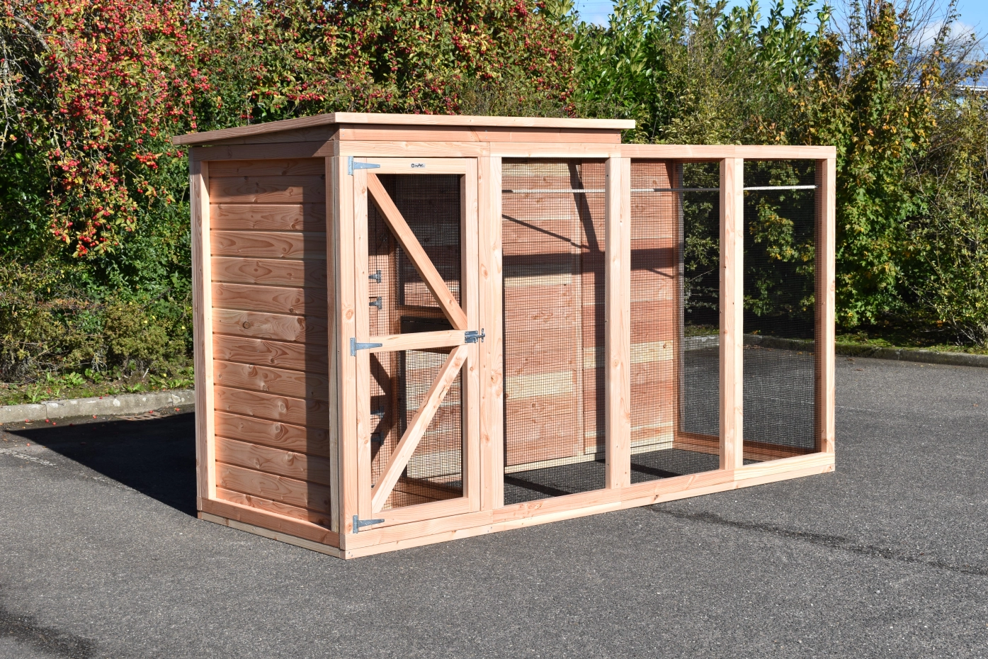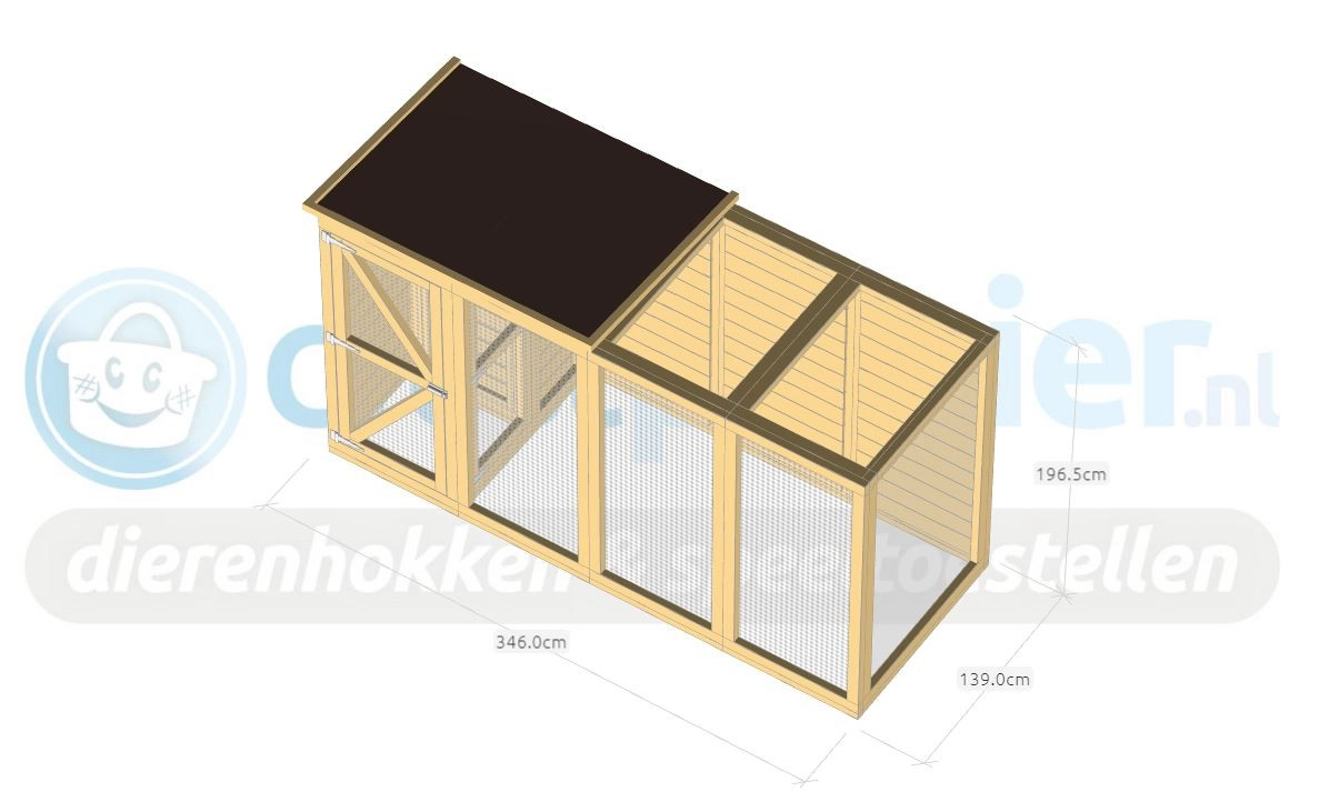 Aviary Flex 4.1 is a beautiful, spacious aviary with a lock and night shelter. You can keep tropical birds and quail in this aviary made from douglas wood and enjoy all the comforts of home. The night shelter and part of the run have a closed roof; this is the raised part of the roof.