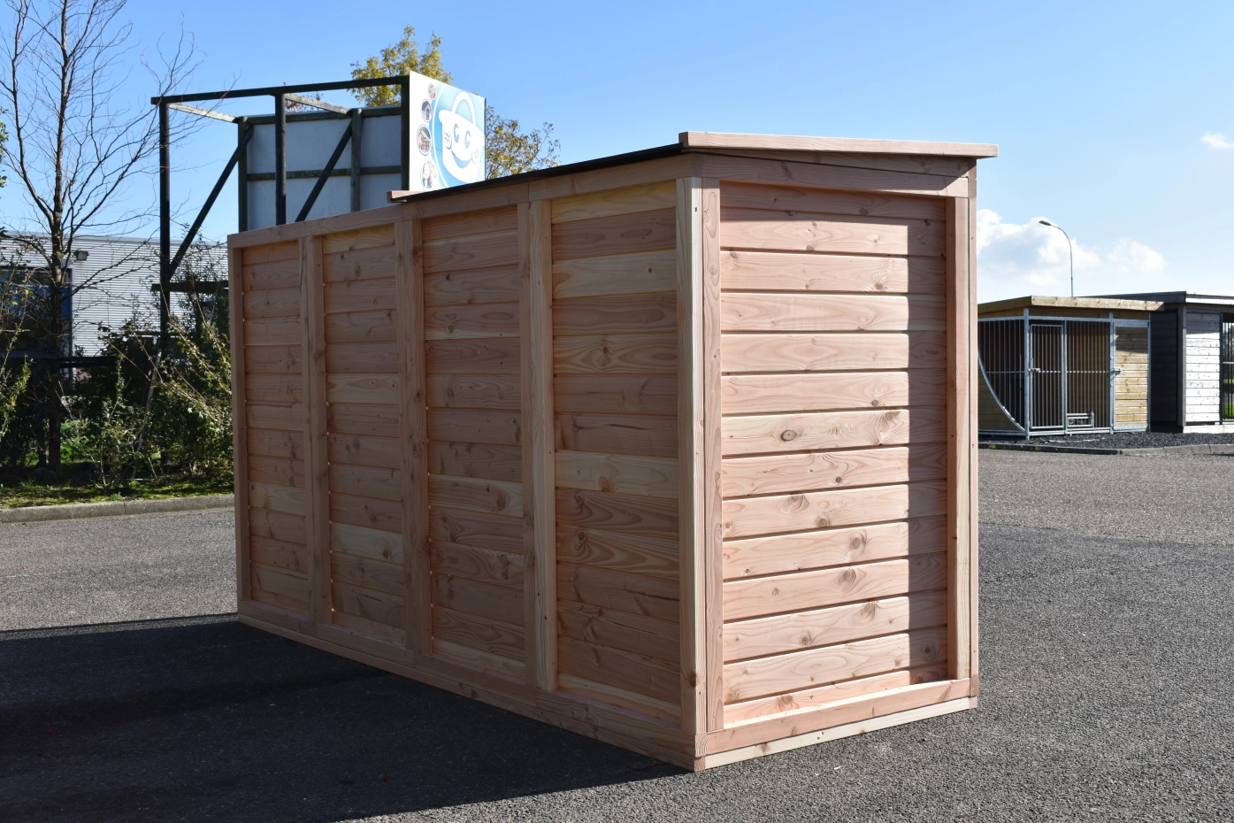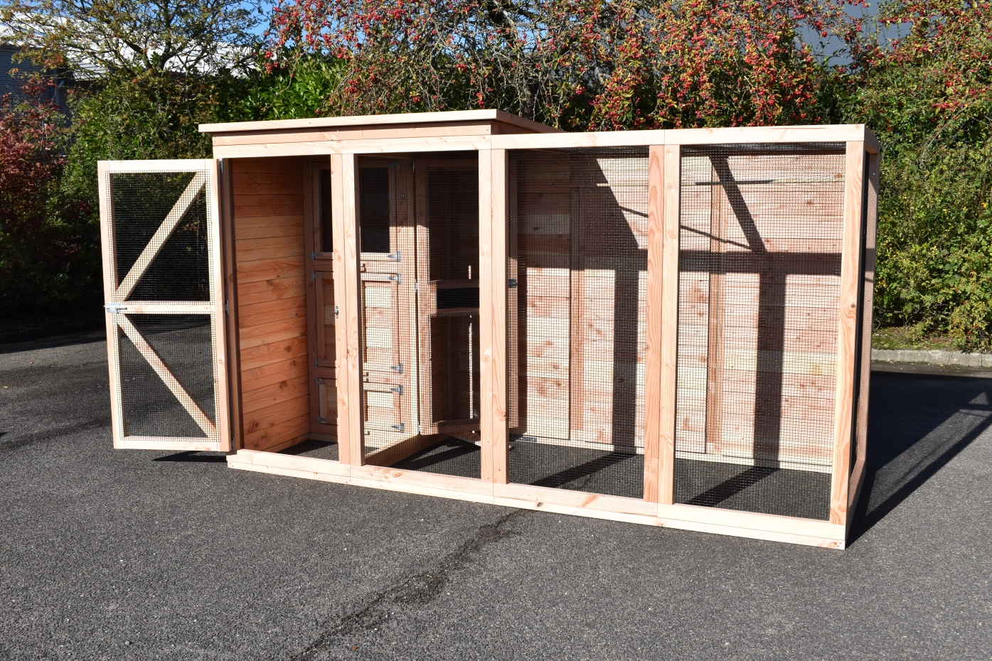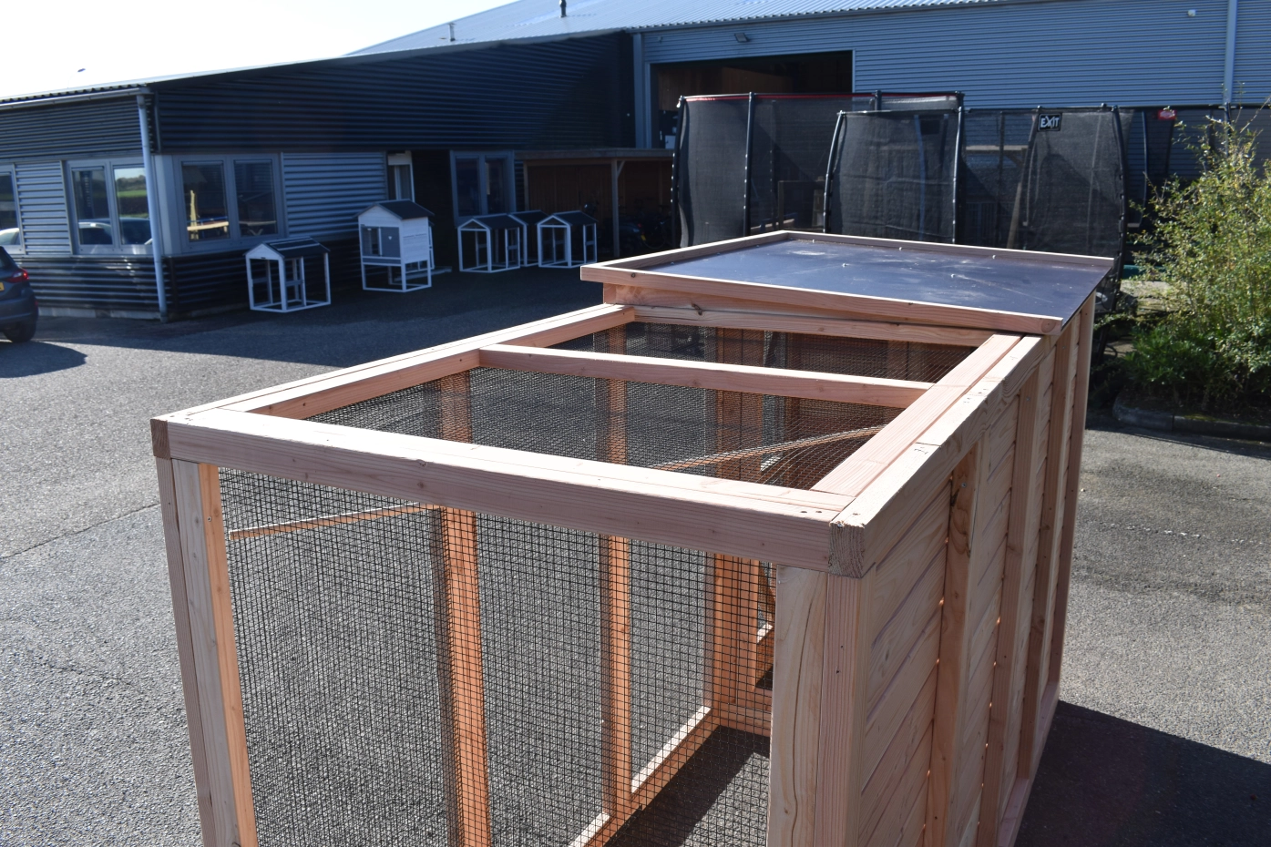 Aviary Flex 4.1 is a beautiful, spacious aviary with a lock and night shelter. You can keep tropical birds and quail in this aviary made from douglas wood and enjoy all the comforts of home. The night shelter and part of the run have a closed roof; this is the raised part of the roof.