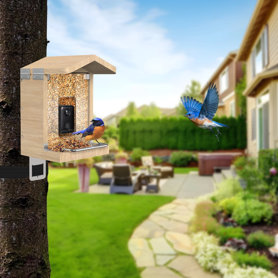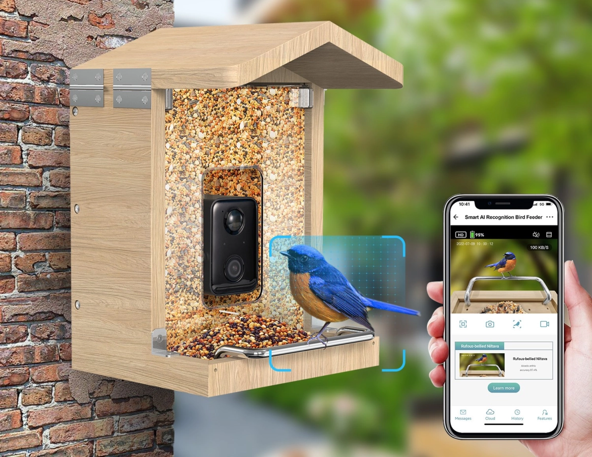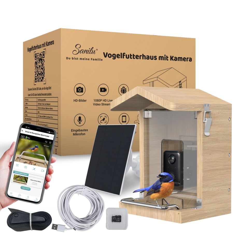 This smart bird feeder with a camera allows you to observe birds in your garden up close via a live connection on your smartphone with the free app. The bird feeder is equipped with a solar panel and a rechargeable battery, making it both sustainable and user-friendly. With features like night vision, AI bird recognition, a built-in microphone, and storage options of up to 64GB on an SD card, you can record and share bird behavior day and night. Ensure a Wi-Fi connection to view the photo and video footage.