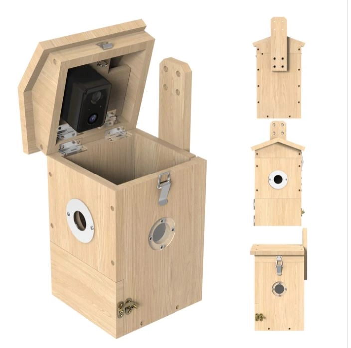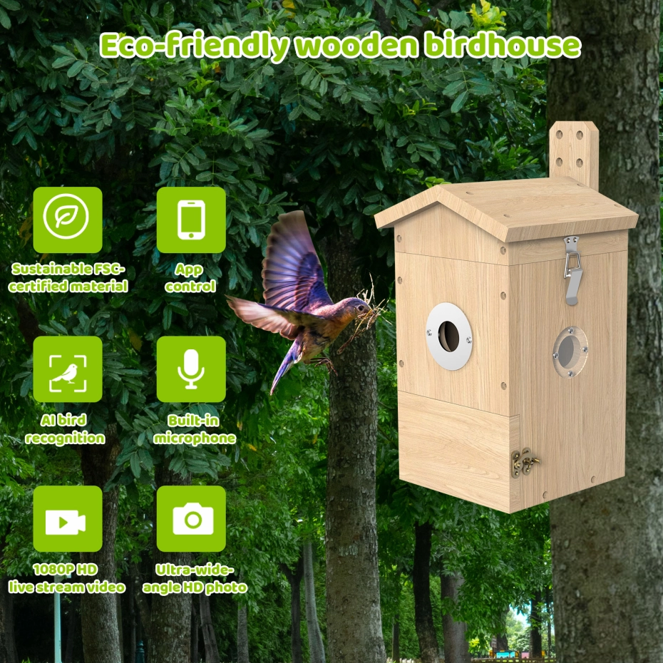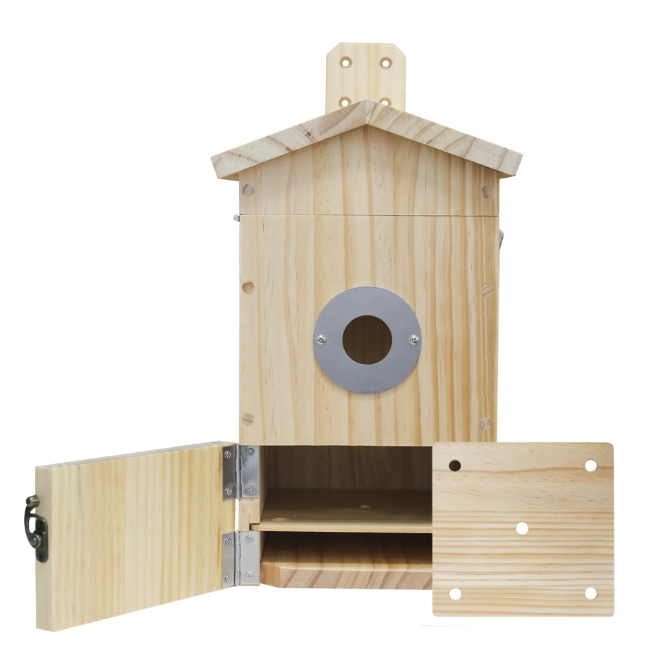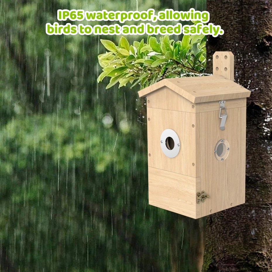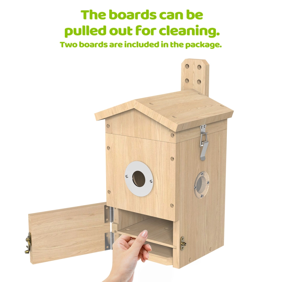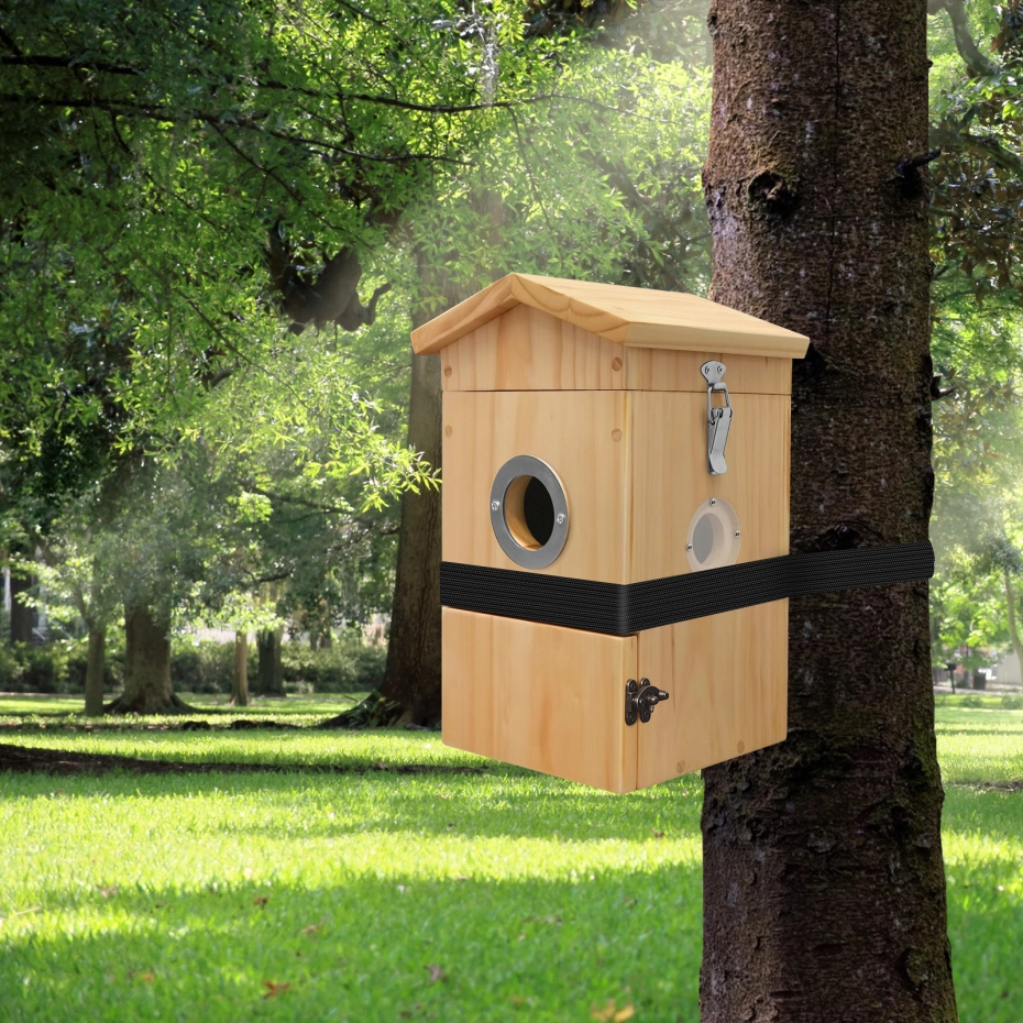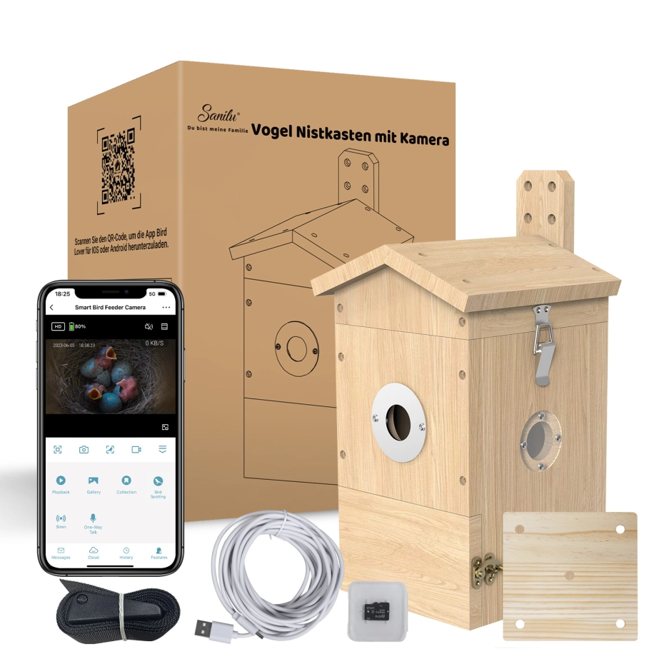 Follow the nesting birds in your garden! The Sanilu birdhouse has space to install a camera, allowing you to follow the nesting process directly on your phone. The birdhouse features a 3.2 cm entrance hole with an aluminum anti-peck strip. On the side, there is a small window that lets in enough light. Inside, a special platform keeps the camera and cables safely away from the birds. The removable bottom is easy to clean, and an extra bottom is even included. Ensure a Wi-Fi connection to view the photo and video footage.