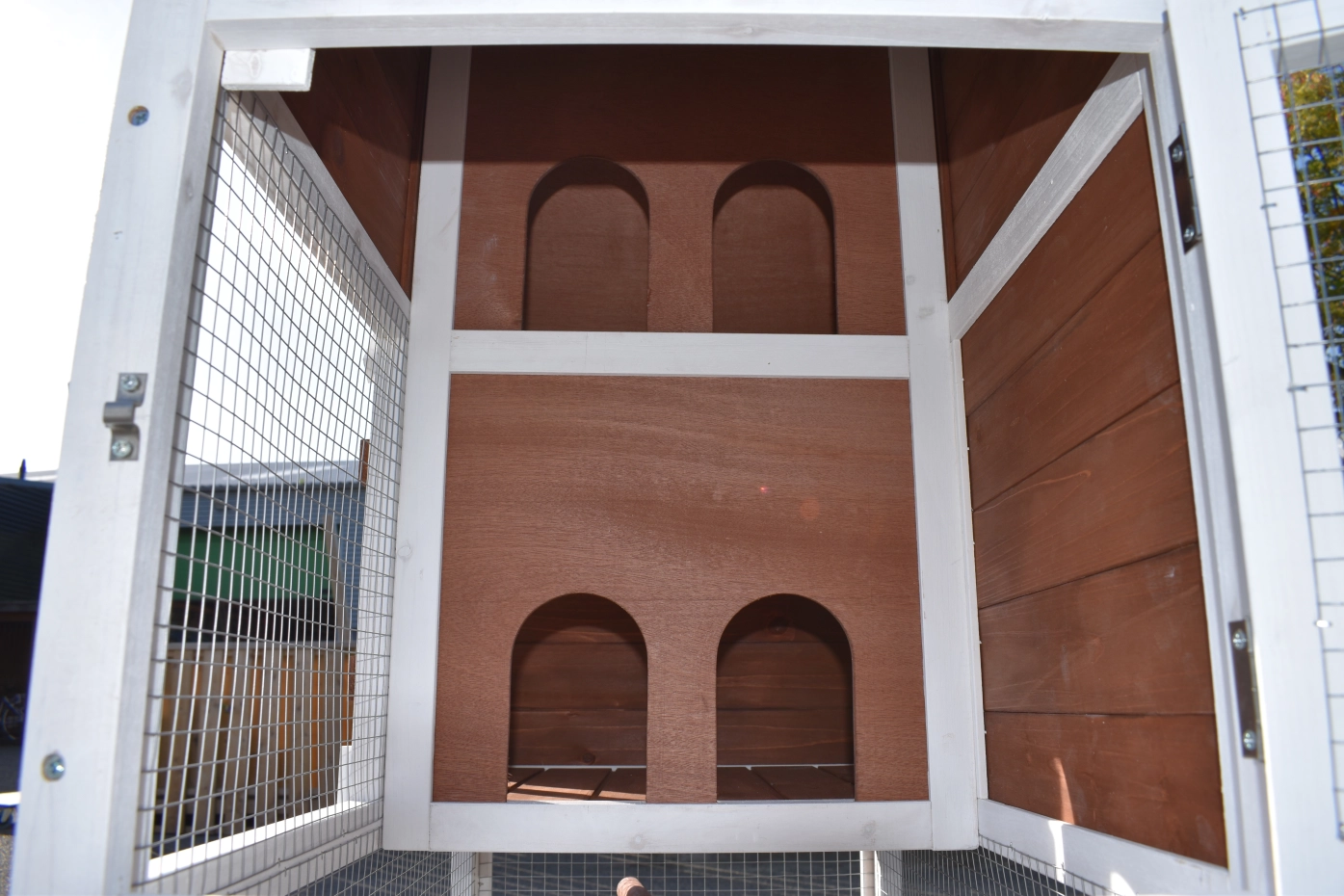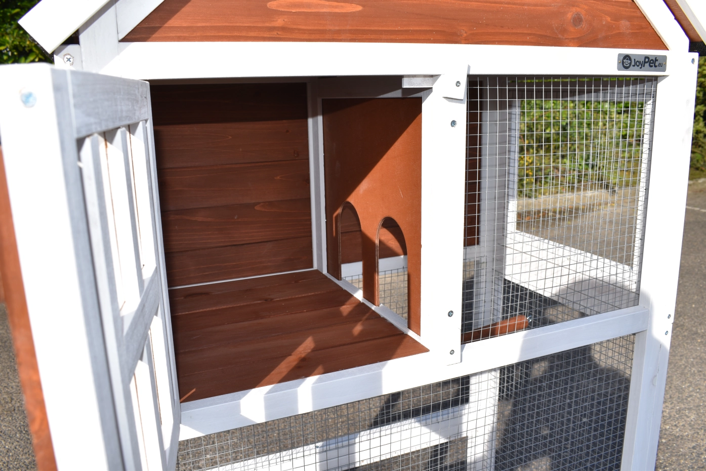 The wood, used for your pet house is a unique natural product which has been processed according to traditional methods in the country of origin, after careful selection. It is characteristic and unique in every way. This wood product has been manually processed. No single piece of wood is the same in shape, structure or color, so color shades are inevitable even within one piece of wood. Wind cracks, imperfections and the presence of large and small knots testify to their origin and years of growth. Bumps are usually manually updated with wood fill. Through use and through the influence of light, new pet houses will finally get a warmer color. Color differences in comparison with the show model or even among themselves are therefore usual. The pet house is stained in the colors as in the picture. You should do it once again to prevent mold and rot. You can easily order the stain together with the pet house.