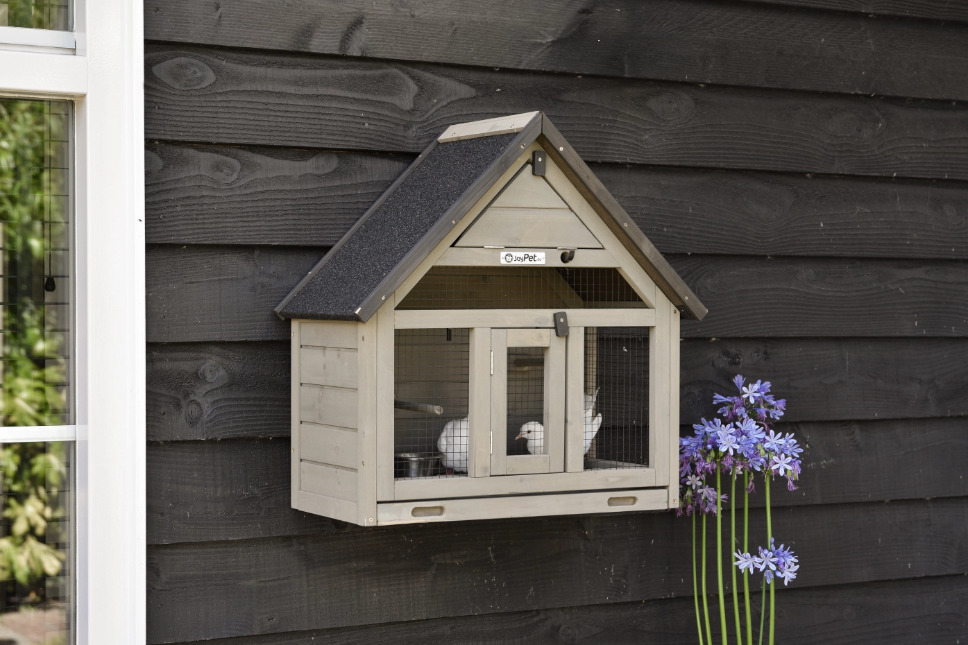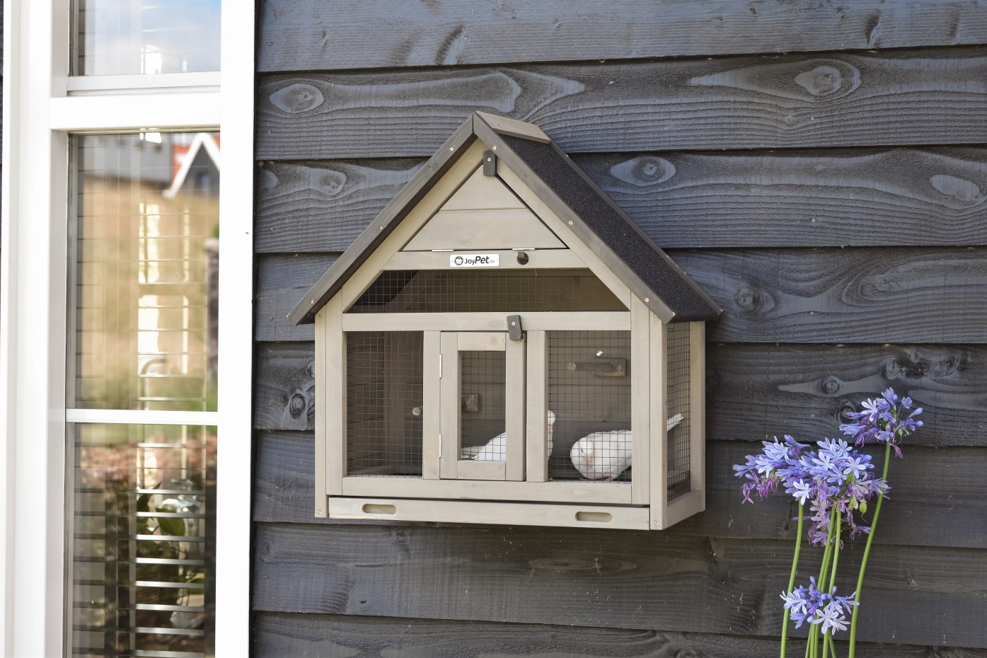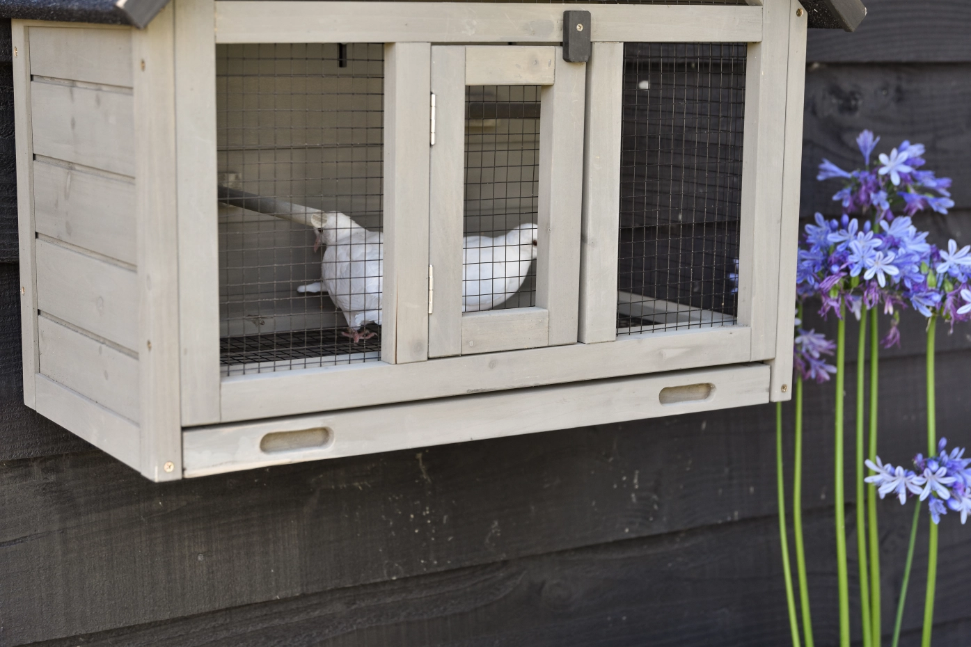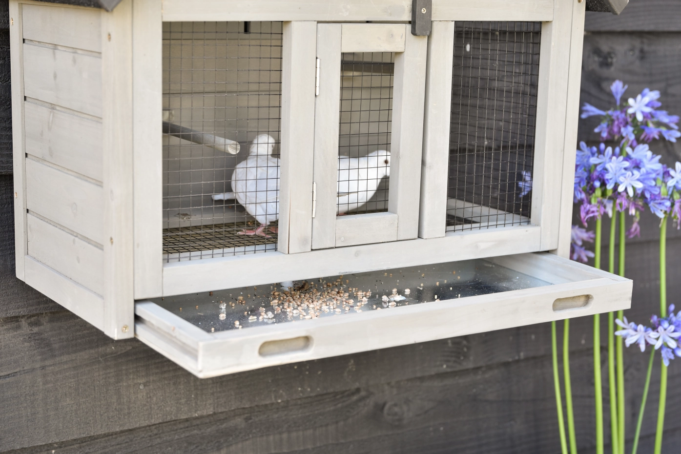Wall Aviary Matty Small is ideal for 2 small birds. The convenient sliding tray with mesh panel above keeps your birds safe during cleaning. The sleeping area can be closed, 3 perches are included, and the aviary is easy to hang on the wall using the supplied hooks.