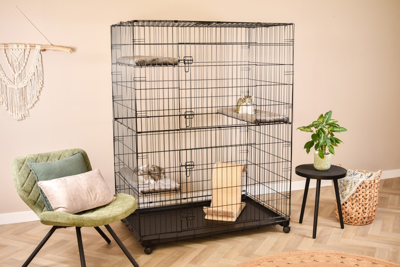 The nice cat cage Lift is suitable for indoor use. The ideal way to 'store' your kittens safely for a while, and to make sure that they can not escape. The size of the lower door is 57x53cm. The size of the upper door is 28x53cm. Cage Lift is also suitable for grown cats. The cage has 3 platforms, which you can put at different heights.