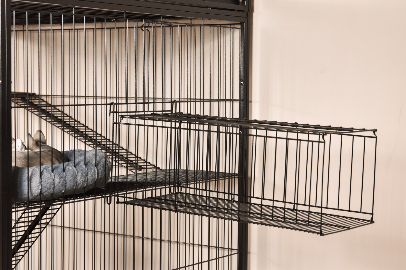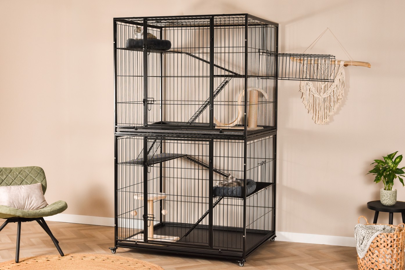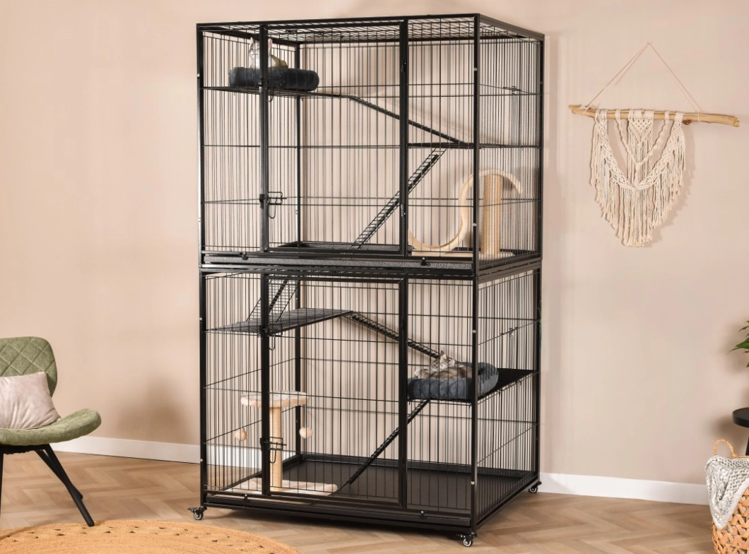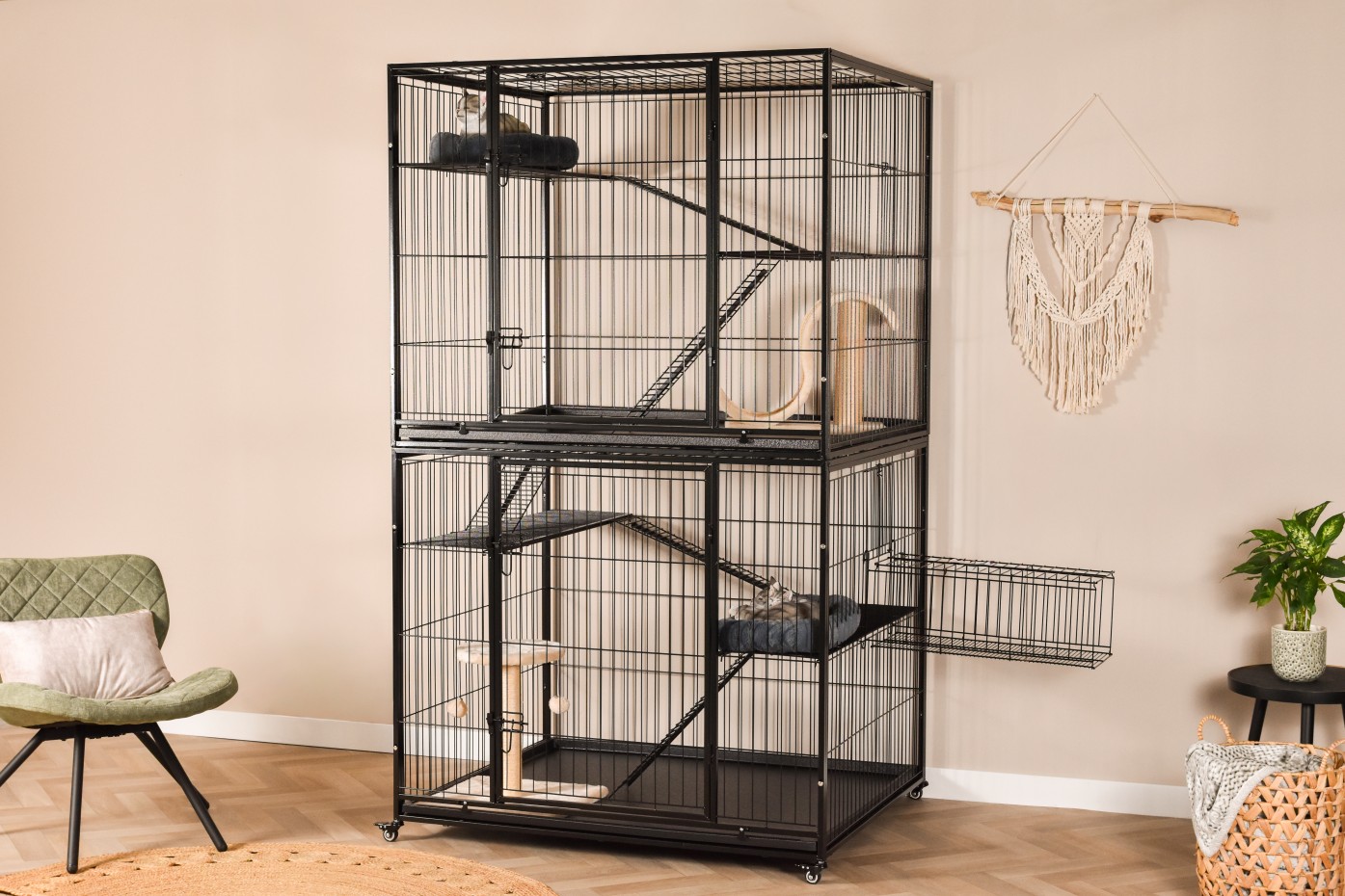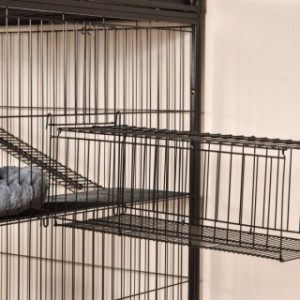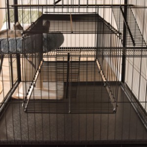Cat Cage Nivo is a large indoor cage, suitable for indoor use, or under the porch. The cat cage has 2 floors which are connected by platforms and gangways. The opening between the two floors is lockable. This allows the two floors to be used separately from each other.