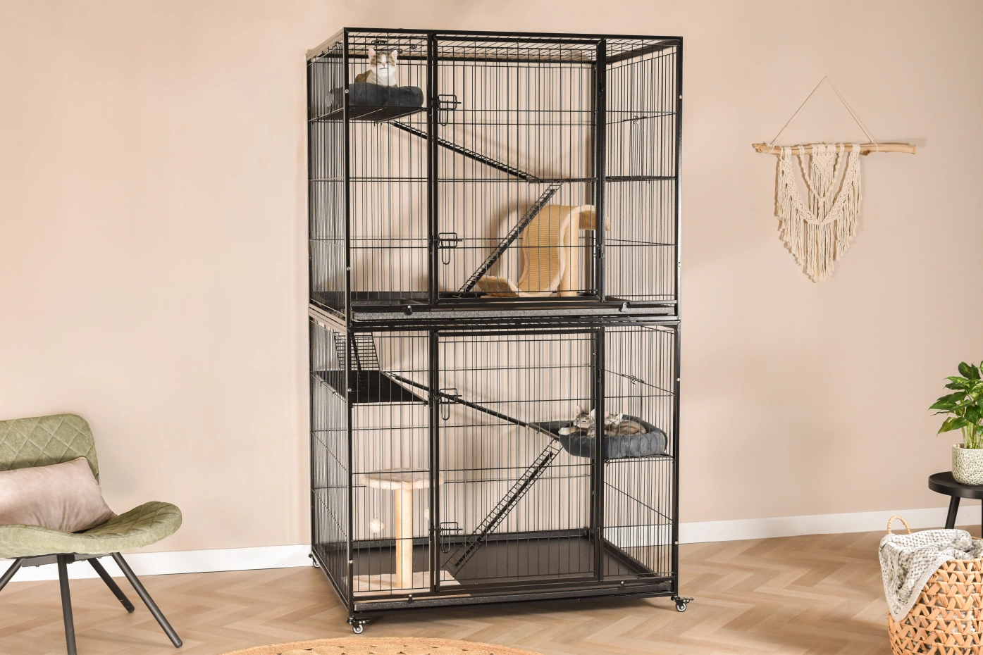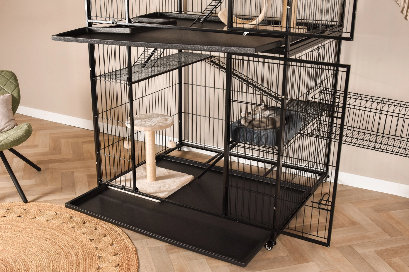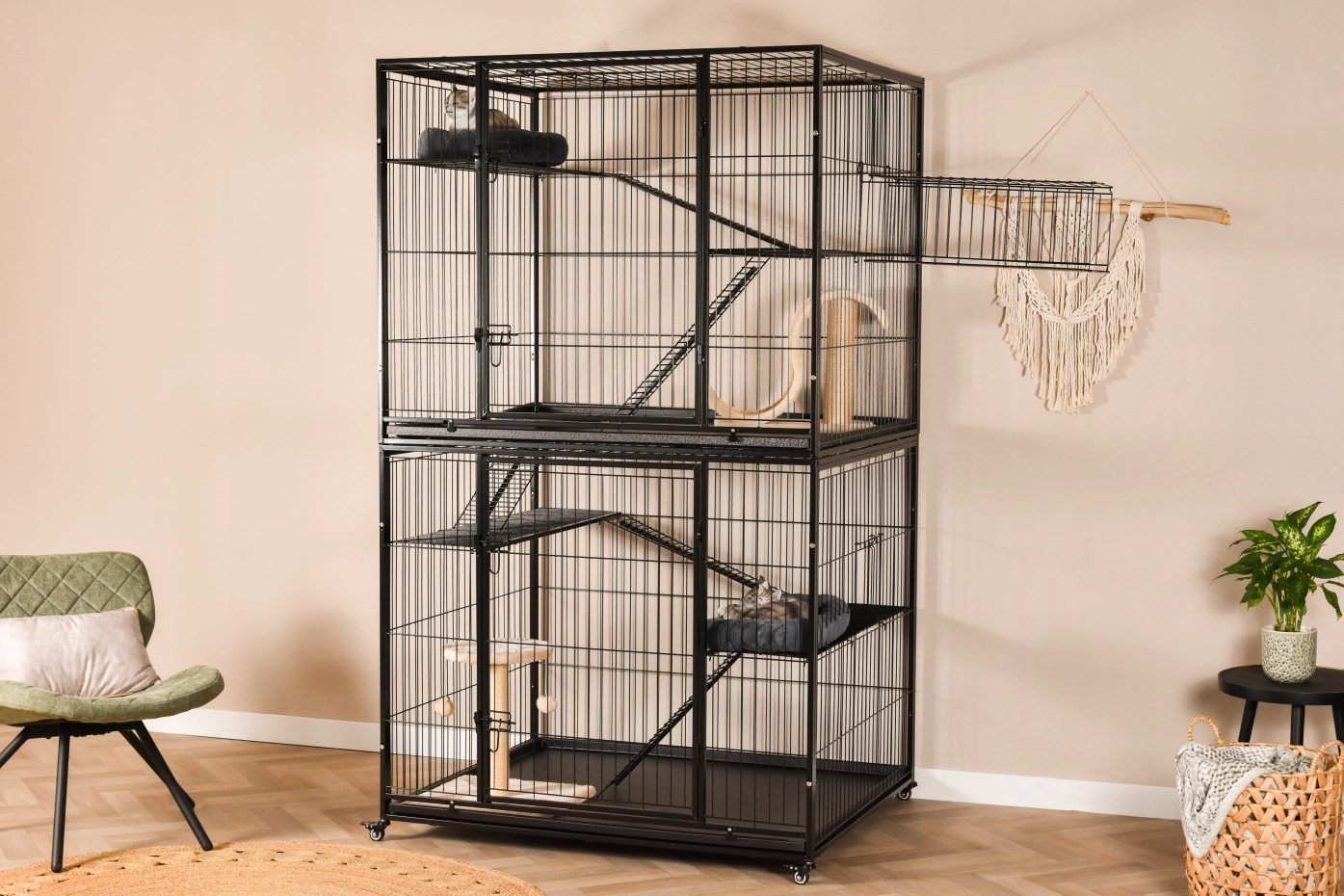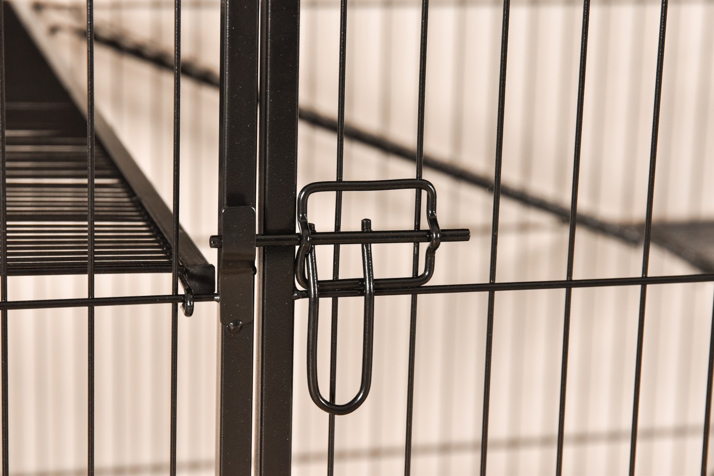 Cat Cage Nivo is a large indoor cage, suitable for indoor use, or under the porch. The cat cage has 2 floors which are connected by platforms and gangways. The opening between the two floors is lockable. This allows the two floors to be used separately from each other.