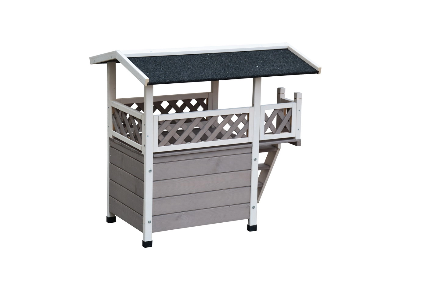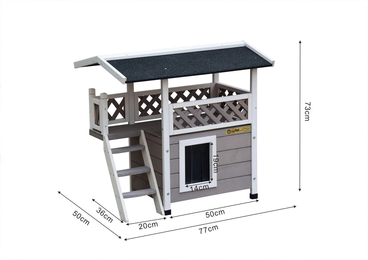 Cat house Claire is a nice hutch with 2 floors. On the floor is a sleeping compartment. On the 2nd floor can your cat relax in the sun. This hutch has a roof, so your cat has also a shelter.
