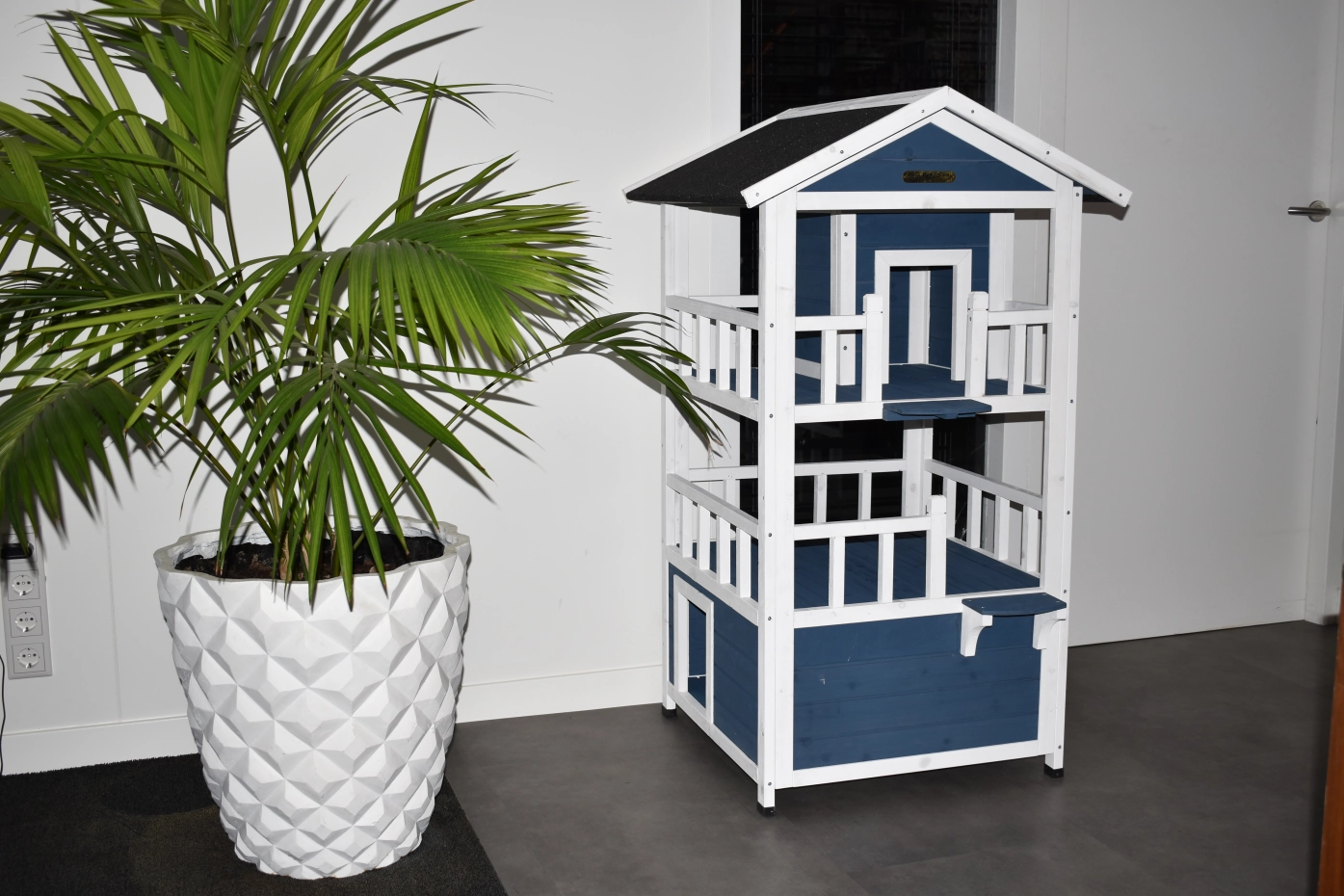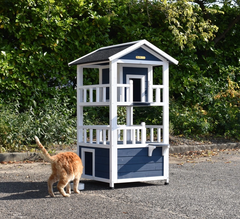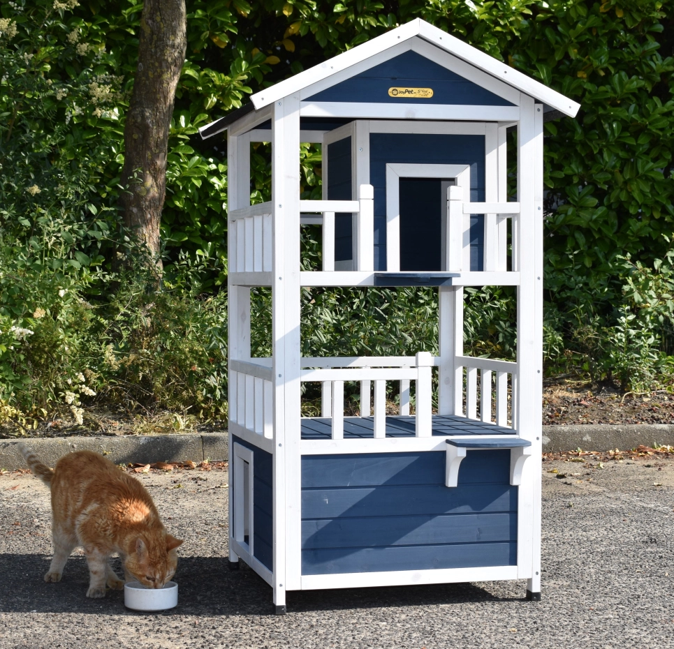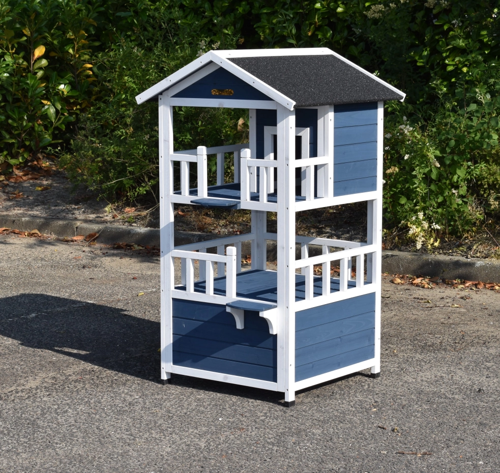 Cat house Kitty is a fun cat house with 3 floors, offering extra challenge for your cat. Very nice to place inside or outside! The coop has fun colours, namely blue and white. The floors have a white balustrade, giving the house a luxurious look!