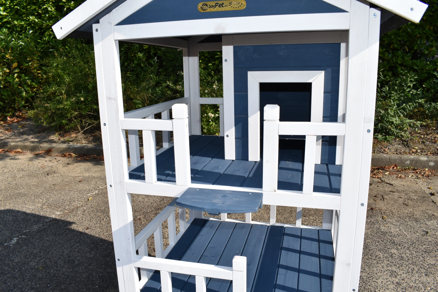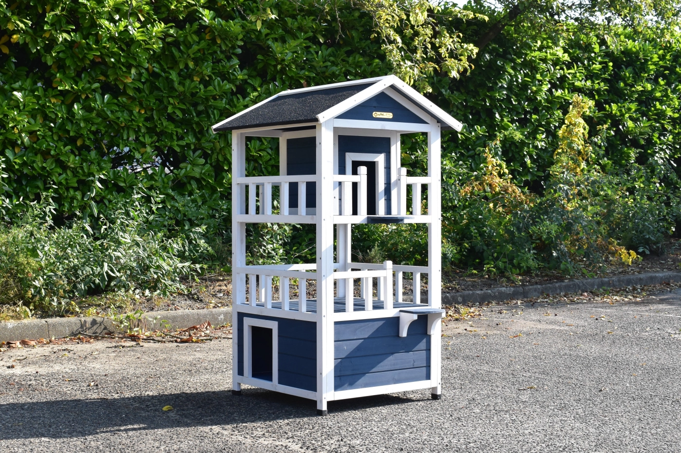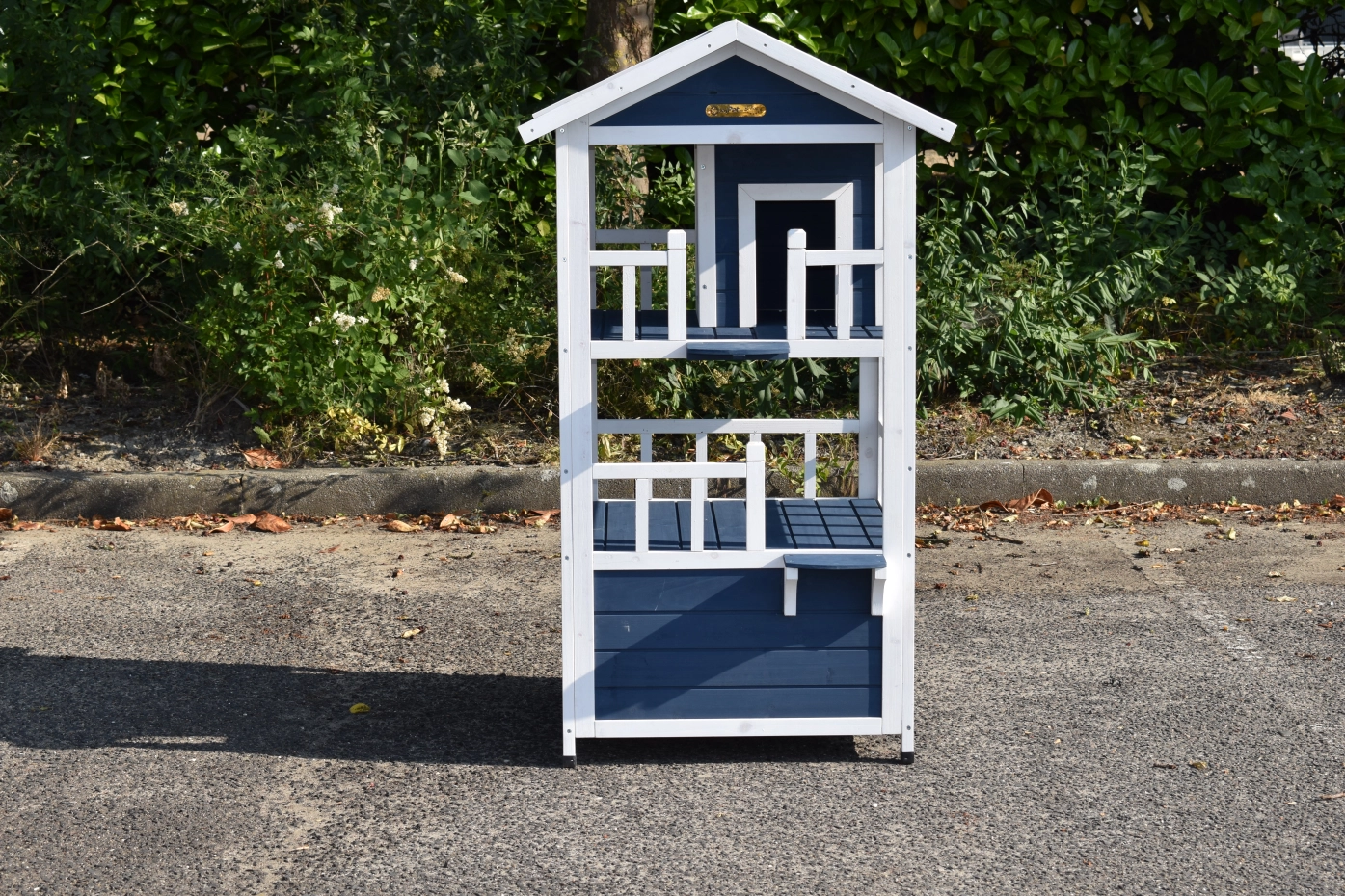 Cat house Kitty is a fun cat house with 3 floors, offering extra challenge for your cat. Very nice to place inside or outside! The coop has fun colours, namely blue and white. The floors have a white balustrade, giving the house a luxurious look!