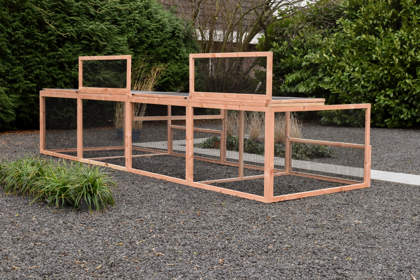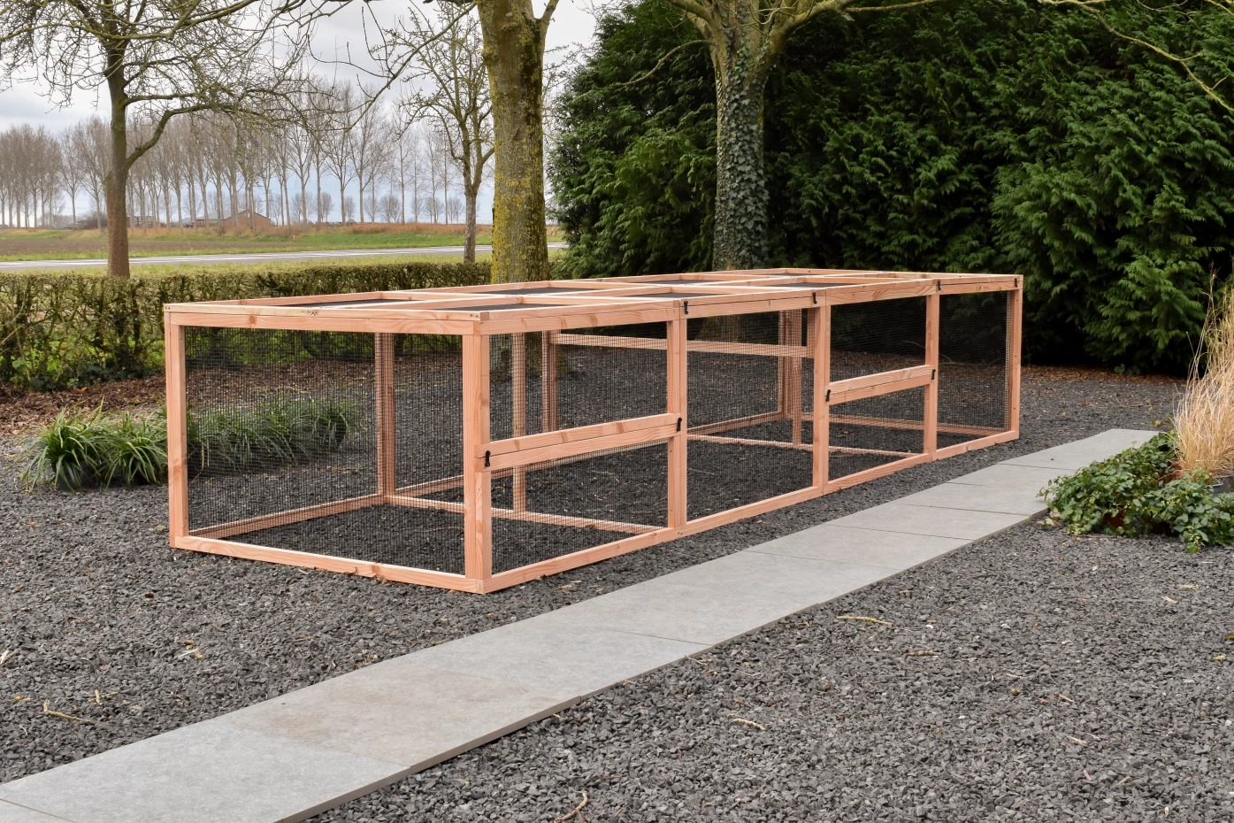 Run Eggy is a separate run without a sleeping area, perfectly suitable for chickens, rabbits, and even cats. This spacious run offers plenty of room for movement and features 4 foldable roof panels, making it easy to access for thorough cleaning. A practical and roomy solution for your animals!