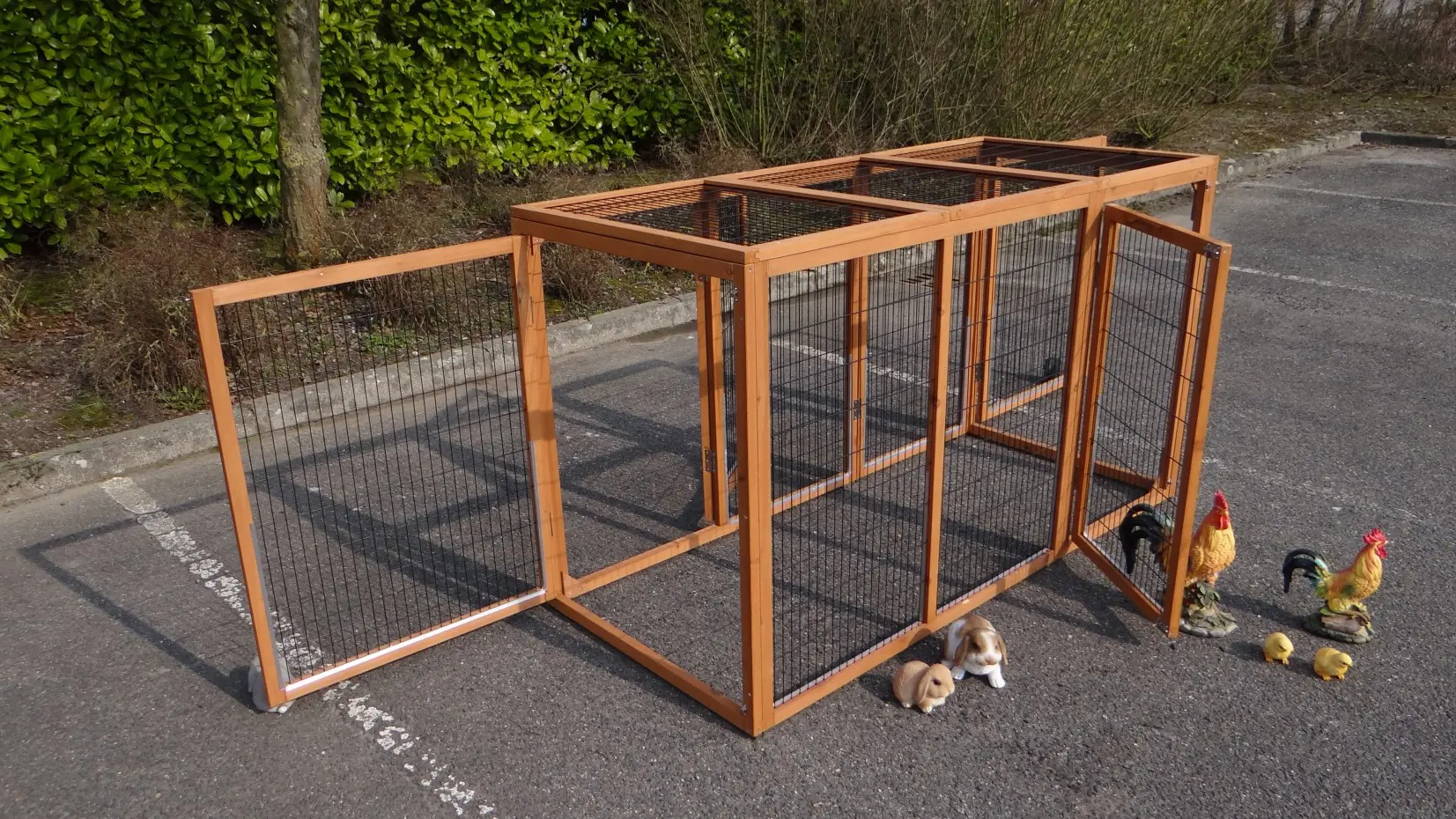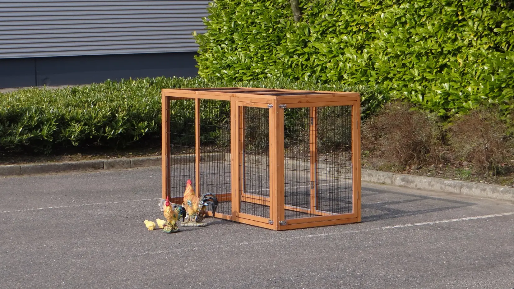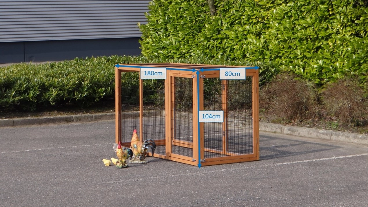 The versatile Functional animal enclosure can easily be attached to your existing rabbit hutch or chicken coop, or used independently, for example, as a cat enclosure. This multifunctional pen has 4 doors: one on each side. You can also effortlessly combine multiple of these enclosures. The Functional cat enclosure is stained once. Stain for this cat enclosure is optionally available. The enclosure is equipped with a wire roof.