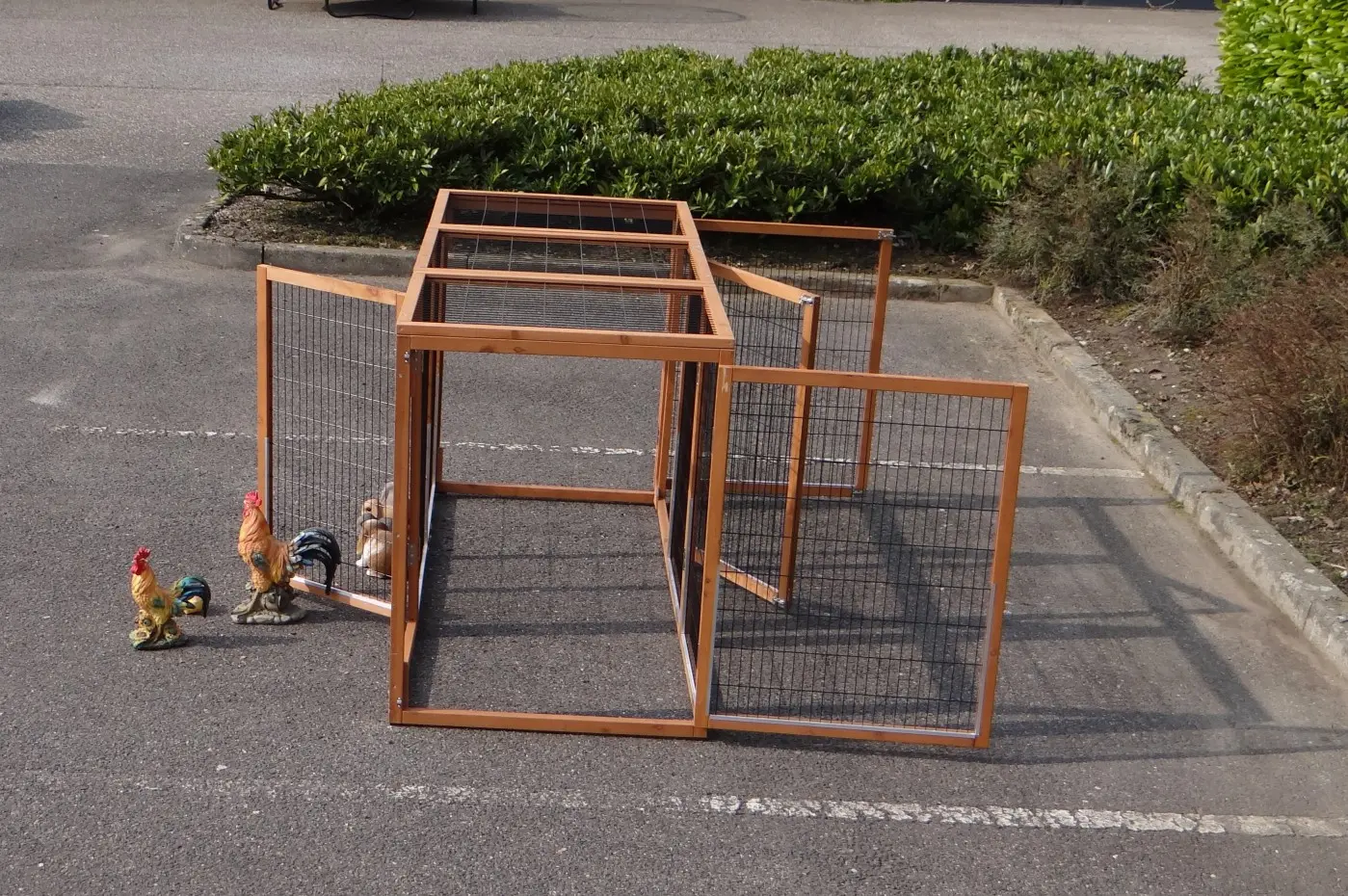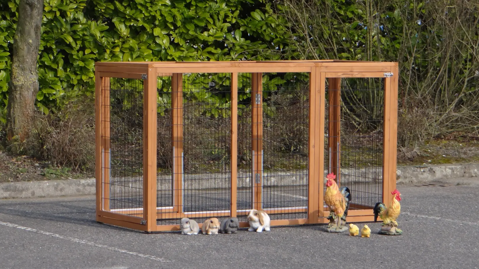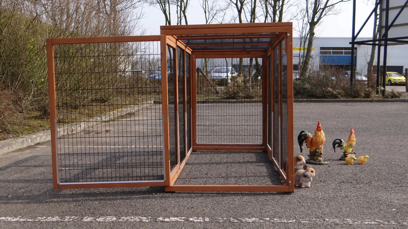 The versatile Functional animal enclosure can easily be attached to your existing rabbit hutch or chicken coop, or used independently, for example, as a cat enclosure. This multifunctional pen has 4 doors: one on each side. You can also effortlessly combine multiple of these enclosures. The Functional cat enclosure is stained once. Stain for this cat enclosure is optionally available. The enclosure is equipped with a wire roof.