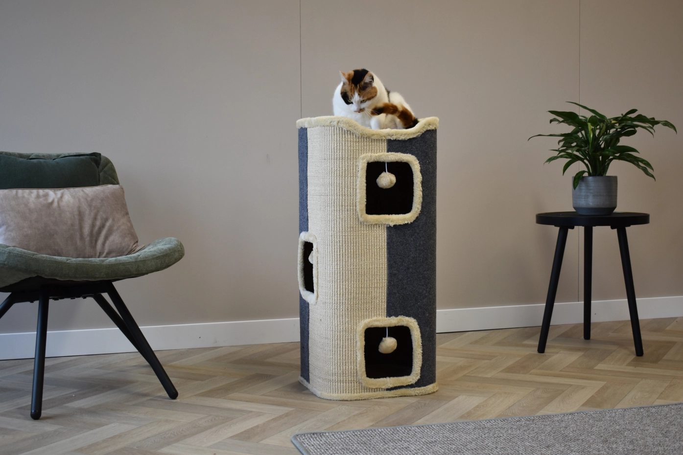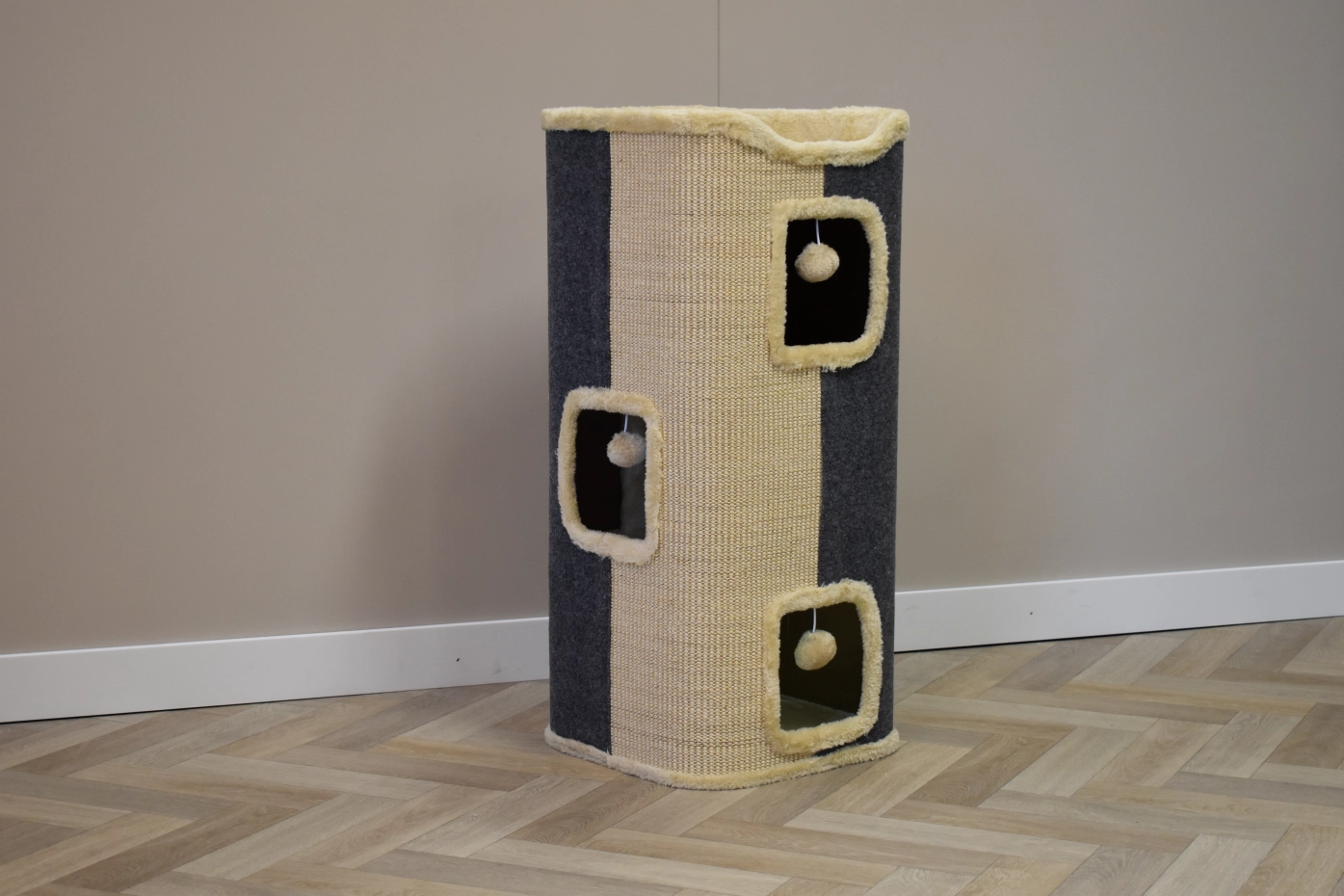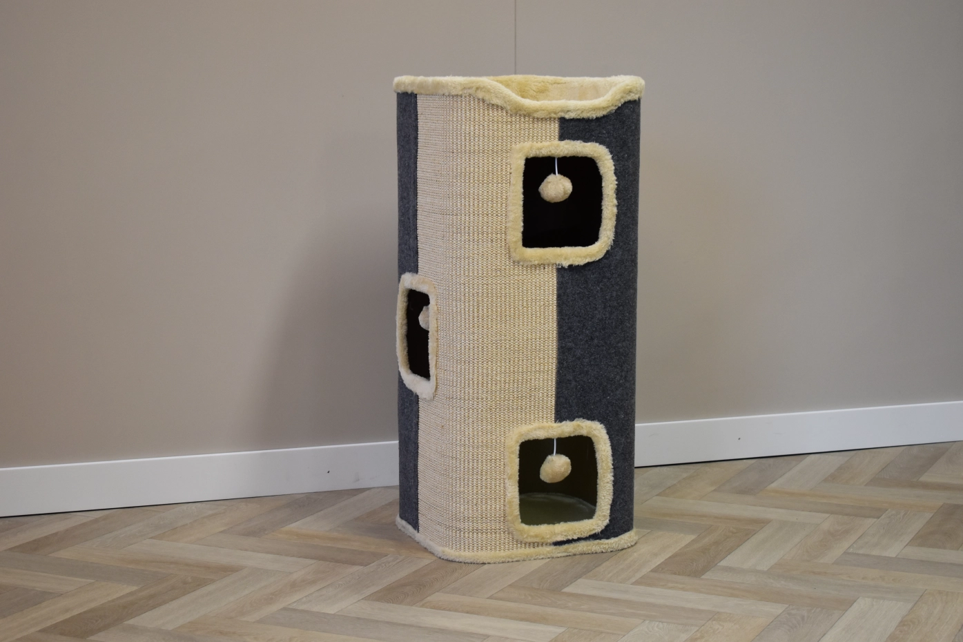 The scratching barrel Kadee has 3 little houses and on top a lying platform. The barrel has a sisal-part, so that your cat has many possiblities for scratching. The barrel is suitable for small till medium sized cats.