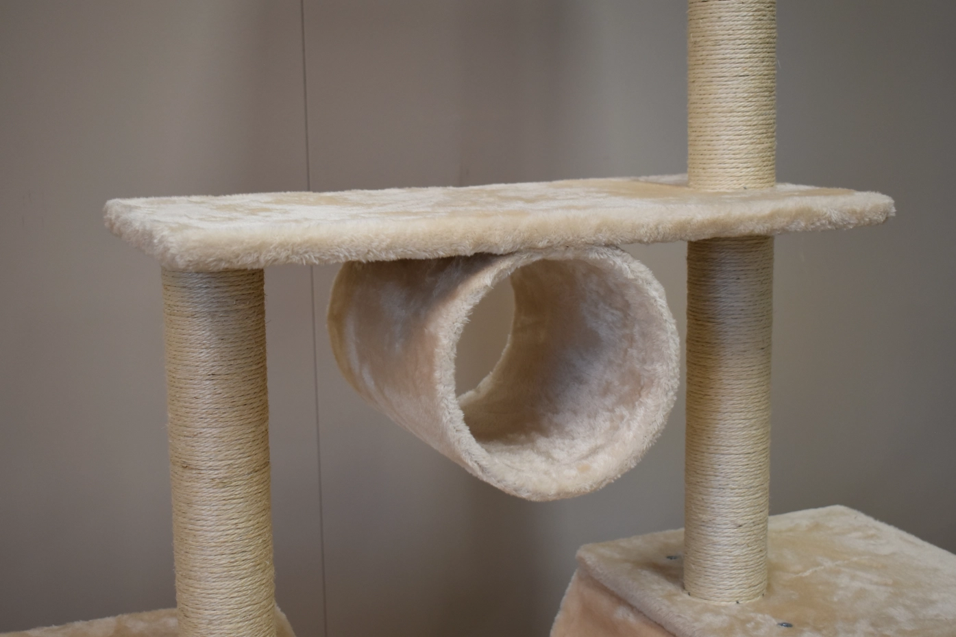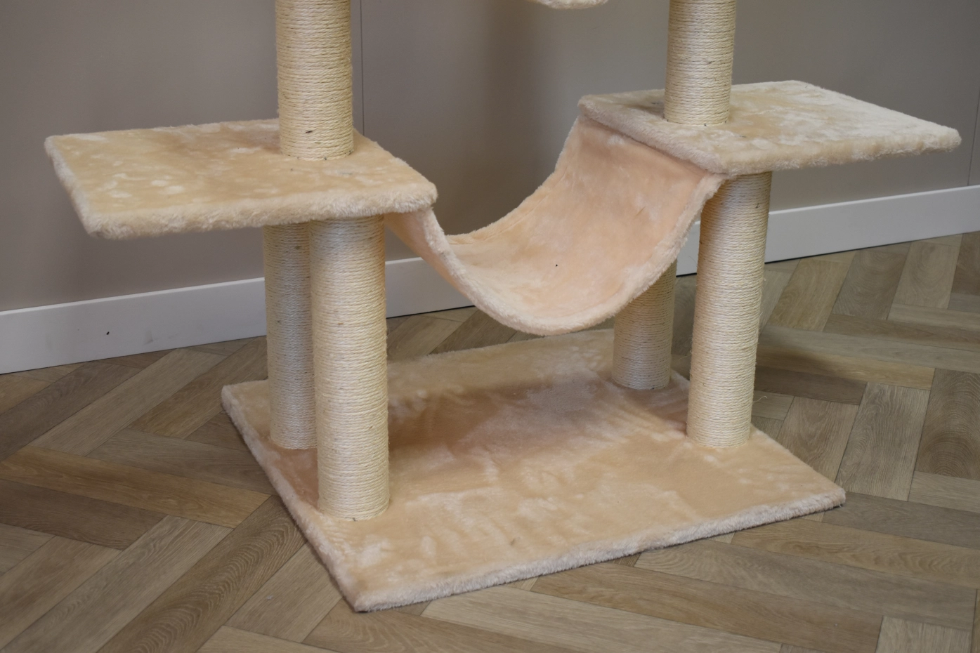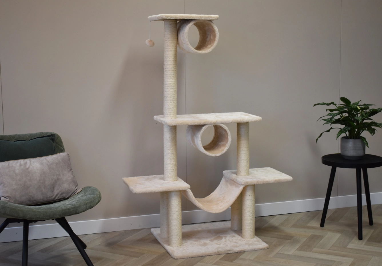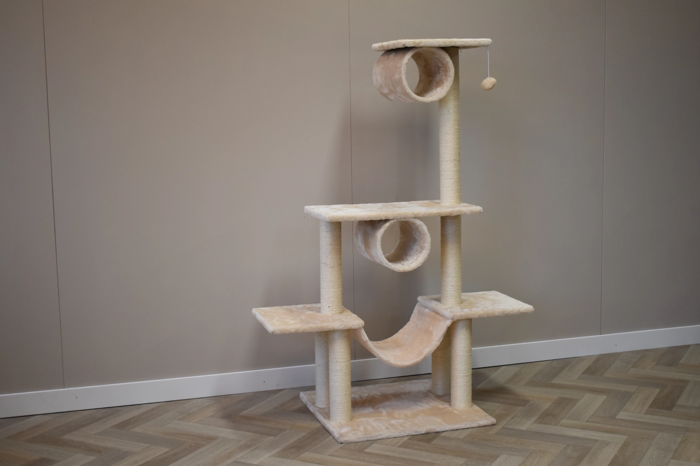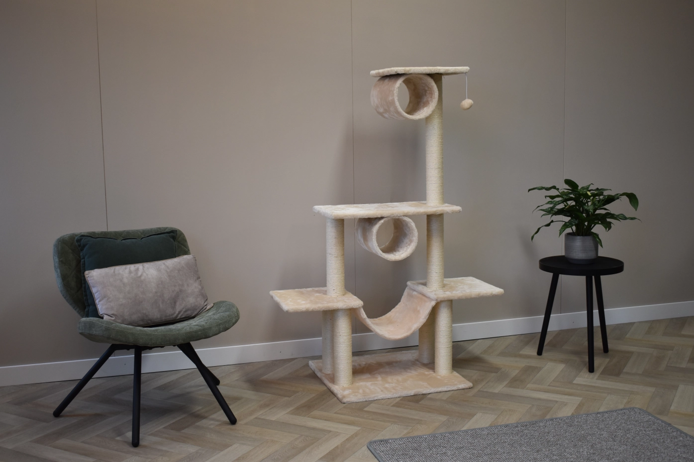 The scratching post Katinka provides a lot of fun for your cats! The scratching post has multiple lying platforms, sisal poles, a hammock and 2 tunnels. This scratching post is suitable for little till medium sized cats.