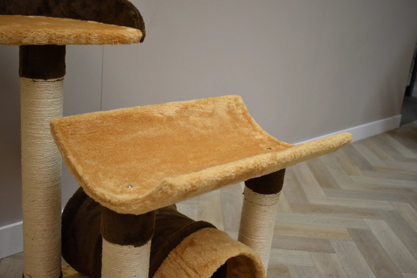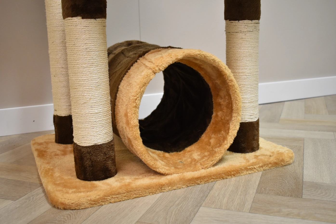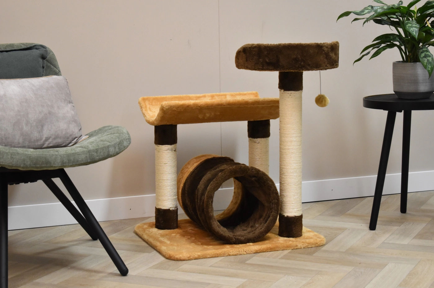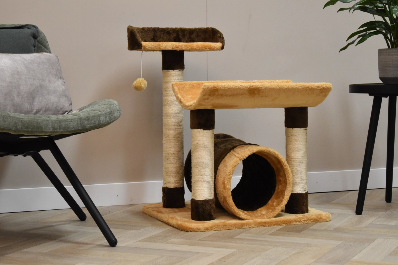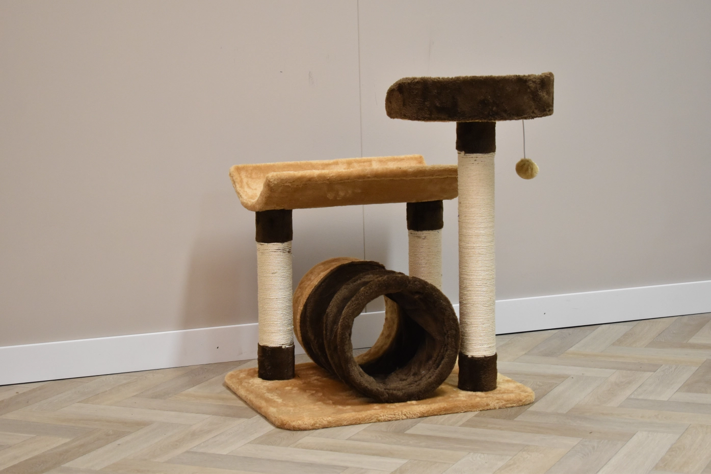 The scratching post Kimo has 2 lying platforms, sisal scratching poles and a tube, so that your cat can play hide and seek. The scratching post is beige with brown, so it is a nice acquisition for your yard. The scratching post is suitable for little till medium sized cats.