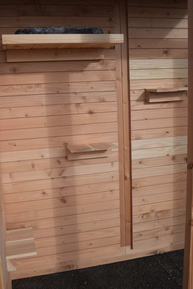 Cat Climbing Boards and Resting Platform Made of Douglas Fir Wood. This elegant set offers plenty of fun and challenges for your cats, tomcats, or kittens. The set includes 3 climbing boards and 1 resting platform with a cushion. The smaller climbing boards measure approximately 29 x 15 cm, while the larger resting platform is 61 x 32 cm.