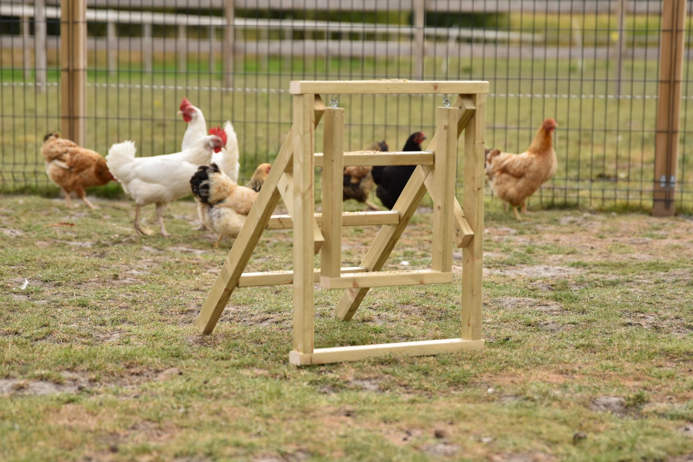 The chicken ladder is an ideal chicken play equipment for the run. Thanks to the flat steps, chickens can use the ladder not only for climbing but also as stable perches. Attached to the ladder is a swing for extra fun. You can also order a chicken sandpit so the chickens can enjoy dust bathing and scratching. This chicken ladder provides exercise, fun and relaxation in the run.