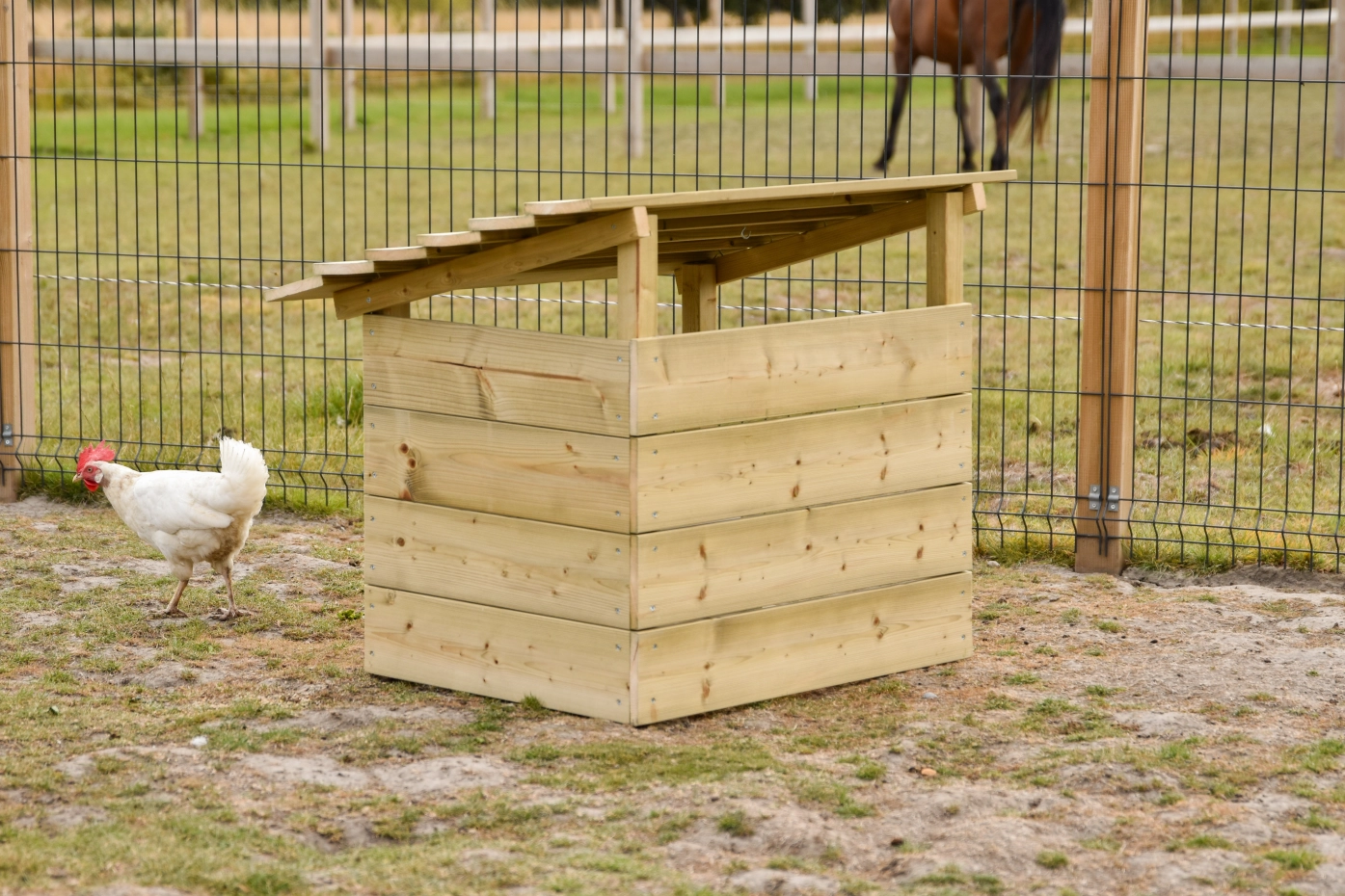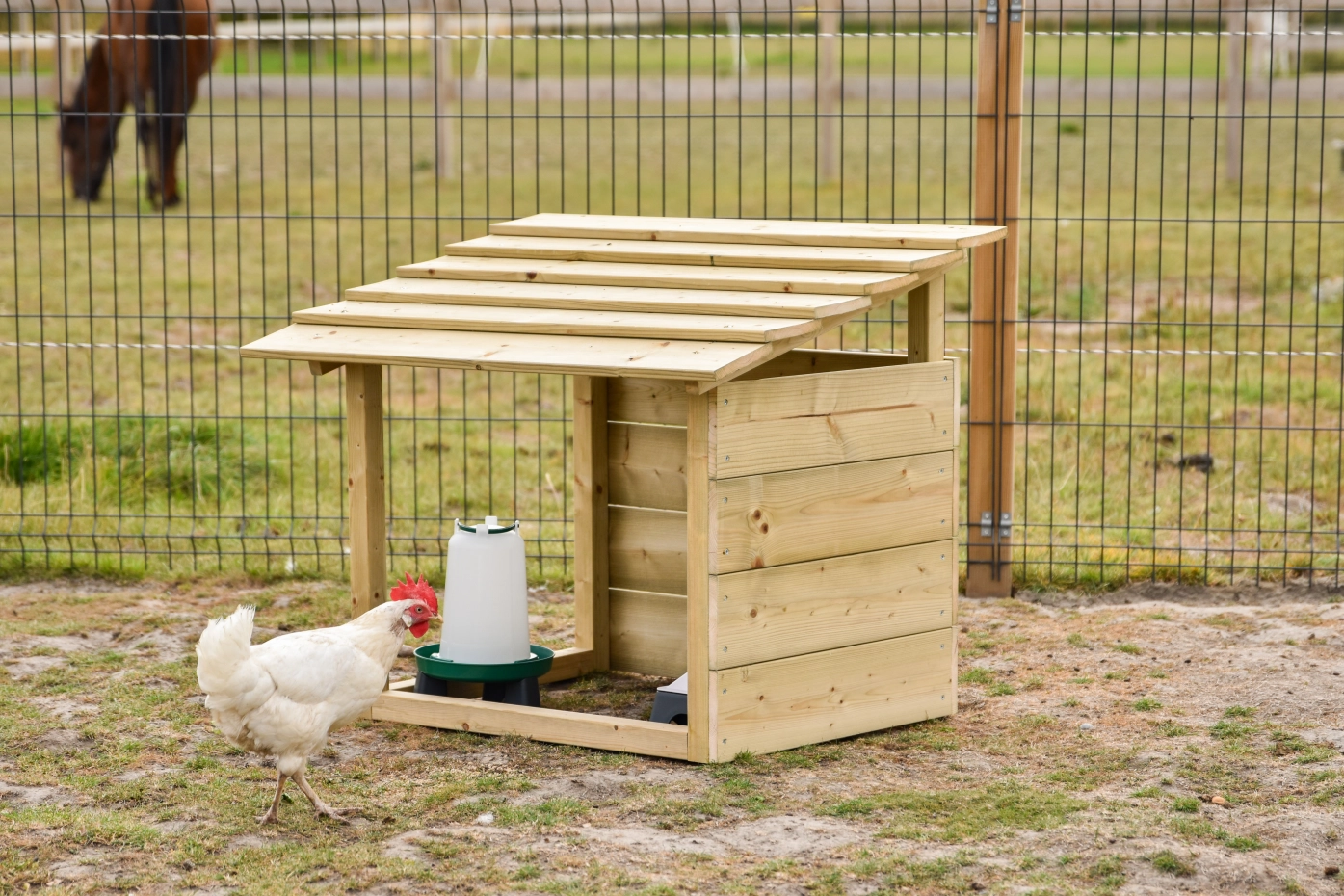 The chicken shelter provides a quiet spot where your chickens can eat and drink. They can also take cover there during rain or windy weather. The shelter can easily be combined with the chicken play equipment, so the chickens can also play and stay active. Note: feeder and drinker are not included but can be ordered separately.
