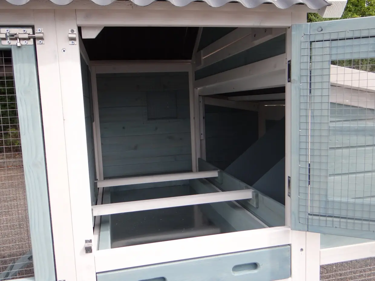 For easy cleaning, a convenient pull-out tray is located beneath the sleeping area. On the side, there is a nesting box that provides plenty of space for your hens to lay their eggs comfortably.