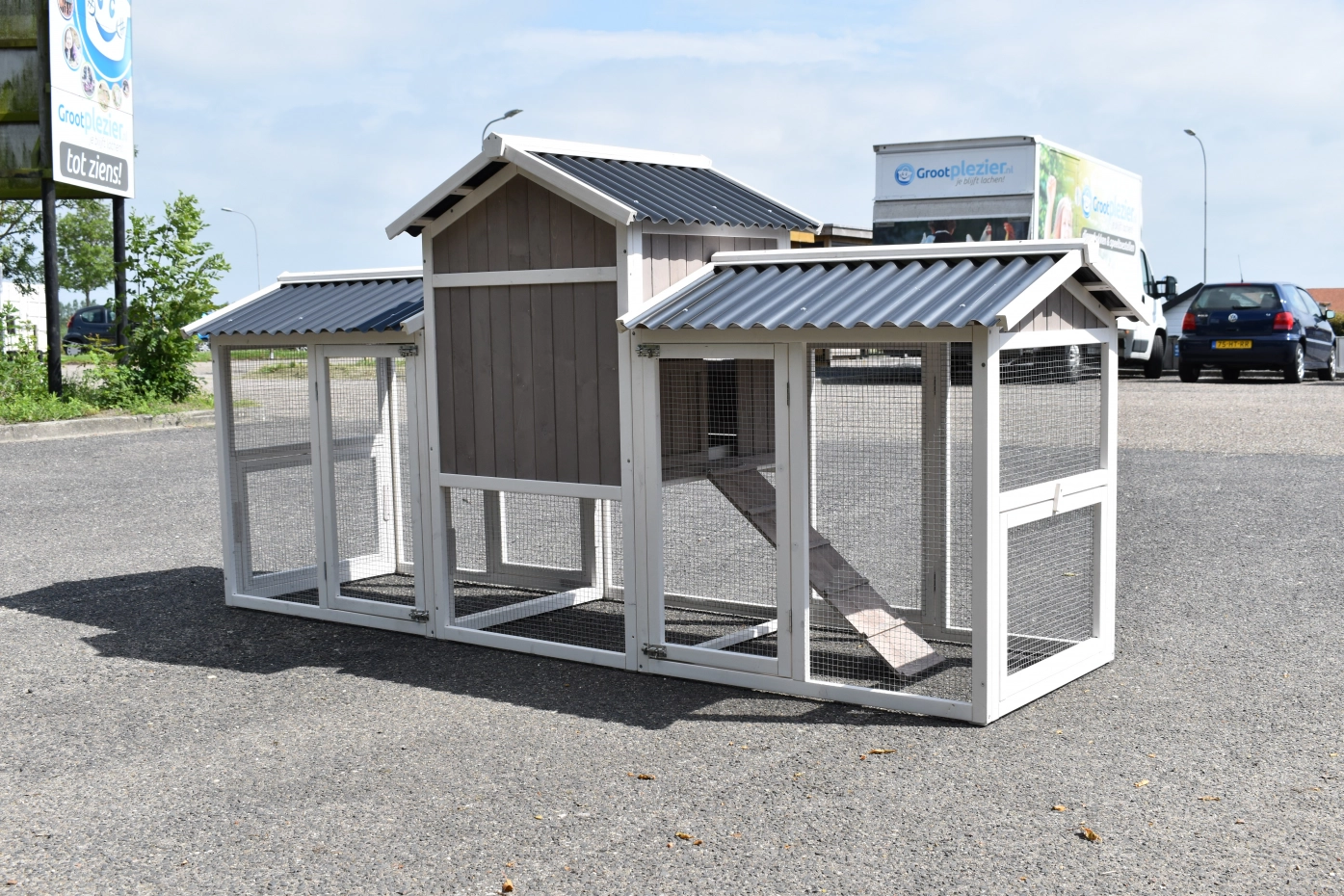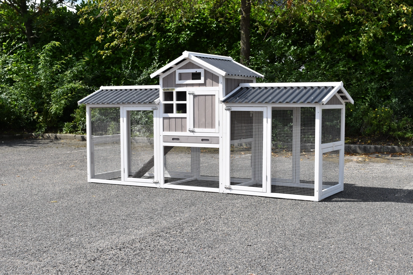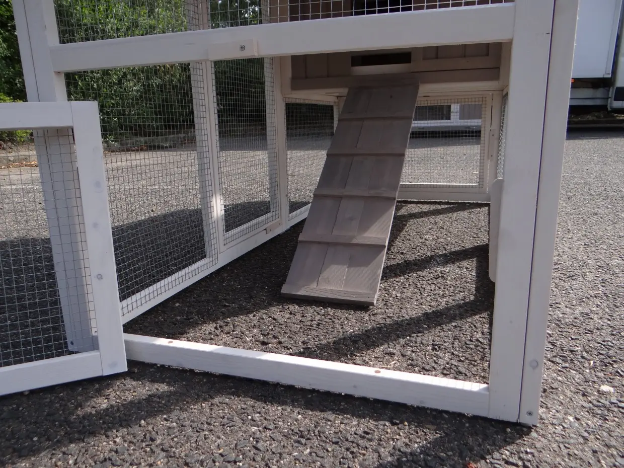 Chickencoop Jason is a nice hutch in the colours white/taupe. This chickencoop will be delivered with 2 runs Jason. The chickencoop and both runs have a plastic roof. The beautiful hutch is suitable for 3 à 4 chickens.