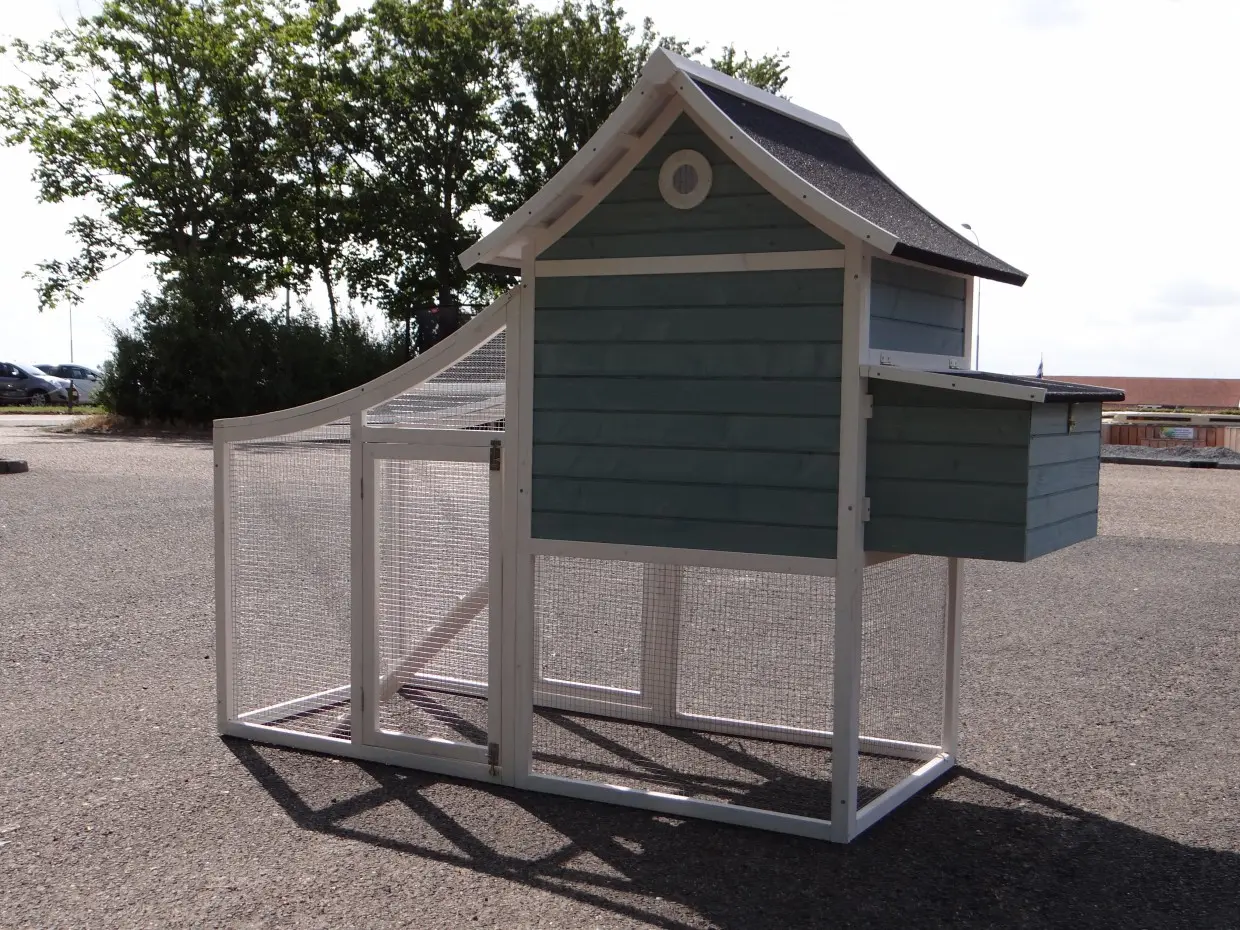 This Nijntje chicken coop has a distinctive shape, making it very popular. The nesting box makes collecting eggs very easy. The coop is equipped with a pull-out tray for easy cleaning. The Nijntje coop features one large perch measuring 70 cm. The sleeping area is suitable for 4 medium-sized chickens.