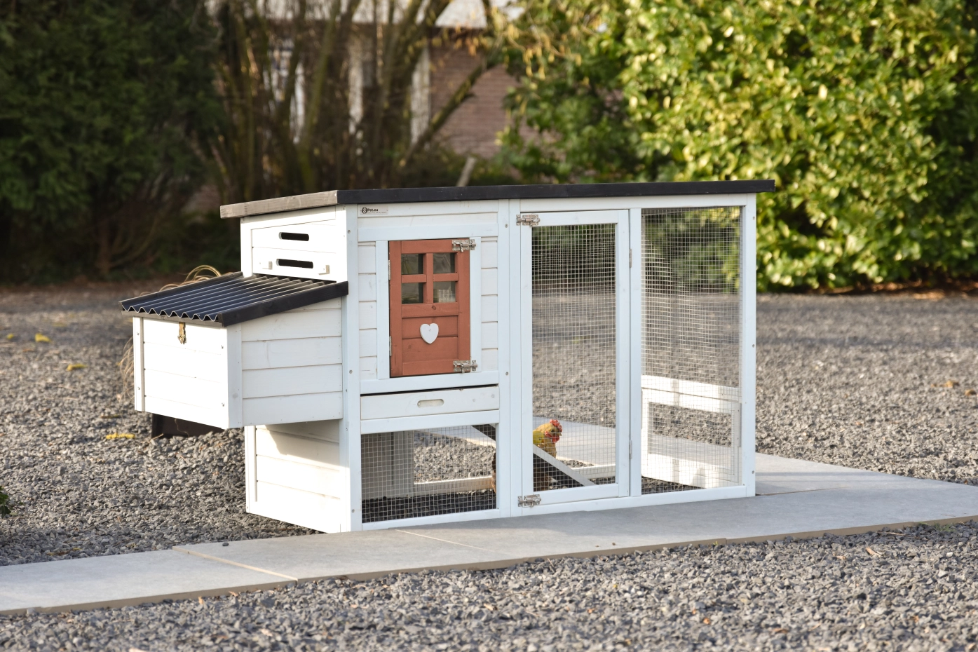 Chicken coop Noah is a very affordable and nicely designed chicken coop with nesting box, night shelter and run. Chicken coop Noah is equipped with spacious doors and a practical pull-out tray in the night shelter, making cleaning easy. Noah is a compact and practical chicken coop, suitable for 2 to 3 chickens. The maximum dimensions, including roof and nesting box, are 168 × 65 × 87 cm