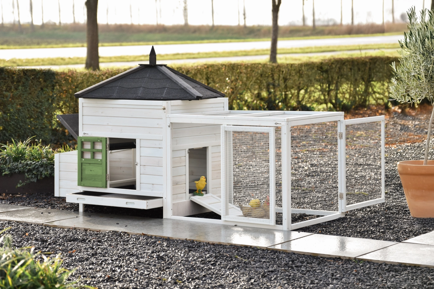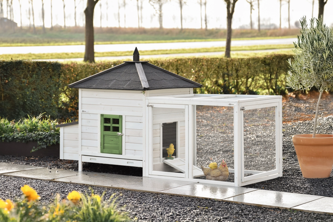 This splendid chickencoop Ambiance Large is impeccably finished down to the last detail! It features a convenient, extendable droppings tray and a removable roof. The hutch for your chickens Ambiance Large boasts beautiful and practical details, along with a useful run that can be endlessly expanded. This module can be fitted into most gardens. The night coop is suitable for a maximum of 4-6 chickens, depending on breed size.